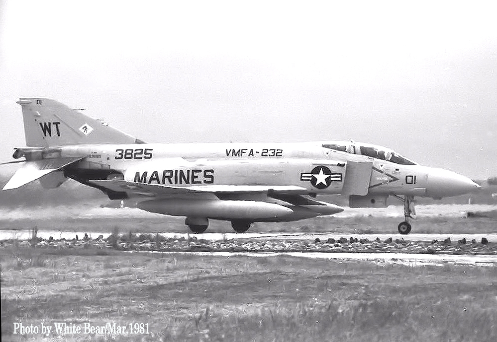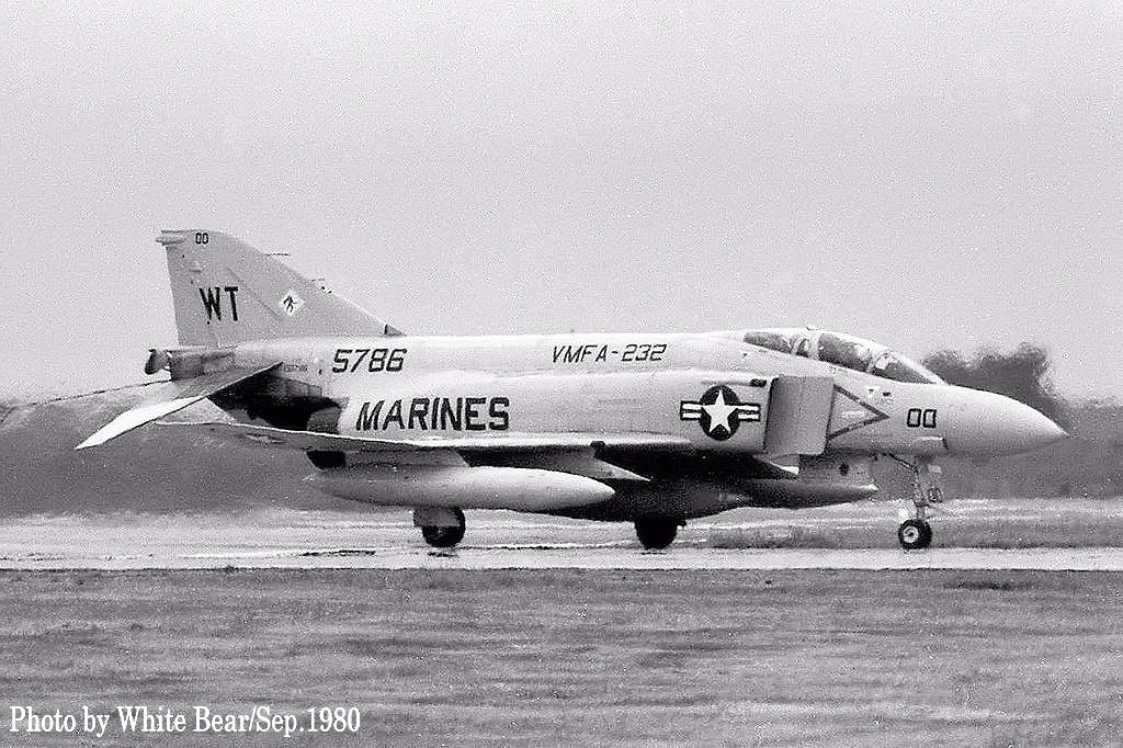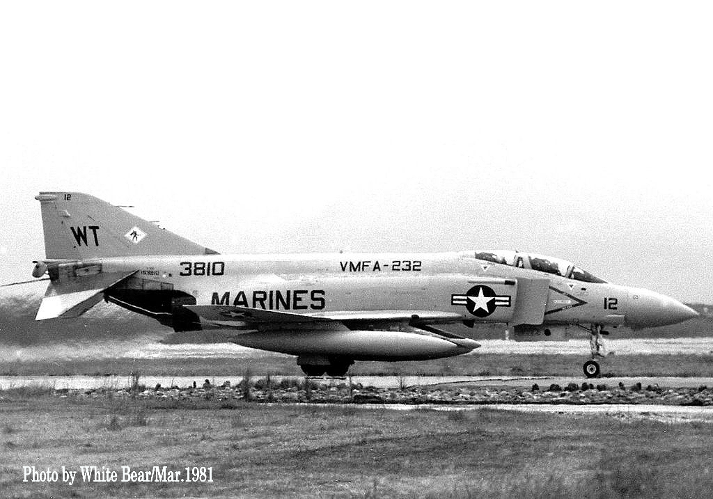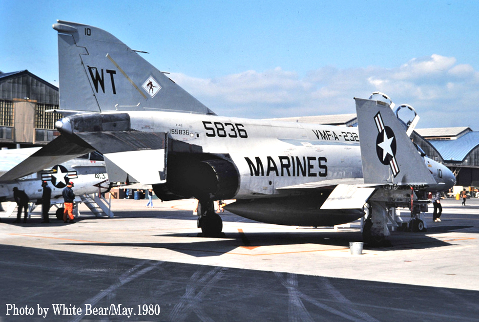 ↑ 1981年3月White Bearさんが嘉手納基地で撮影されたVMFA-232のF-4S。外見上のJ型との識別点は、胴体と尾翼に追加された編隊灯ぐらいである。1980~1981版マーキングはModexが黒で書かれていた。最初のS型は1978年6月にVMFA-451が受領し、それ以降海兵隊13個飛行隊に配備された。