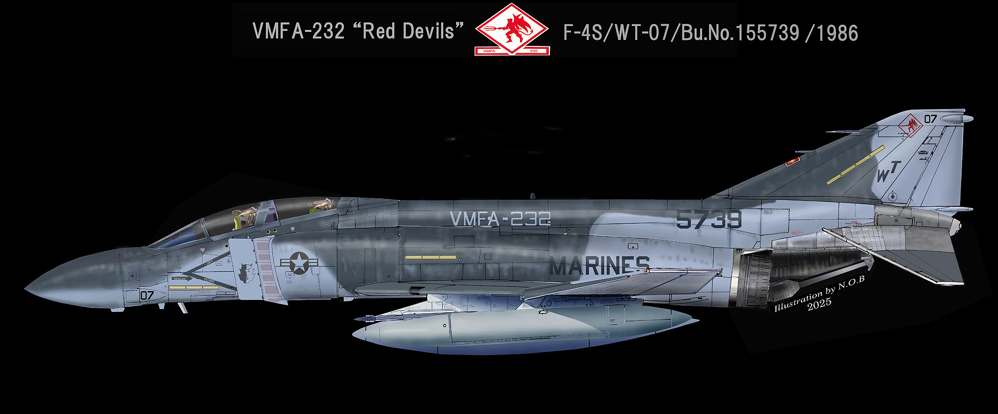 VMFA-232で永らく使われてきたF-4J型も、1980年代には徐々に姿を消し、岩国基地には寿命延長の改造とレーダーを強化したF-4Sが主流で派遣されるようになった。最初にS型を持ち込んだのはVMFA-212だったが、次がこのVMFA-232となる。同時に派手に塗られてきた赤いマーキングもトーンを落として、地味な出で立ちに変ってしまったのである。1980年以降 海兵隊に於いてはロービジ傾向が顕著に表れ始め、率先して低視認性を追求するようになっていく。