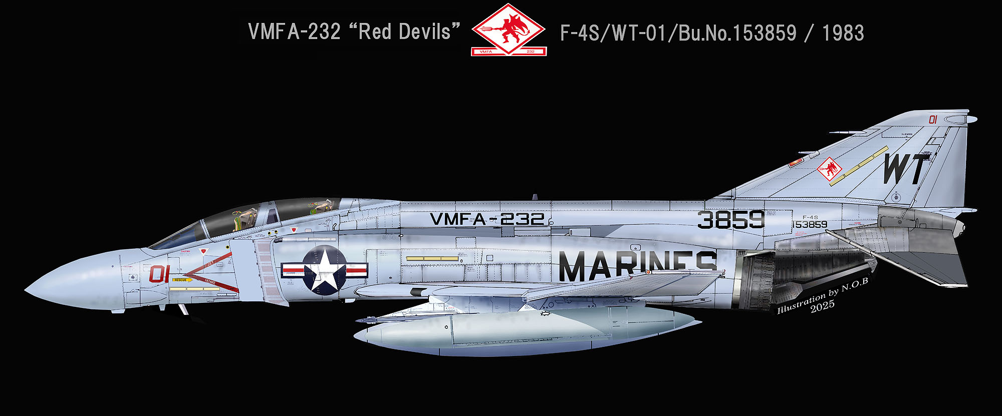 ↑ 1983年 F-4Sとして2度目の岩国展開した時のマーキングで、Modexが赤いのが特徴。F-4S/WT01/Bu.No.153859。本機は1977年当時F-4J/WT-6として嘉手納基地にも展開していた。