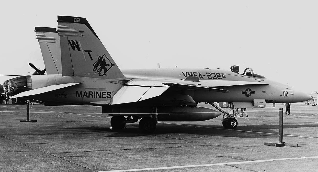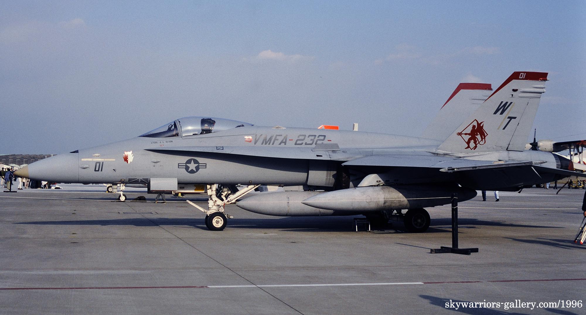 ↑ 1999年登場したフルカラーの司令官指定機 厚木のオープンハウスに他の3機と共の展示された。アメリカでその後撮影されたものは、中央のタンクにも悪魔の三又槍とVMFAの文字が書かれており、このタンクは後の機体にも継承された。VMFA-232 WT-01 Bu.No.163714