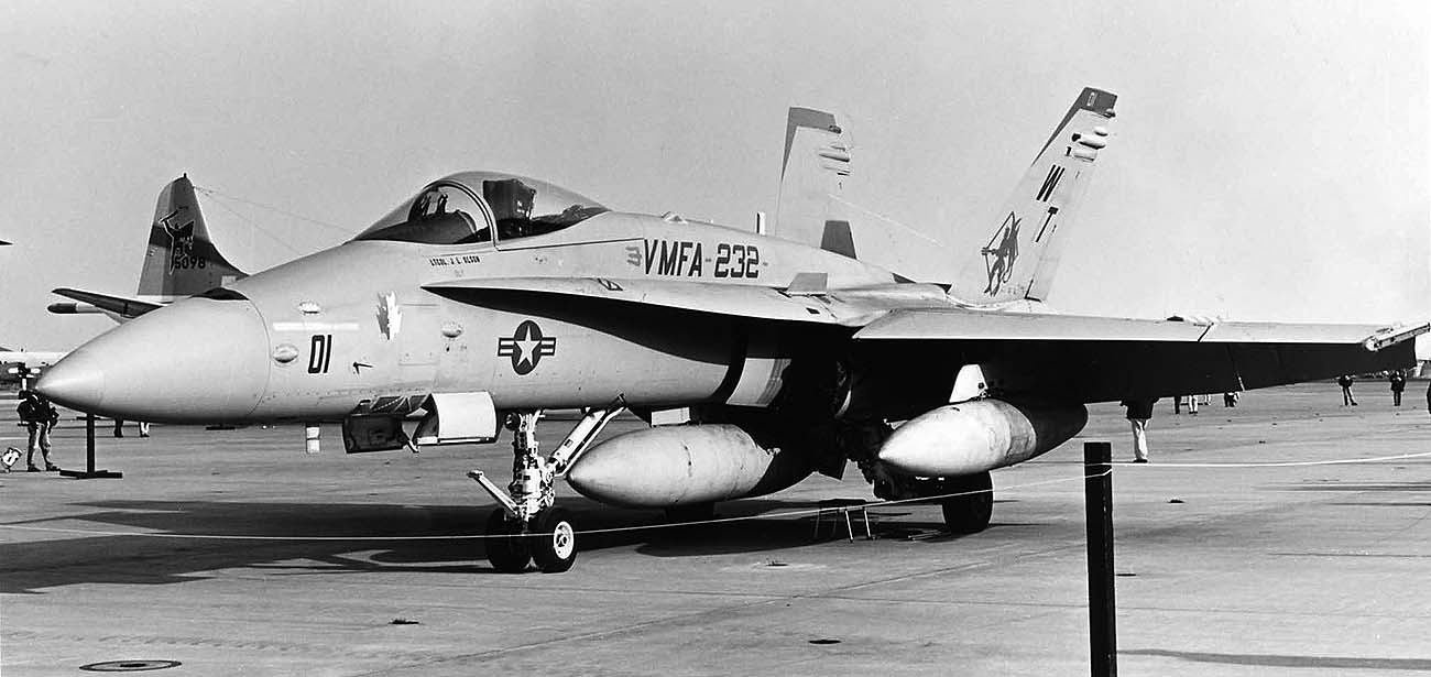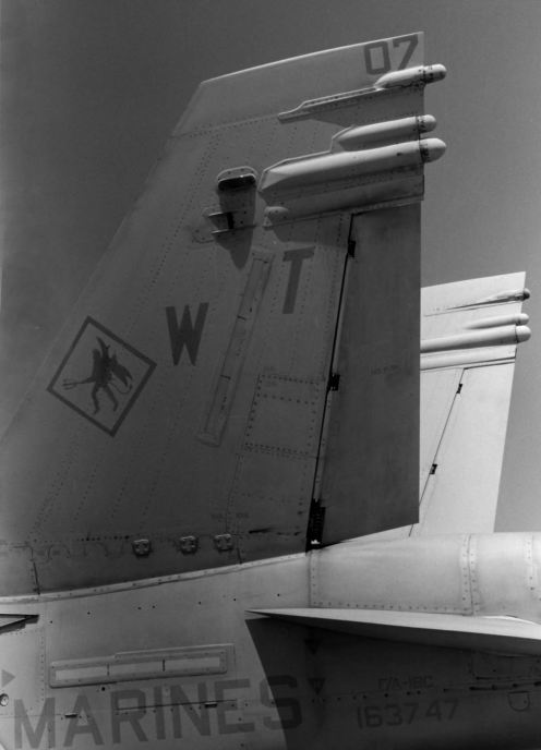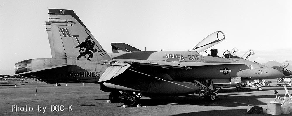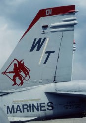 ↑ ホーネットを受領して恐らく最初にリアルな赤い悪魔を尾翼に書き込んだ機体である。1997年の九州の各地航空祭で展示され人気を博したVMFA-232 WT-01 Bu.No.163714.この機体、国籍マークから“MARINE”の表記まで全てがフルカラーとなっていた。
