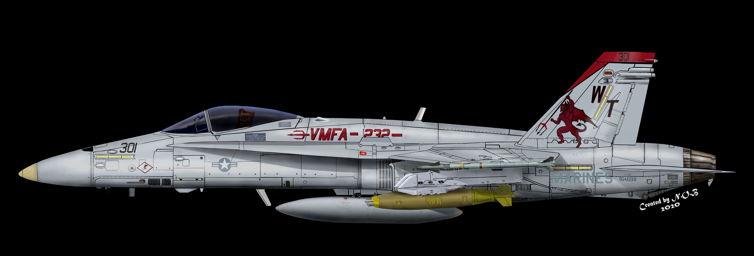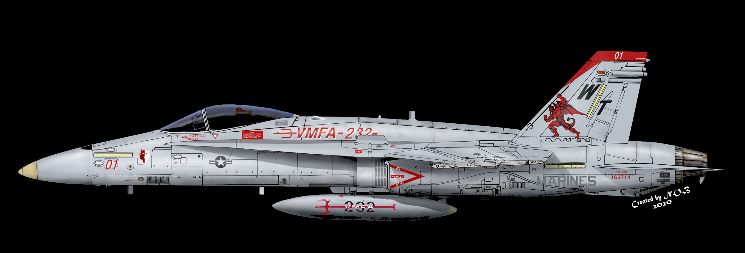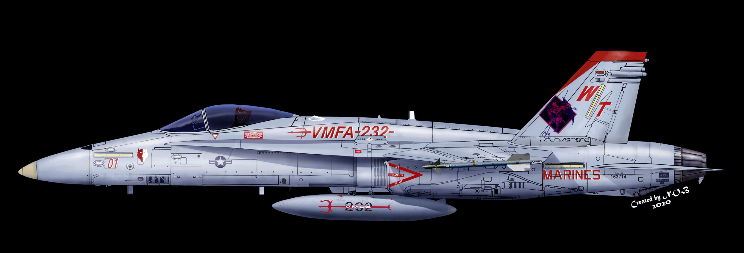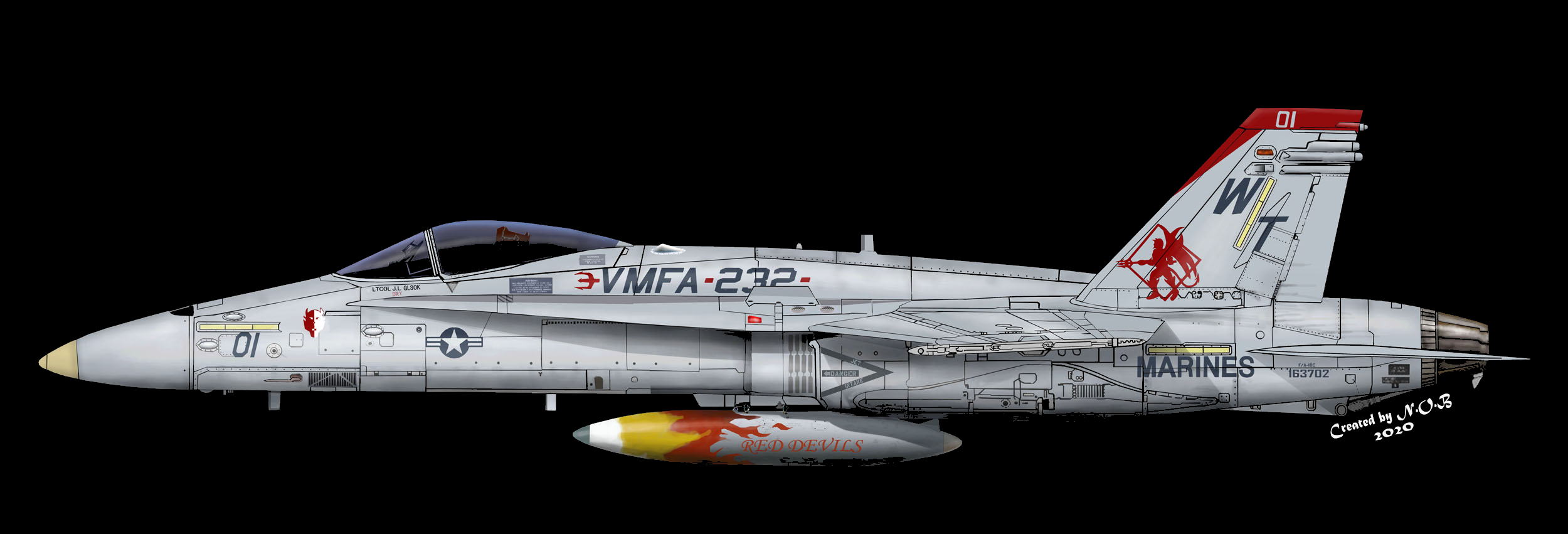 ↑2000年の登場した1997年板の焼直しマーキング、1997年度版の人気が高く復刻されたのだ。但しマリーン表記は、グレーになり レッドデビルの三又の槍も小さくなっている。VMFA-232 WT-01 Bu.No.163714