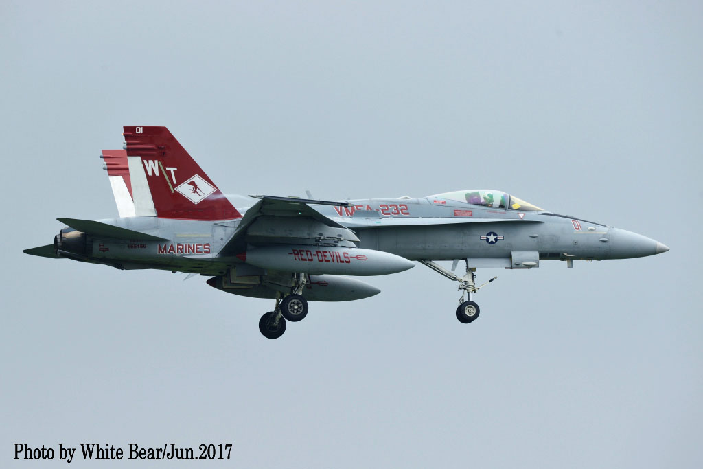 ↑ そして2017年に派遣された際のVMFA-232のFA-18C/WT-01である。機体そのものは2012年飛来時の隊長指定機と変わらない。White Bearさん撮影