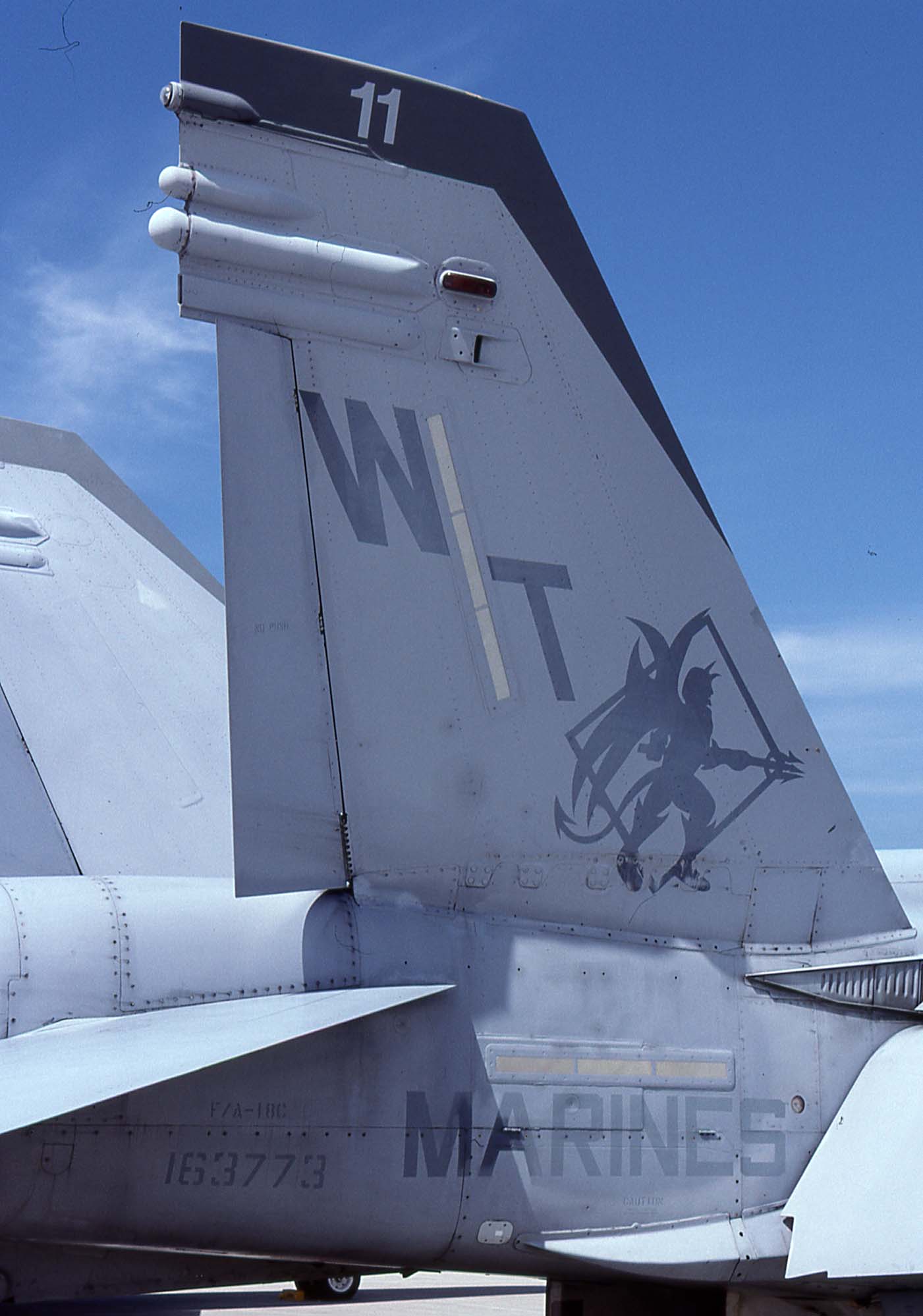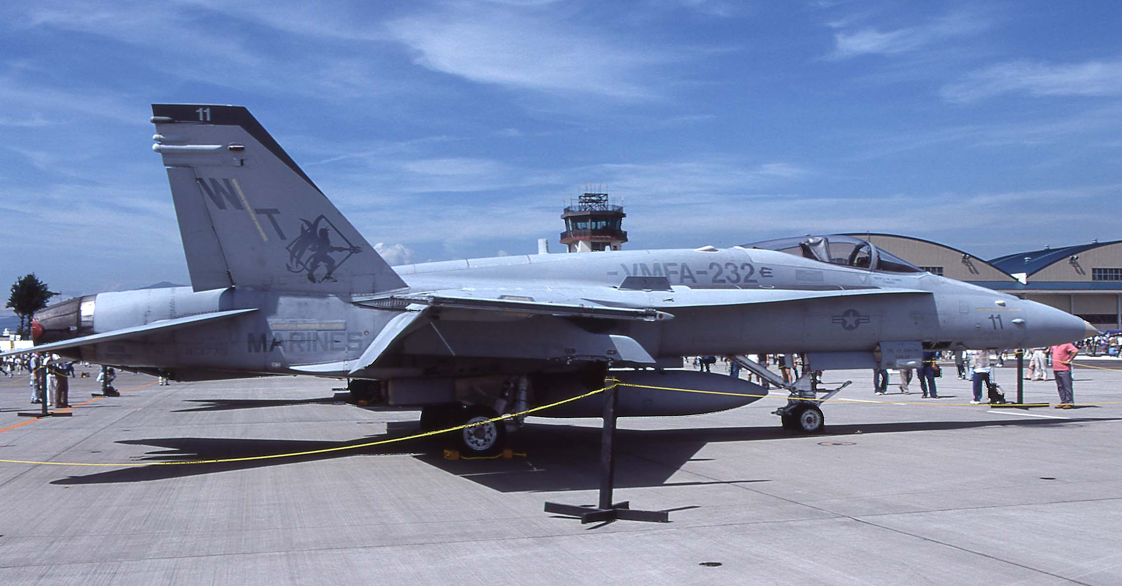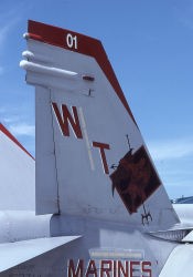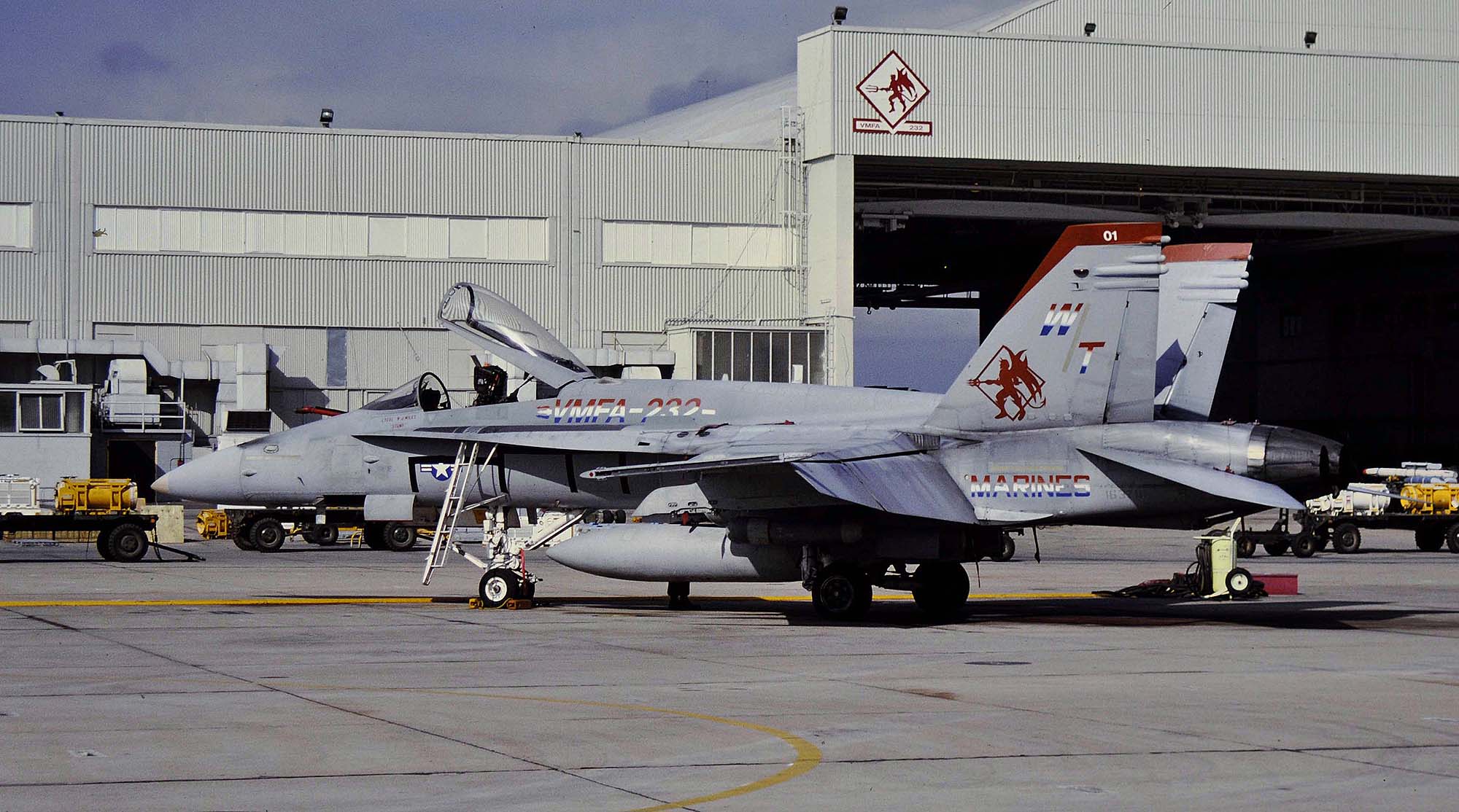 1998年10月、MCASミラマーの飛行隊ハンガー前に置かれたFA-18C Bu.No.163781”VMFA-232 WT-01” テールレター" "MARINE"の文字、そして部隊名まで国旗の3色で彩られている。何を記念したものかは不明である。
