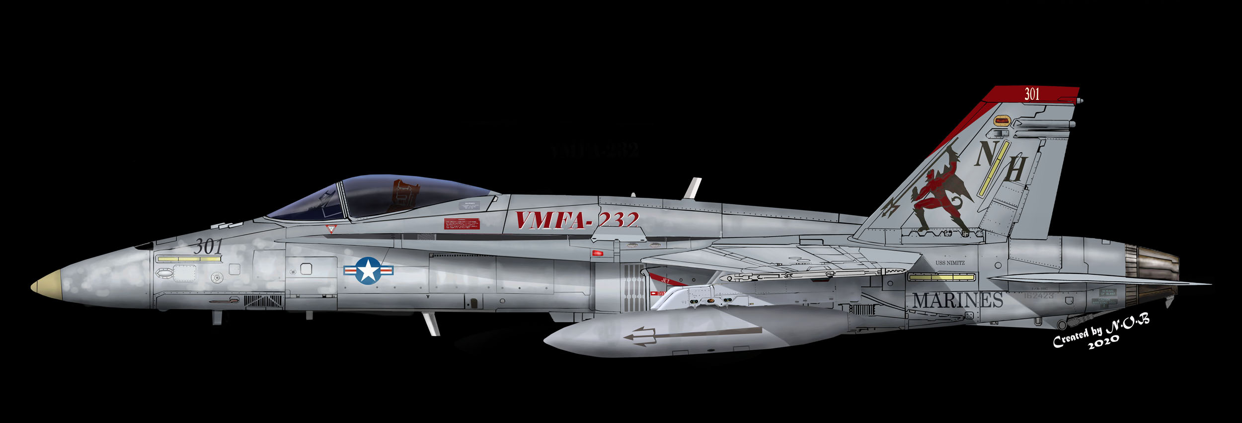 2006年USSニミッツで航海に出た際、NH-301に指定されて大きな赤い悪魔が尾翼に復活した際のもの。尾翼の悪魔像は従来とデザインが異なり ブーツや手袋がはっきり色分けして書き込まれた。航海が終わった後、この機体は、MARINESの文字も赤いに塗り替えられショーに展示されたが、短い期間であった。F/A-18C VMFA-232 NH-301 Bu.No.162423