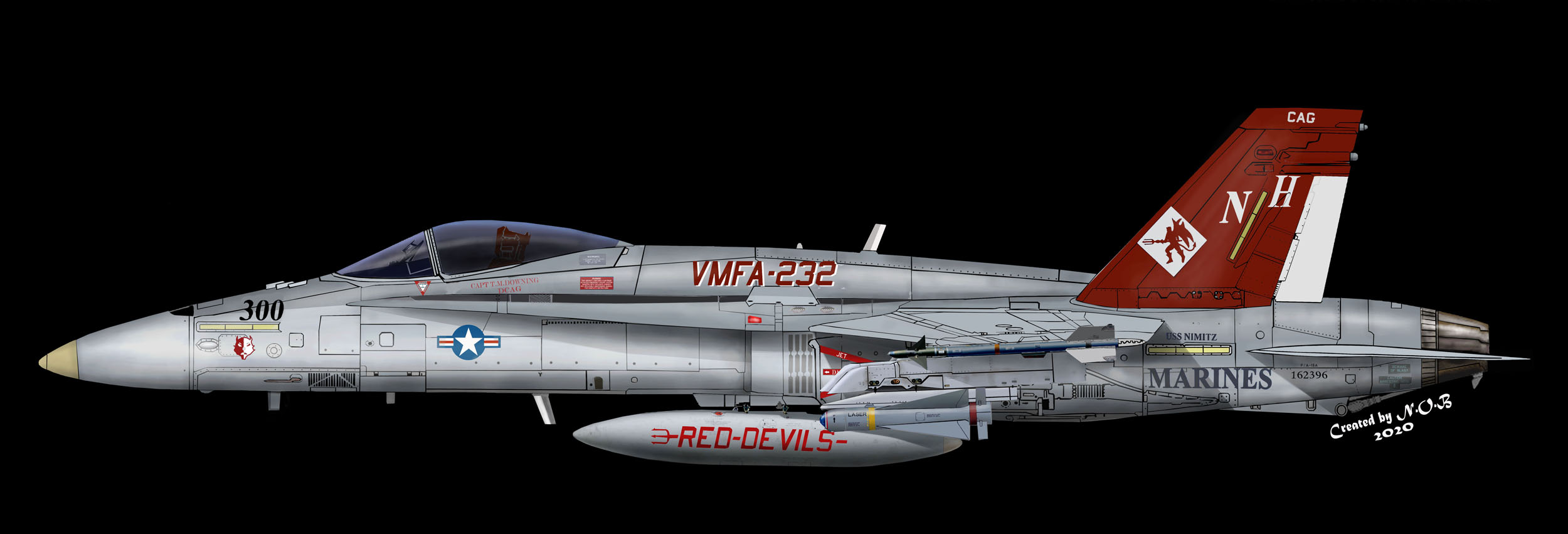 2006年原子力空母USSニミッツに搭載されて航海に出た際のマーキングでCVW-2の「NH」レターをいれ 300番のCAG塗装として派手なマーキングを復活させたもの。型は、何故かA型に戻っており 不足する機体のやりくりがあったと想像される。F/A-18C VMFA-232 NH-300 Bu.No.162396