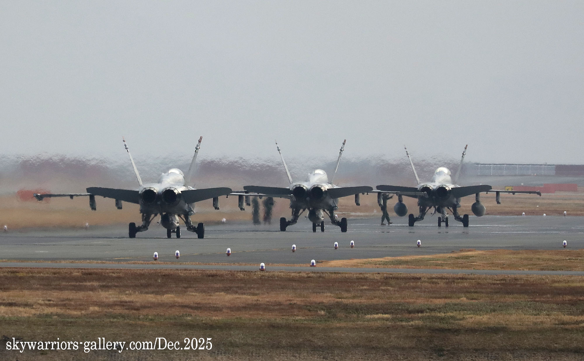 ↑ R/W-02で着陸を終えた各機は寒風が吹く中タキシーウェイ上でスタッフのチャックを受け、燃料補給をしてからハンガーに戻って行った。帰還後、再び直ぐ飛び立てる臨戦態勢を普段から訓練を通じて身につけるのである。