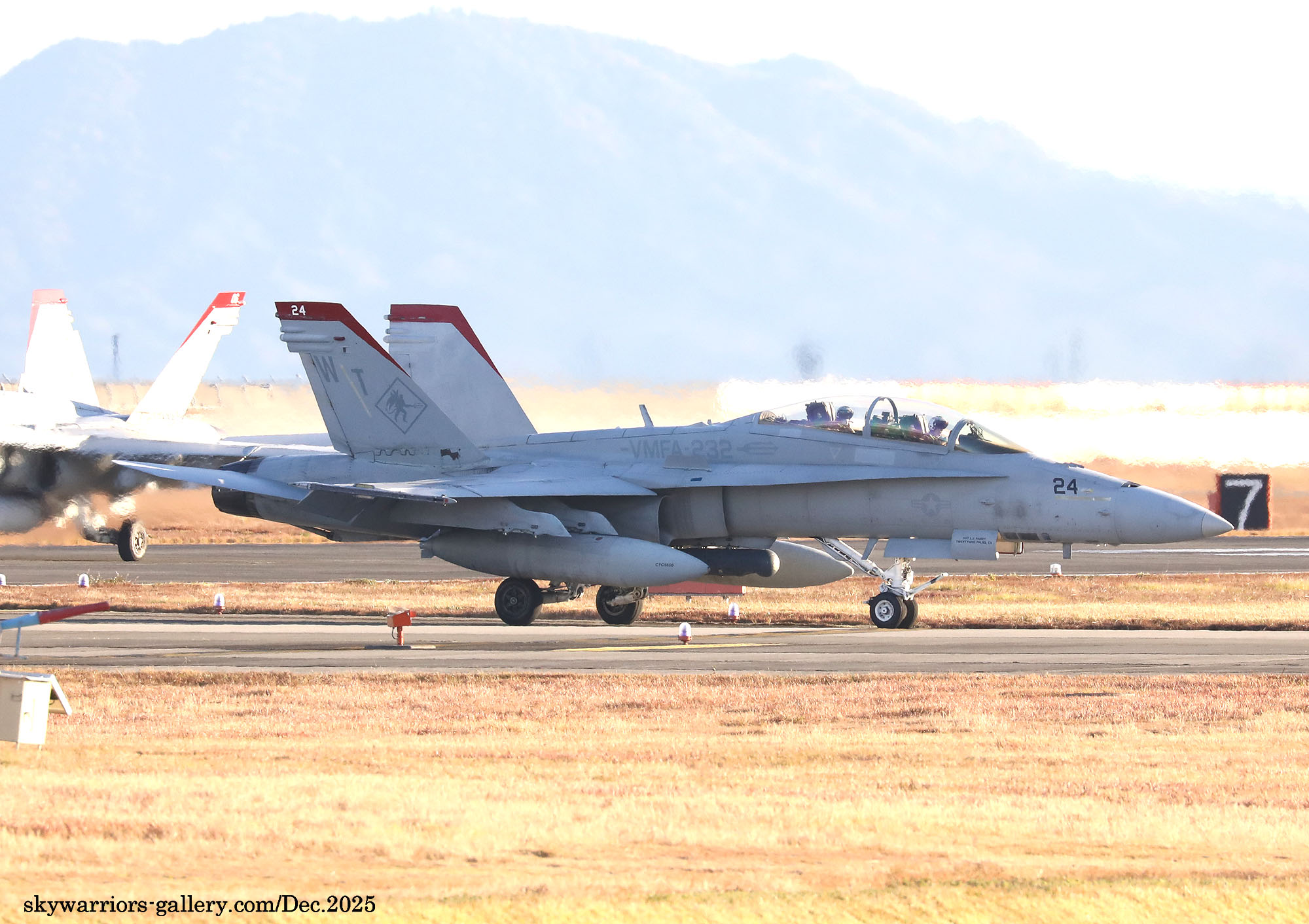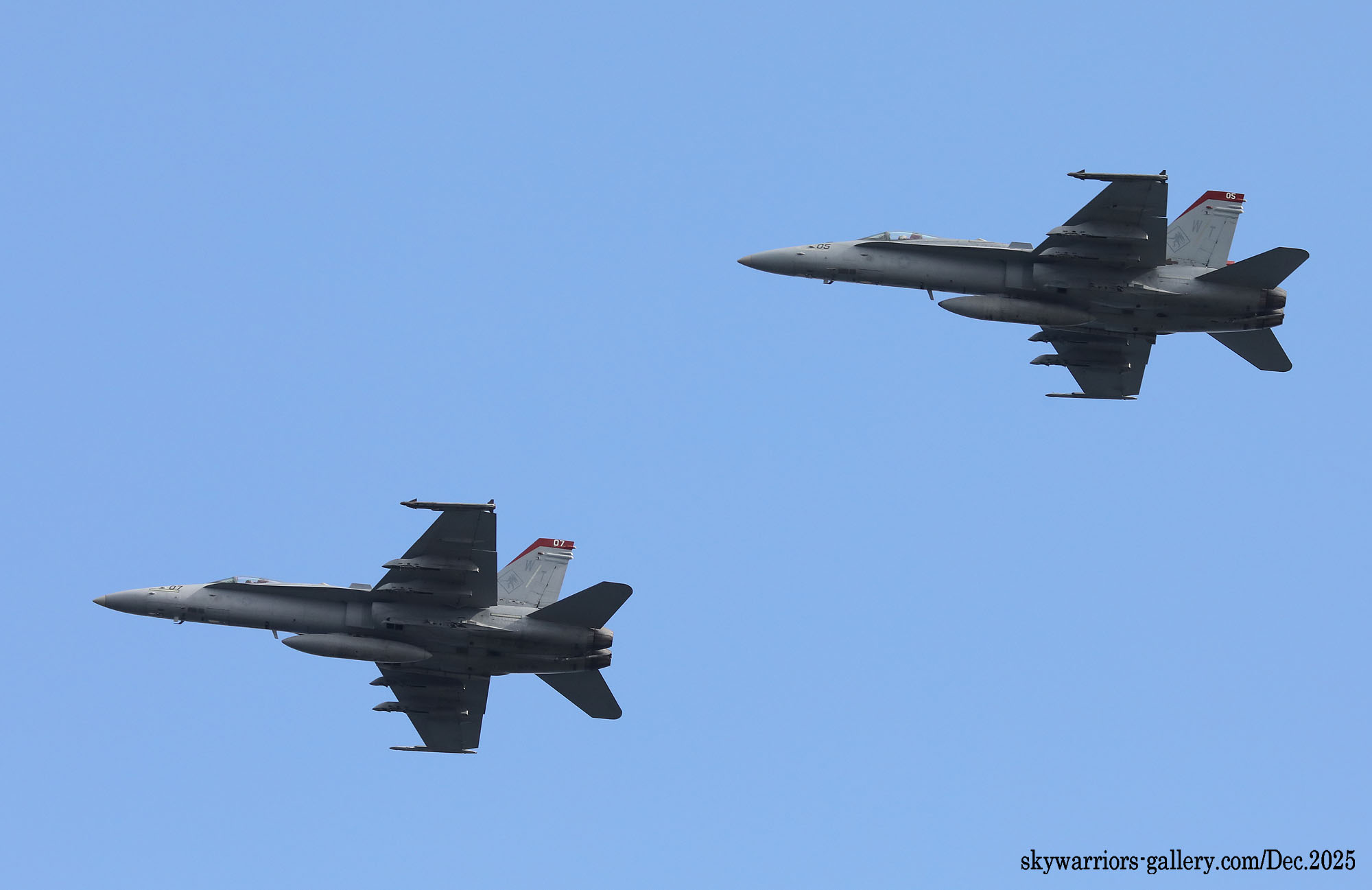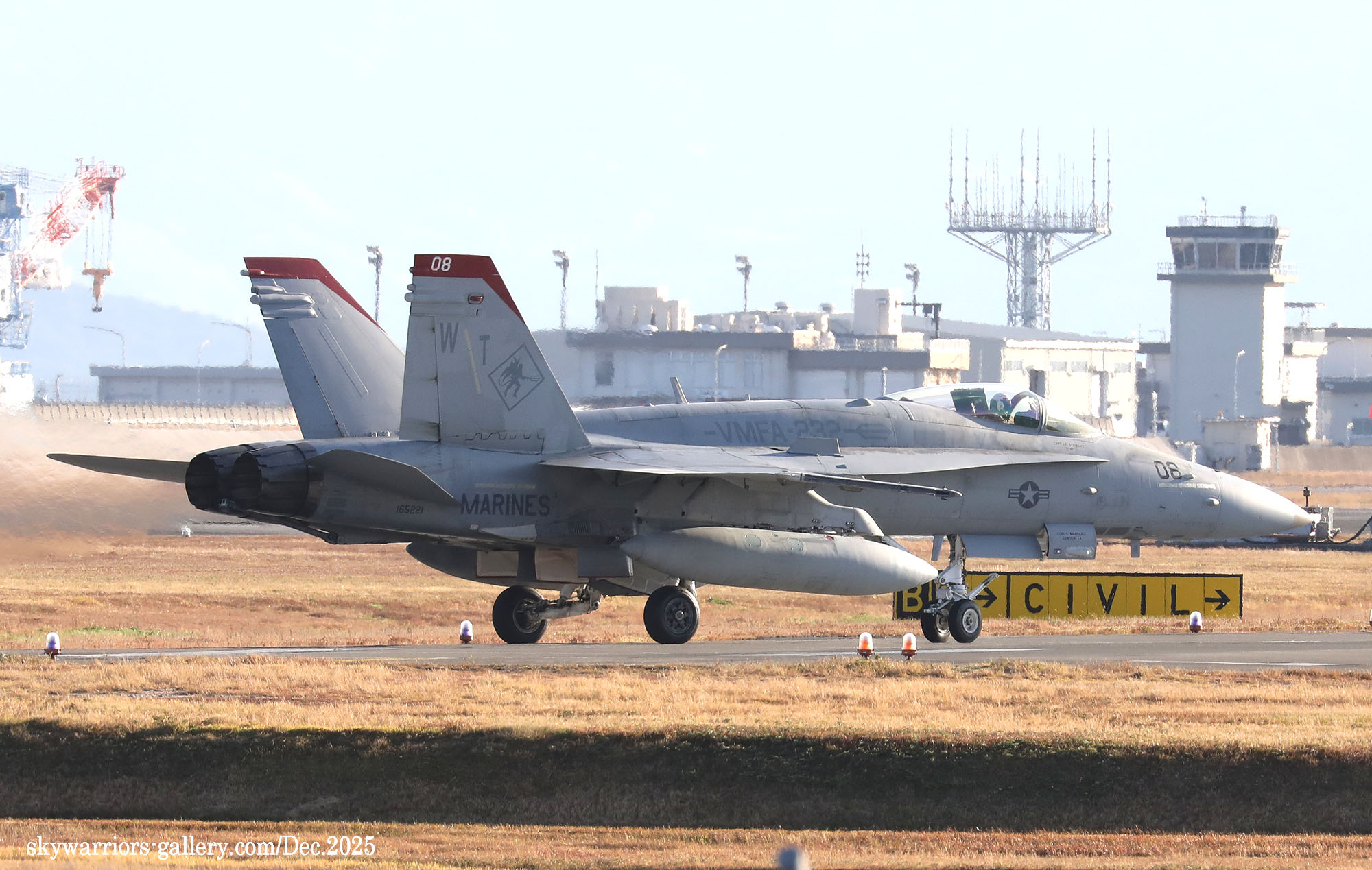 2025年12月1日~5日までの5日間、天候は大凡晴れで恵まれたが、3日から日本列島には大きな寒気が覆ったため、前日と比べ10℃も最高気温が下がると言う事態となり、3日夜には岩国市でも珍しく初雪が降った。岩国基地のF-35B部隊の1つは機体を強襲揚陸艦に出していた為全く此処での活動は無く、VMFA-232/121の訓練飛行だけがメインとなっていた。CVW-5は空母が沖縄の南側水域を北上している途中らしく、12月3日に7機の艦載機が先行で岩国基地に戻って来た。其の為明日にでもフライインかと期待されたが、私が居た金曜日までは動きは無かった。しかもVMFA-232の4機のFA-18Cは12月5日朝に厚木基地に向かい飛行して行ったため、岩国では当日は2機のFA-18Cがローカル訓練をしただけで、フライト数の少ない淋しい風景が流れていた。(2025年12月 記)