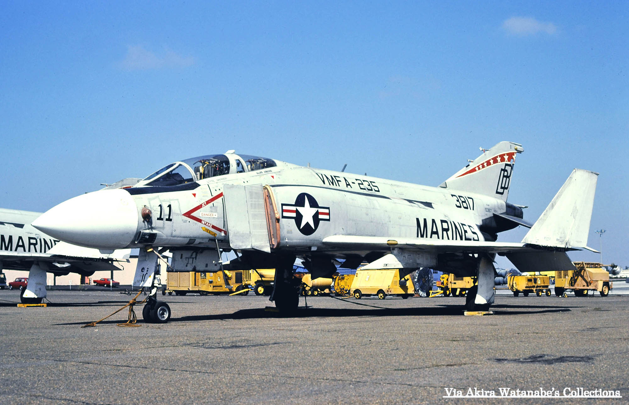 ↑ 上の2枚の写真は何れも渡辺明氏が、1975年8月にカルフォルニア州のノースアイランド海軍基地で撮影されたVMFA-235のF-4J/DB-11。既に赤いレードームのマーキングは無くなっていたが、尾翼にはディスエンジェルスが書かれている。