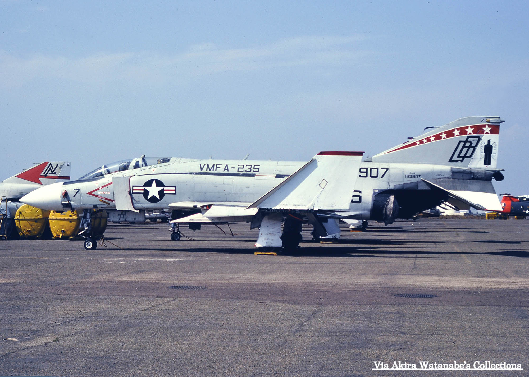 ↑ 1975年9月に撮影されたVMFA-235のF-4J/DB-7/Bu.No.153907。撮影場所は不明ながら、尾翼の死神のデザインが、異なっているのが面白い。いずれにせよこのラダーに書かれた死神が存在したのは1975年ぐらいまでと思われ、1976年以降の同隊のF-4Jからは殆ど見られなくなっている。