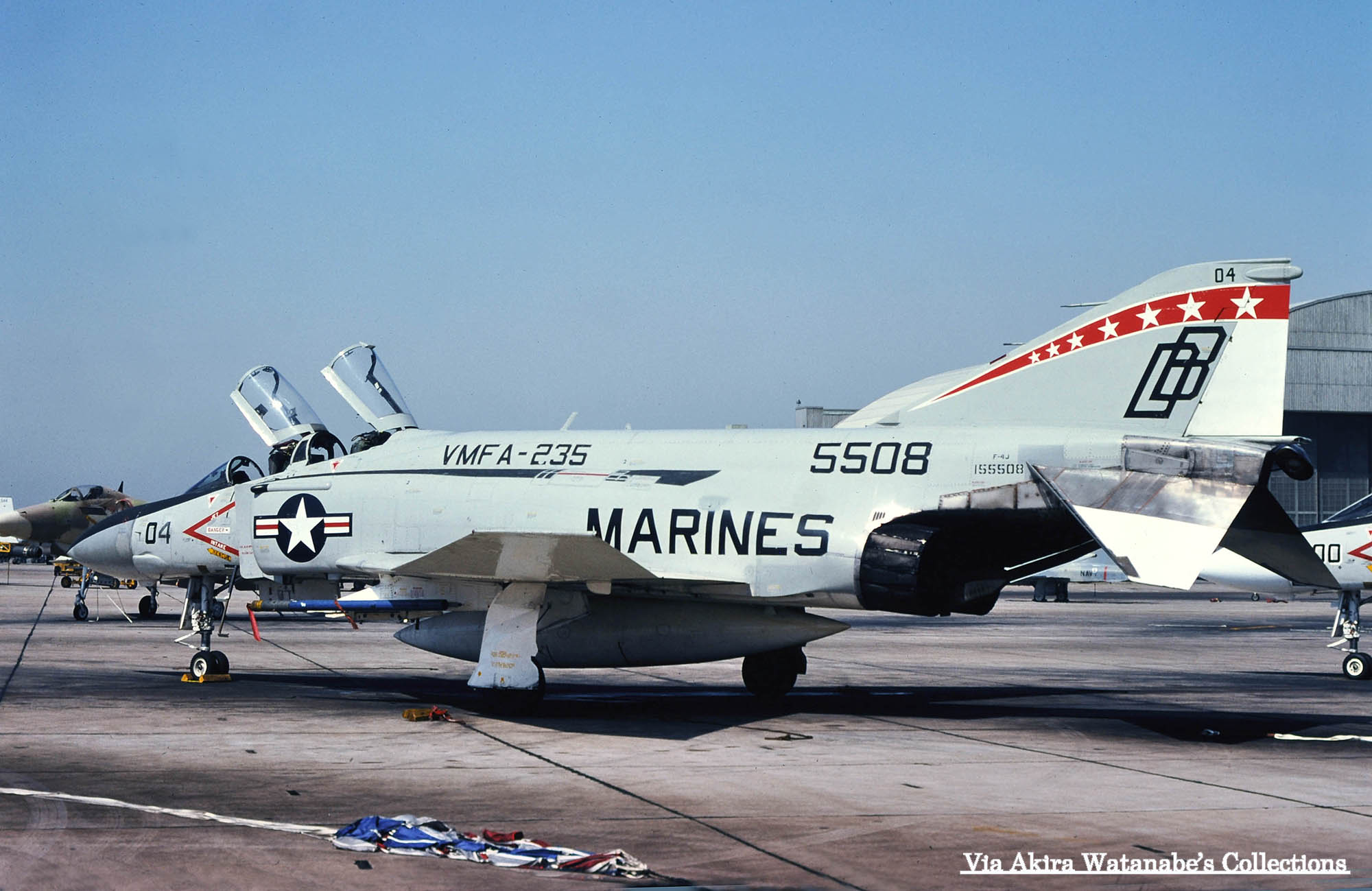 ↑ 1976年8月 マラマー海軍航空基地で撮影されたVMFA-235のF-4J/DB-04/Bu.No.15508。1975年まで一桁番号のModexまでは”0”を付けていなかったが、他の海兵隊航空部隊に合わせるように”04”と2文字を使うようになっている。尾翼の星の数は7つである。