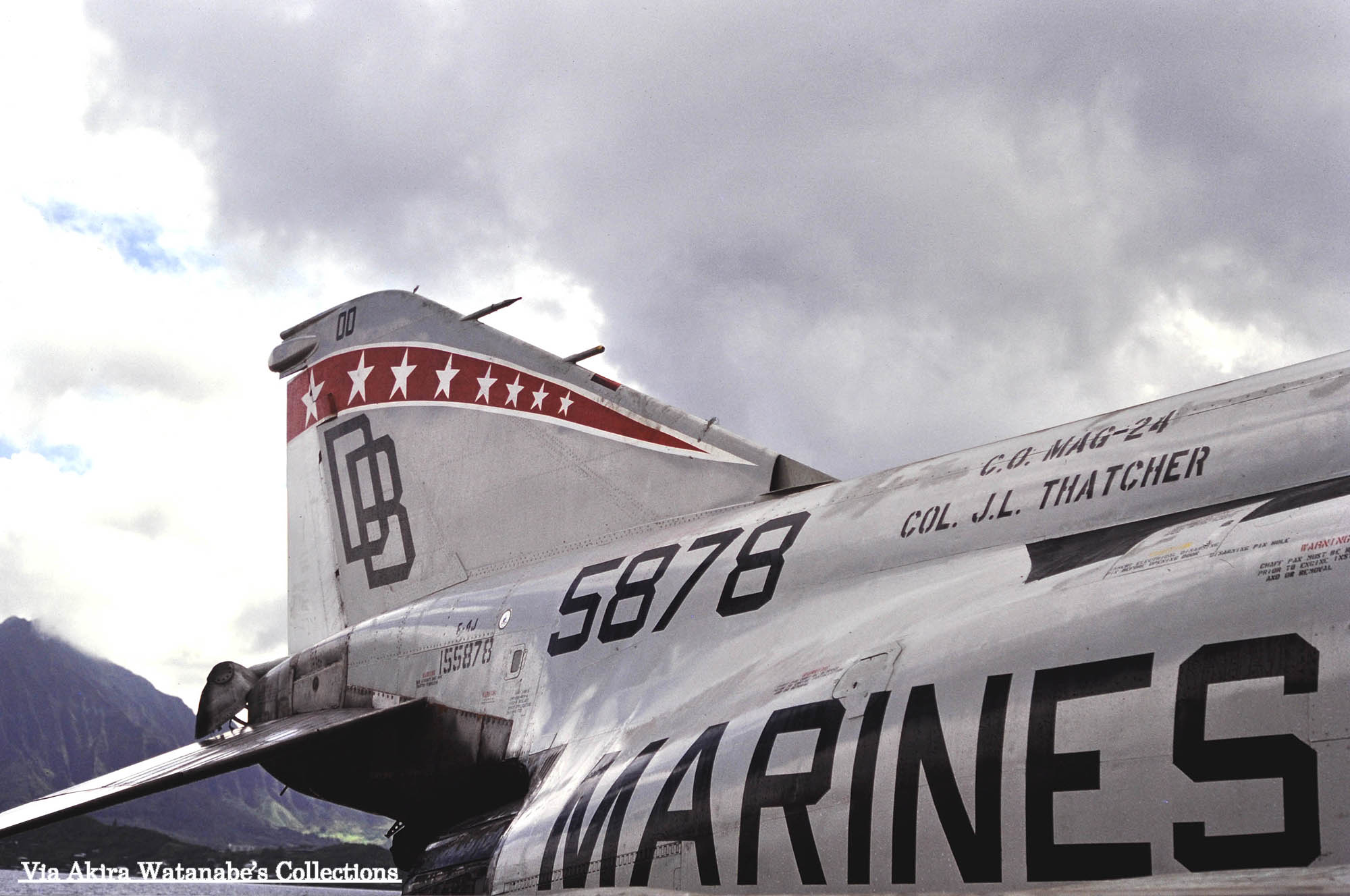 ↑ 1977年5月ハワイのカネオヘ海兵隊基地で撮影されたVMFA-235の司令官指定機F-4J/DB-00/Bu.No.155878。何とこの時期、全てではないが、多くの機体の赤い尾翼のラインに8個の星が書かれていた。次ページでも8個★が出てくるが、1977年のマーキングだけの特徴である。