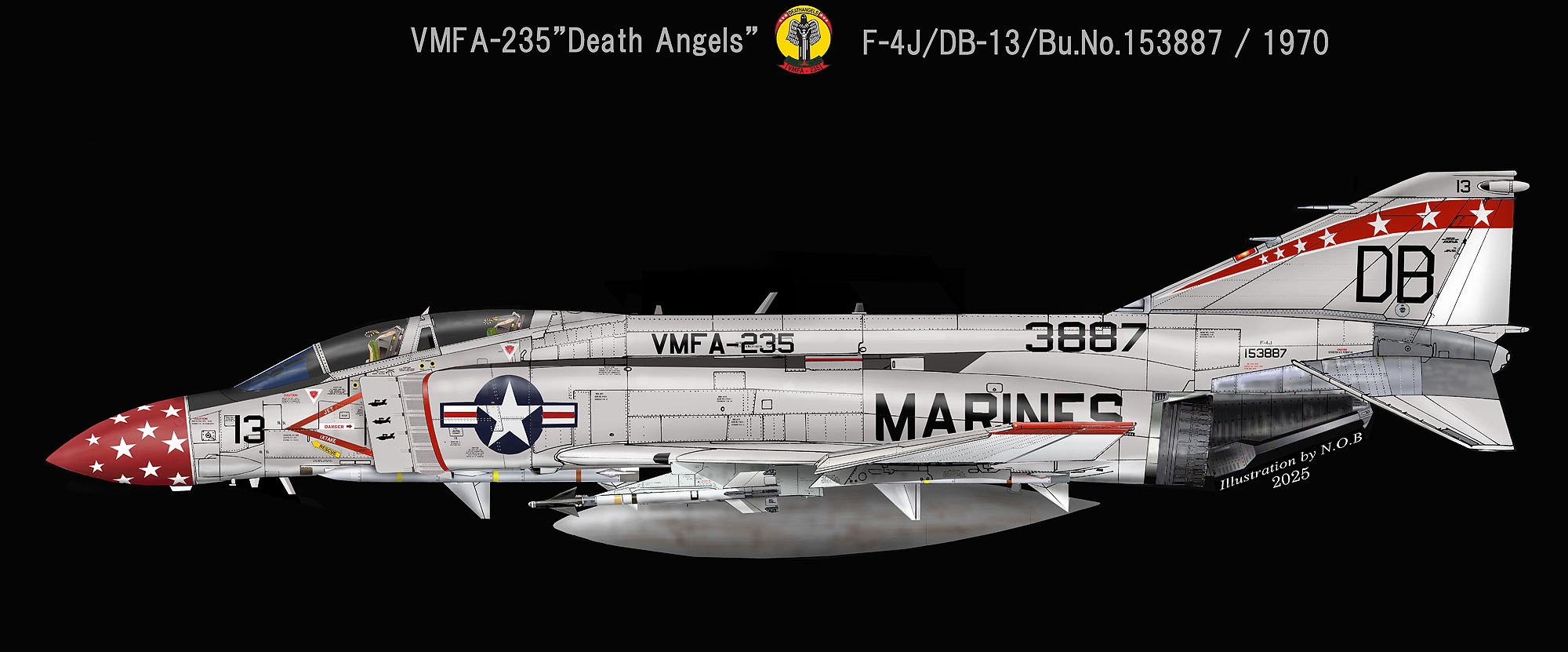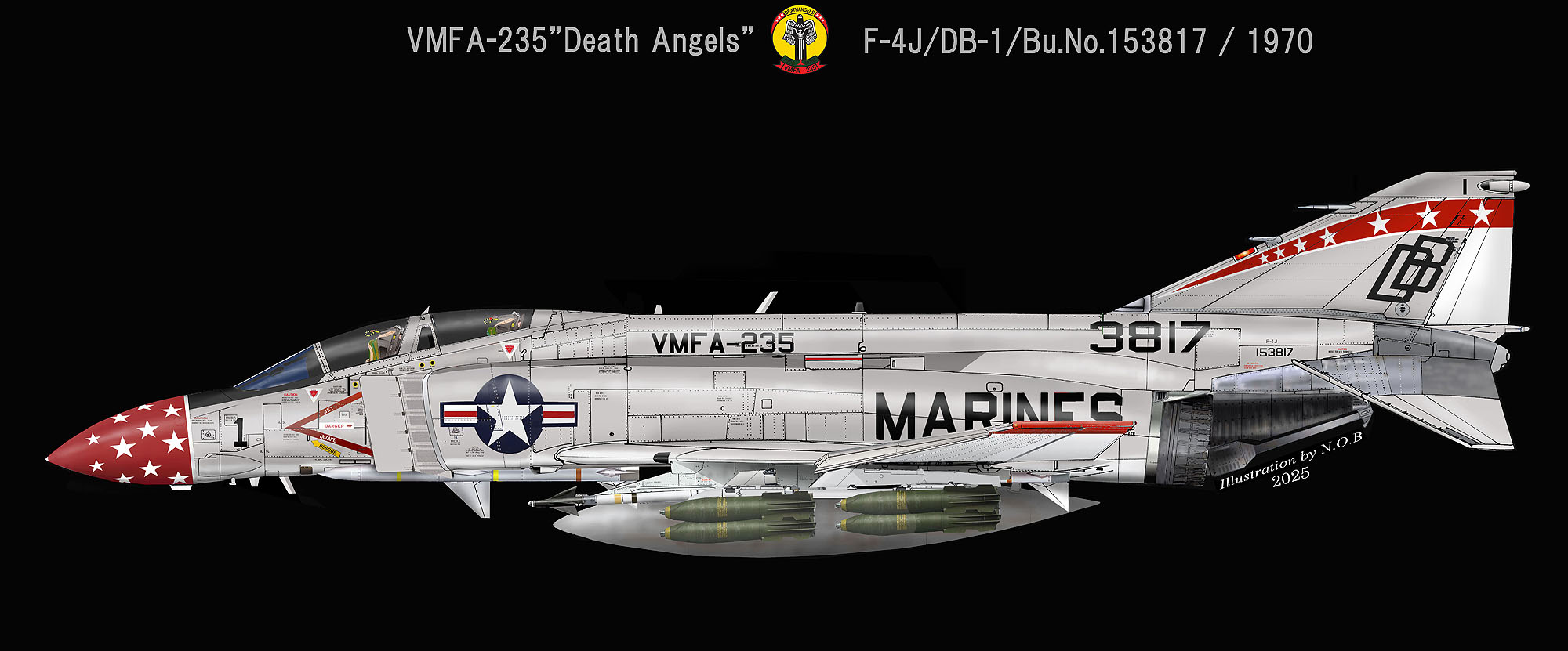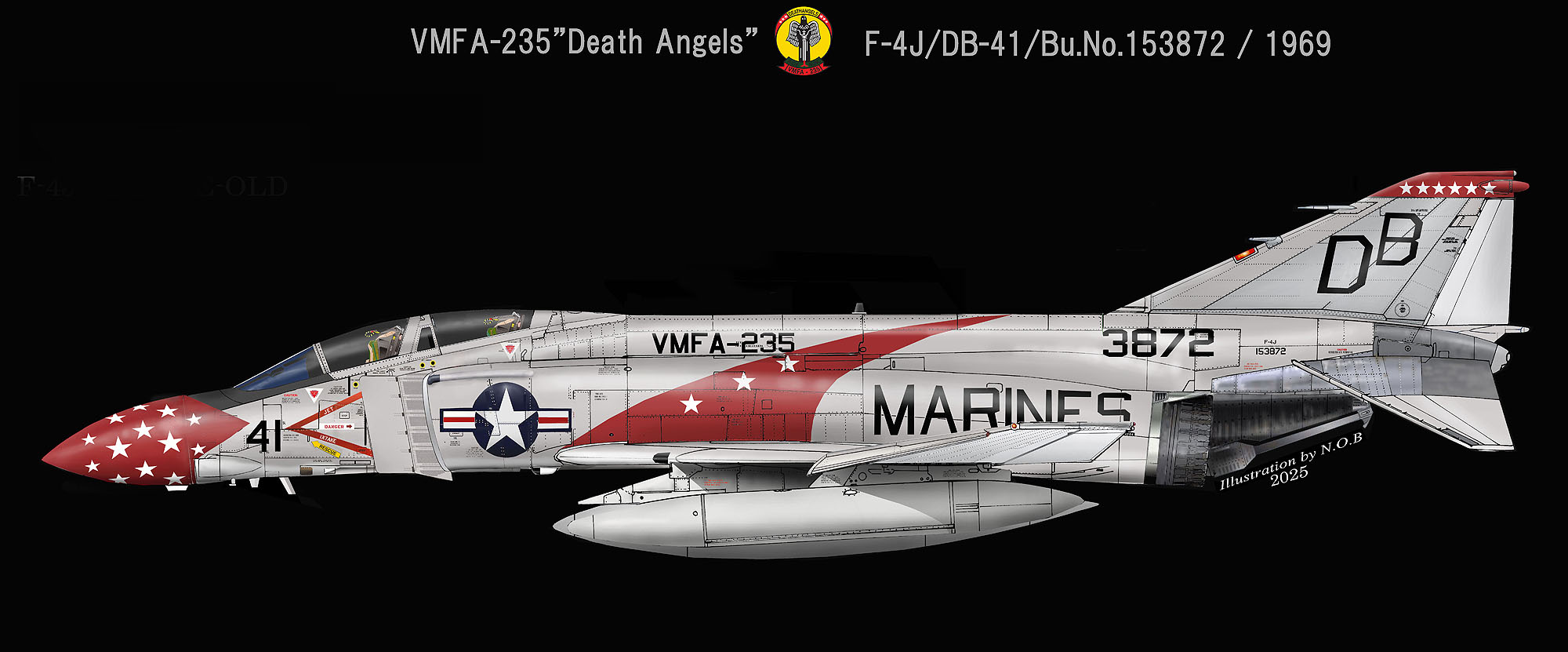 ↑ VMFA-235がハワイのカネオヘ海兵隊基地に展開していた1969年前後の時代のマーキングで、現在殆どSNS等でも写真が無いので、詳細を再確認できないが、F-8クルセーダー戦闘機時代の塗装を踏襲した最も派手な物だった。この塗装がはどこされる前はレドームを黒く塗り、胴体に赤い直線を入れていた。F-4J/DB-41/Bu.No.153872