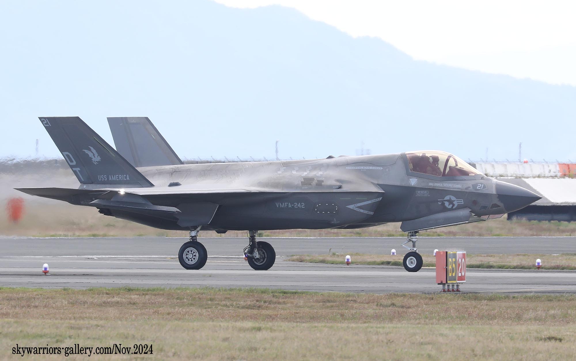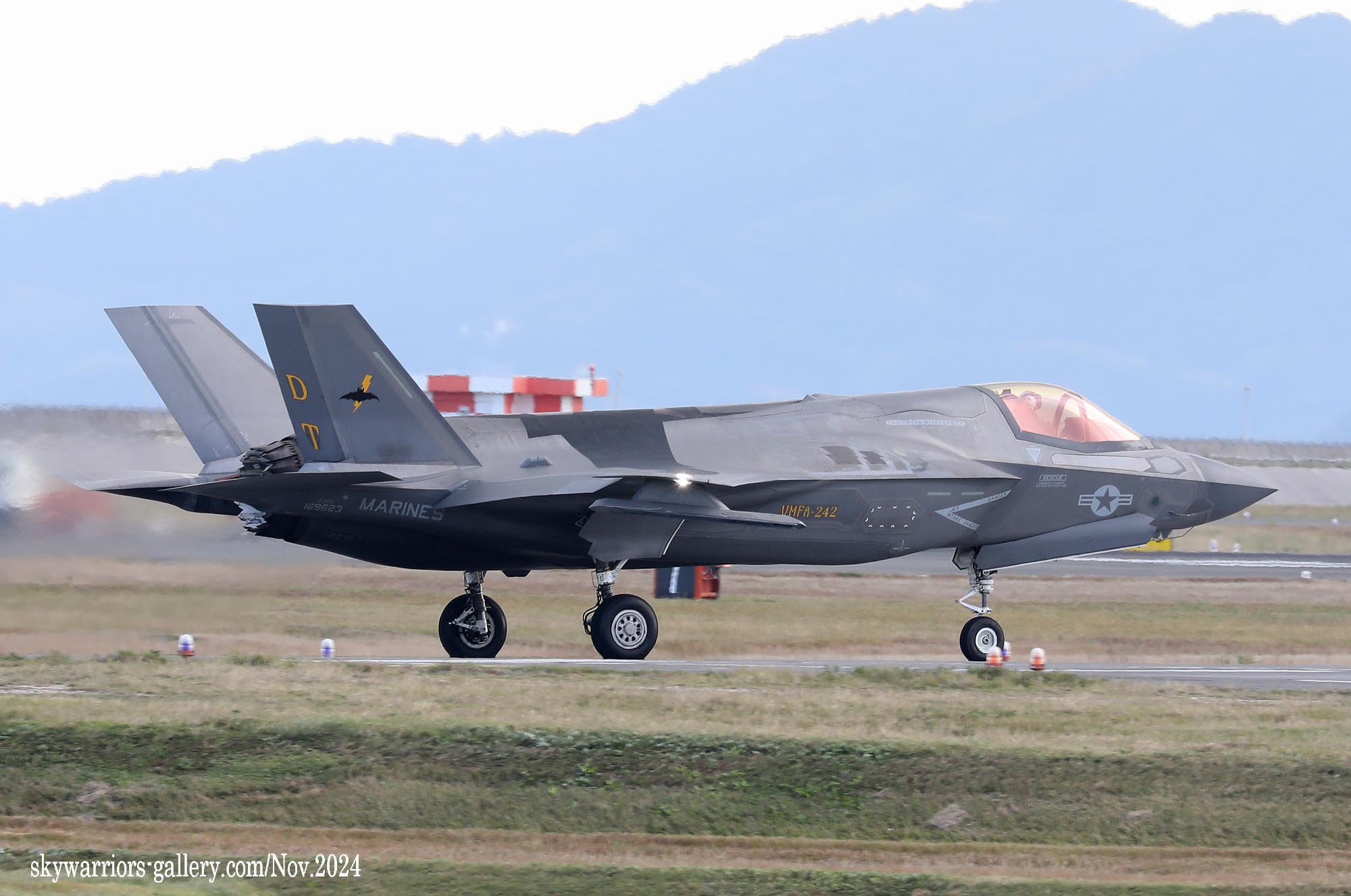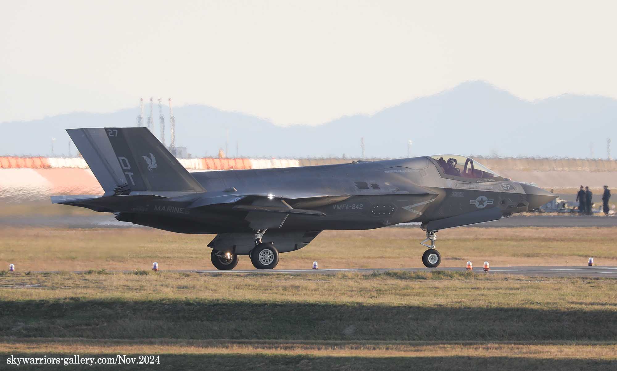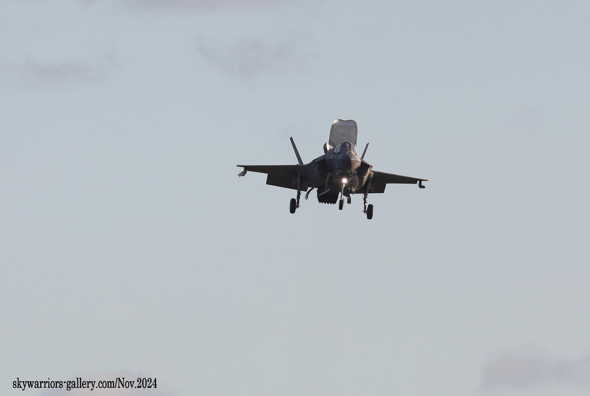 2024年11月 再び岩国基地に赴いた。強襲揚陸艦ボクサーから飛来していたVMFA-225”CE”F-35Bは、既に母艦に帰って岩国には姿が無かったが、VMFA-121/242は、活発に訓練を繰り広げていた。特に今回は、3日間と短い期間に垂直離着陸VSTOLの訓練とホットピット訓練を良く目にした。また Modexに多少の変化があり、VMFA-121が10番台、VMFA-242が20番台のModexに書き換えられていた。第一/二飛行隊のような見分けが付き易いように変更されたようである。
