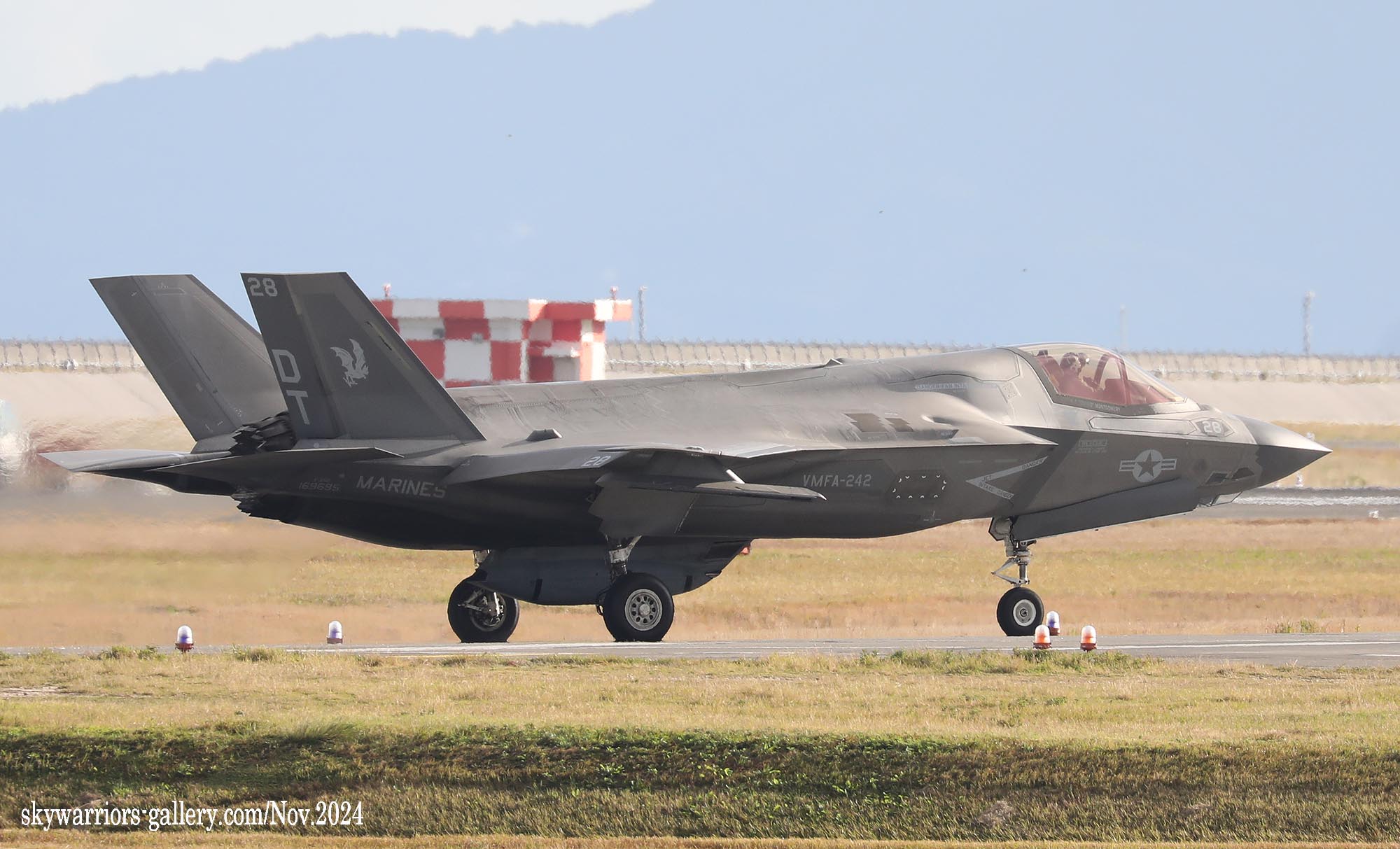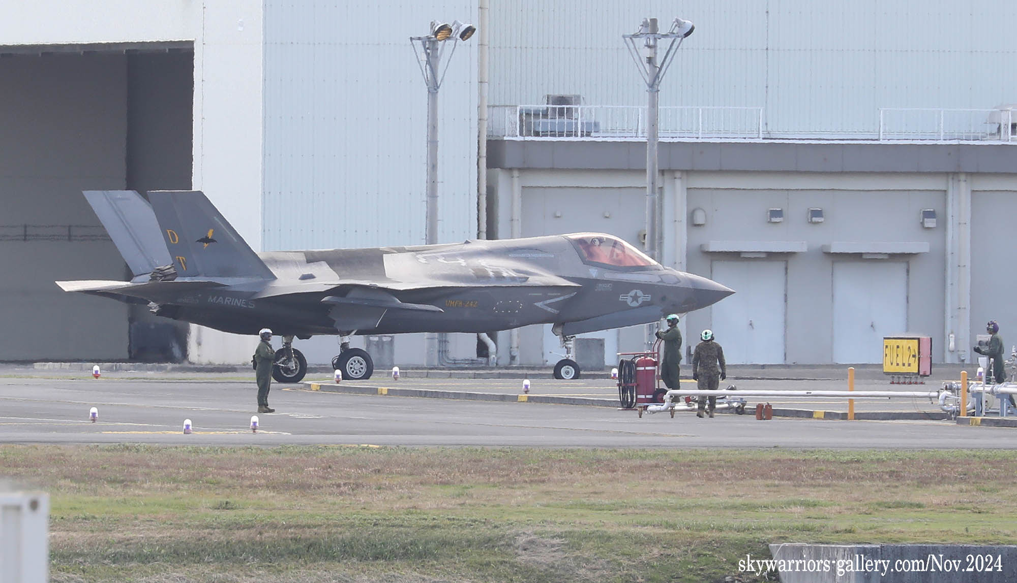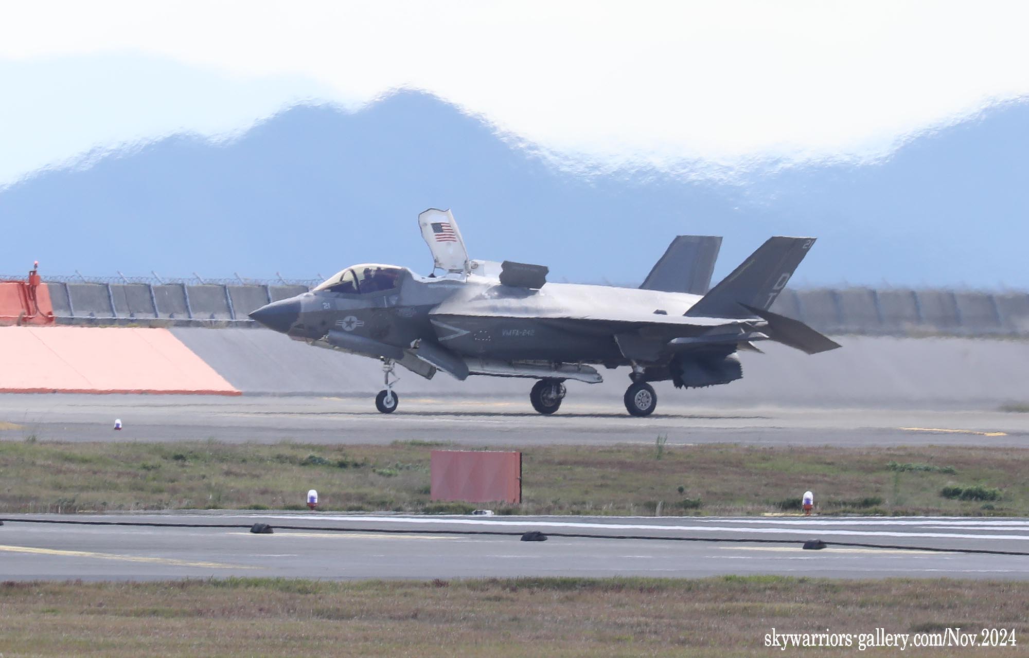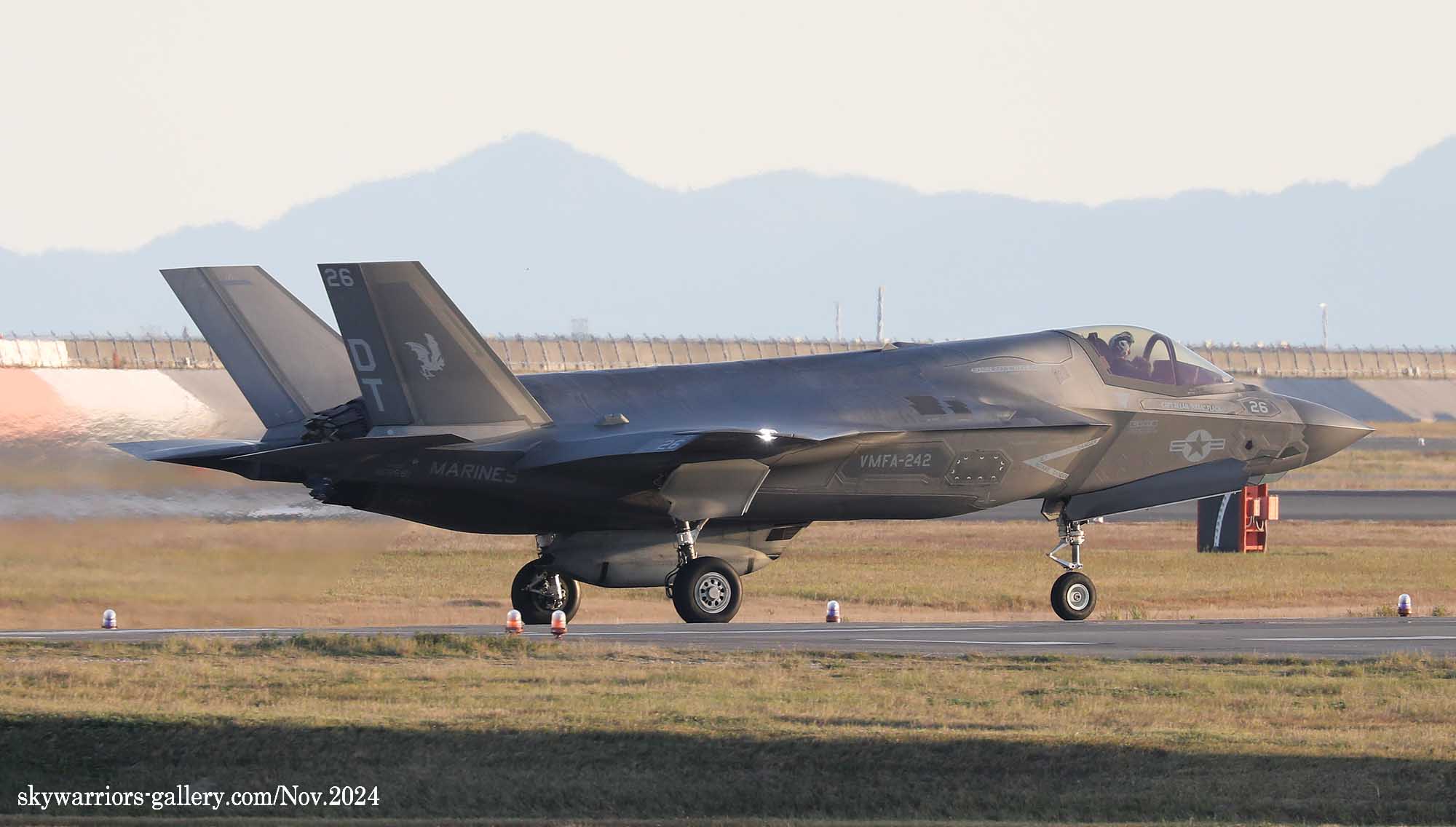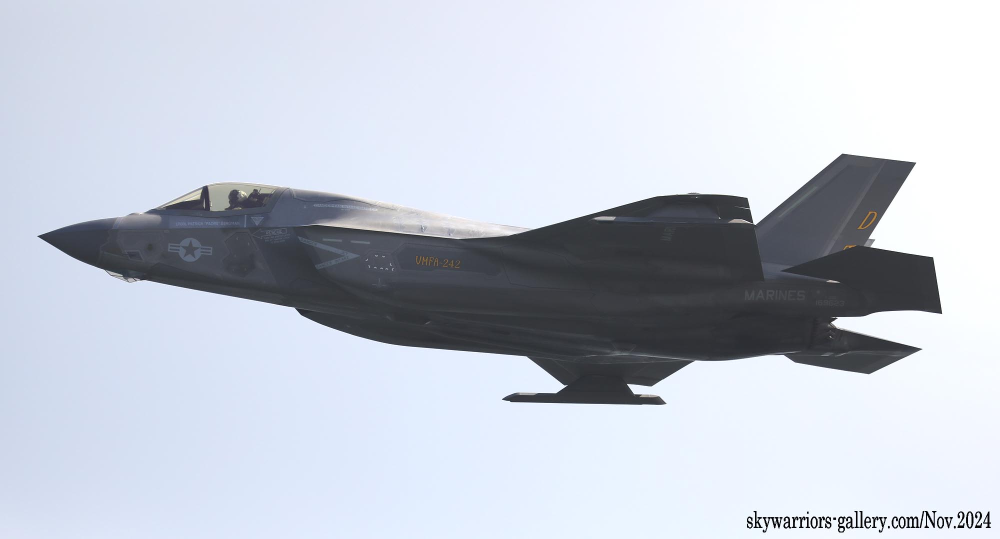 2024年11月 再び岩国基地に赴いた。強襲揚陸艦ボクサーから飛来していたVMFA-225”CE”F-35Bは、既に母艦に帰って岩国には姿が無かったが、VMFA-121/242は、活発に訓練を繰り広げていた。特に今回は、3日間と短い期間に垂直離着陸VSTOLの訓練とホットピット訓練を良く目にした。また Modexに多少の変化があり、VMFA-121が10番台、VMFA-242が20番台のModexに書き換えられていた。第一/二飛行隊のような見分けが付き易いように変更されたようである。