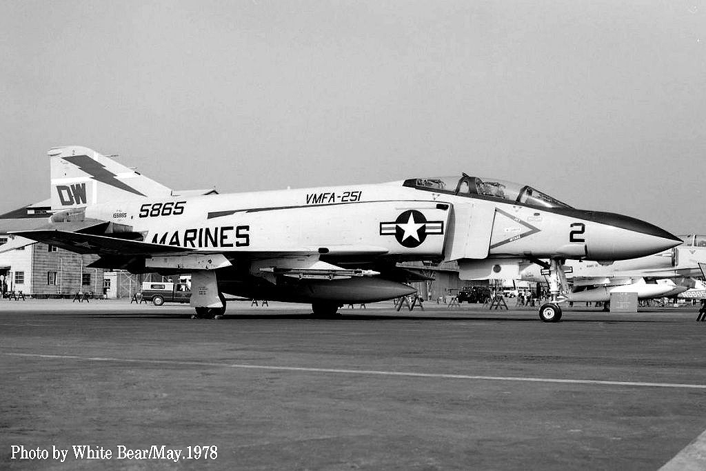 ↑ 同じく1978年5月にWhite Bearさんが岩国基地航空祭で撮影されたVMFA-251の同機。Modex-2/2号機は何故か”2”の記入位置が他の機体に比べレドームに近い位置に書かれており、文字体も大きい。コクピット周りの視界の反射を抑える黒いモヒカン塗装は、コックピット後方まで伸びているが、J型が完全なロービジへ移行する前の共通のパターンであった。