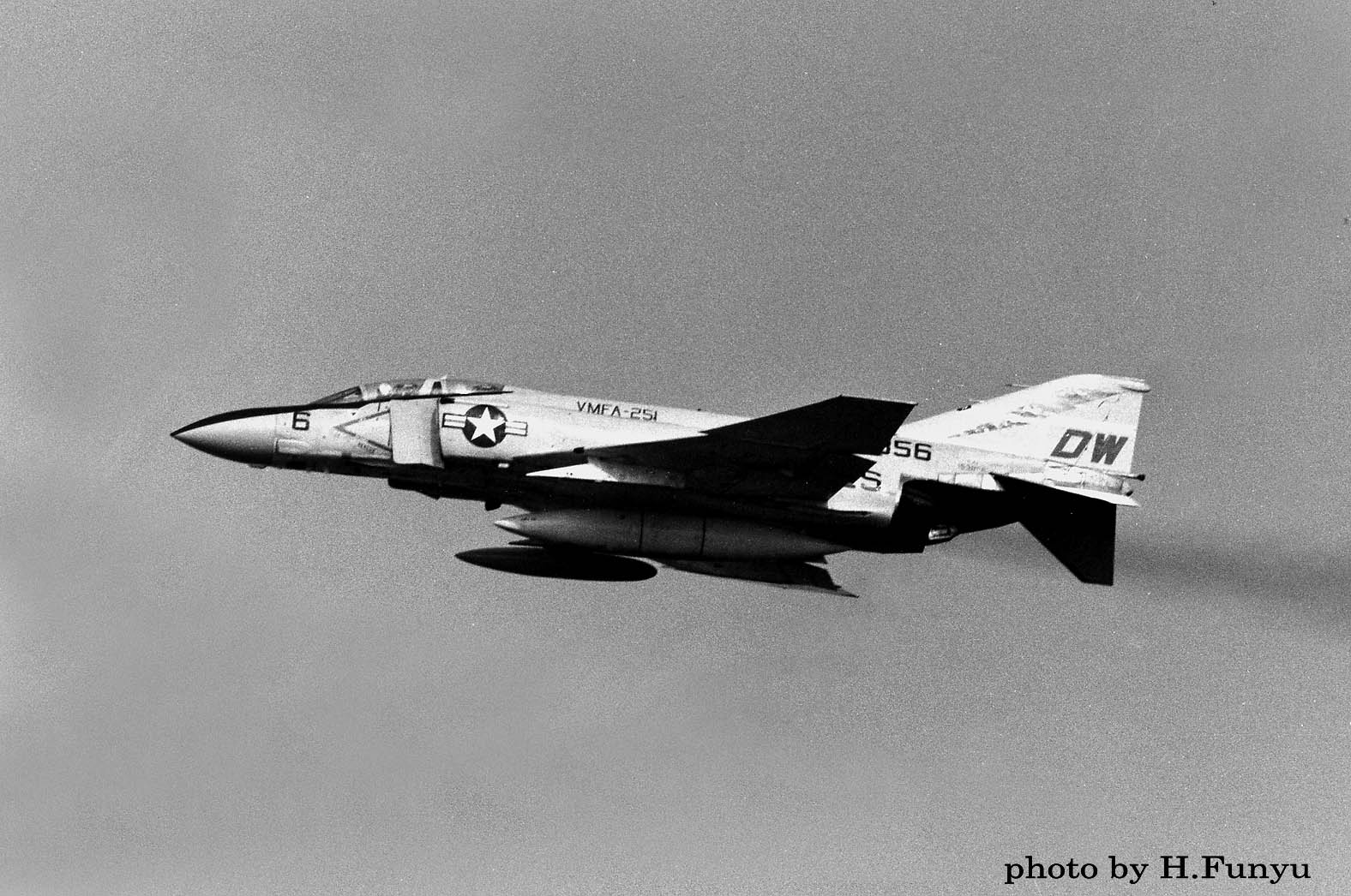 ↑ 1978年3月 冬のアルバイトで金を貯めて、天気の悪い3月の嘉手納基地に赴いた。お目当ての一つがこのVMFA-251のF-4Jを撮影する事だったが、残念だったのは尾翼をネービーブルーと赤い電光で塗った機体は既になく、全てグレー色に変っていた。