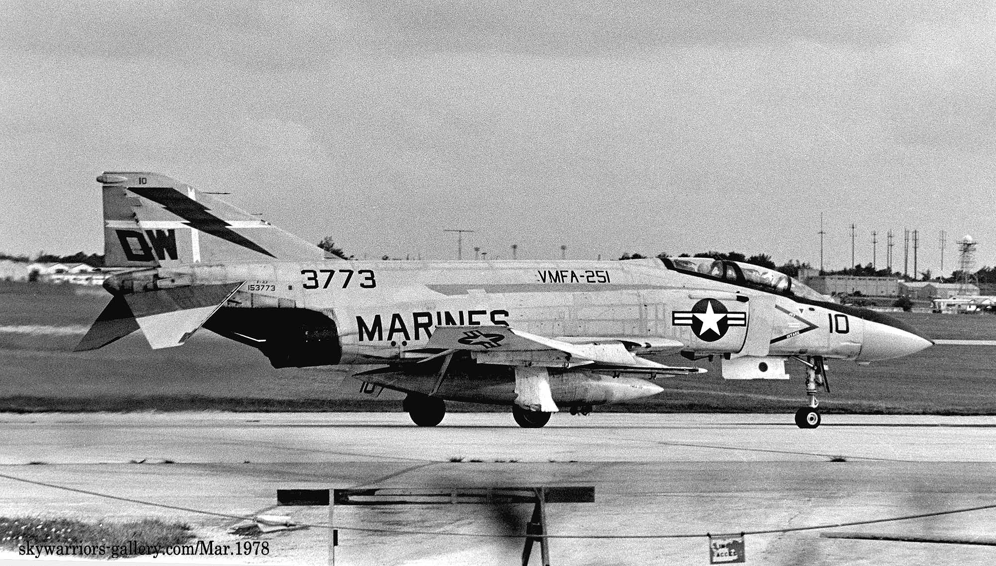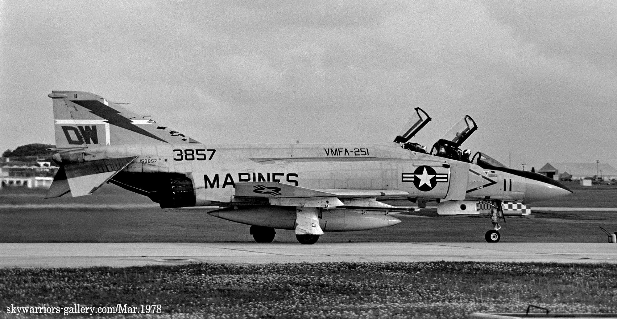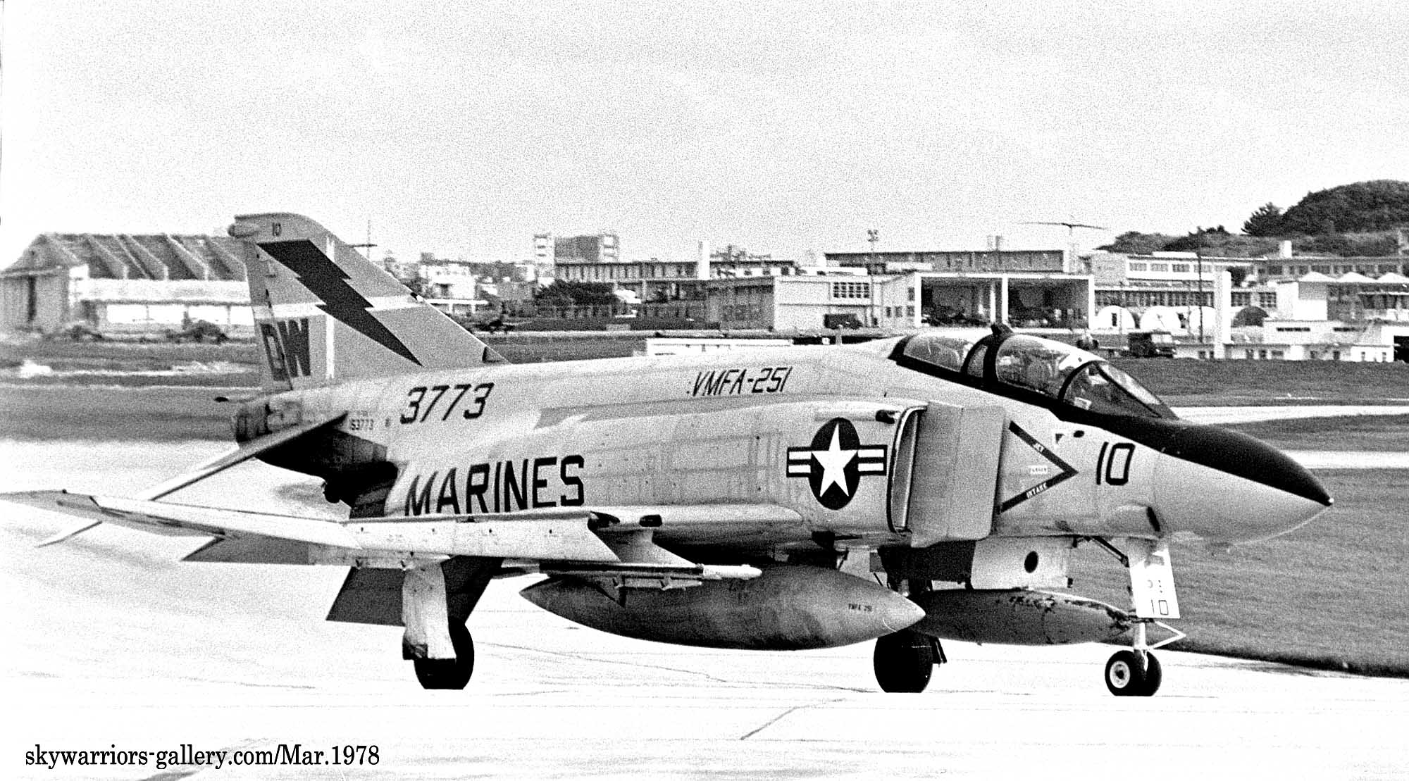 Paches”から現在の” Thunderbolts”に変更している。1961年VMFA-251は、サウスカロライナ州のボーフォース海兵隊航空基地に本拠地を移し、翌年には発生したキューバ危機に対応している。またVMFA-251は、海兵隊のF-8クルセイダー戦闘飛行隊として最初に空母運用の資格を得て空母甲板で活動した部隊でもあった。最初に搭載された空母はUSSシャングリラ(CVA-38)でCVW-10(第10空母航空団)の傘下で最初の1か月で約500時間の飛行記録を残している。前項でも記述したが、VMFA-251はカリブ海からヨーロッパ方面での活動が多かったが、1977~1978年に掛けてF-4J時代に唯一岩国基地に半年の展開を行っている。本項ではその時期の様子を写真でご紹介したい。