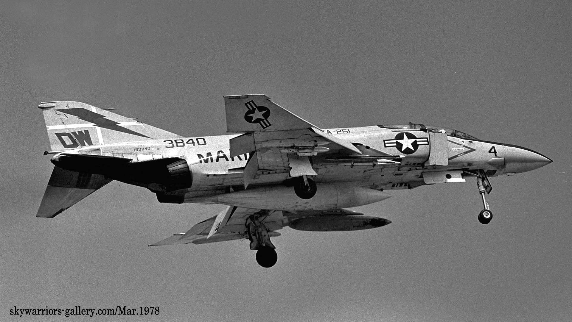↑ 1978年2月 松野主税氏が岩国基地へ赴き撮影されたVMFA-251のF-4J。フィルム時代で未だ望遠レンズも長玉等ほとんど無く、中々撮影条件も厳しい中、岩国上がりをしっかりとらえている。1977年10月にVMFA-251は岩国基地に来たようであるが、当初は尾翼にカラーマーキングが残っていた機体もあった様である。どうも年明けの2月には姿を消した模様。