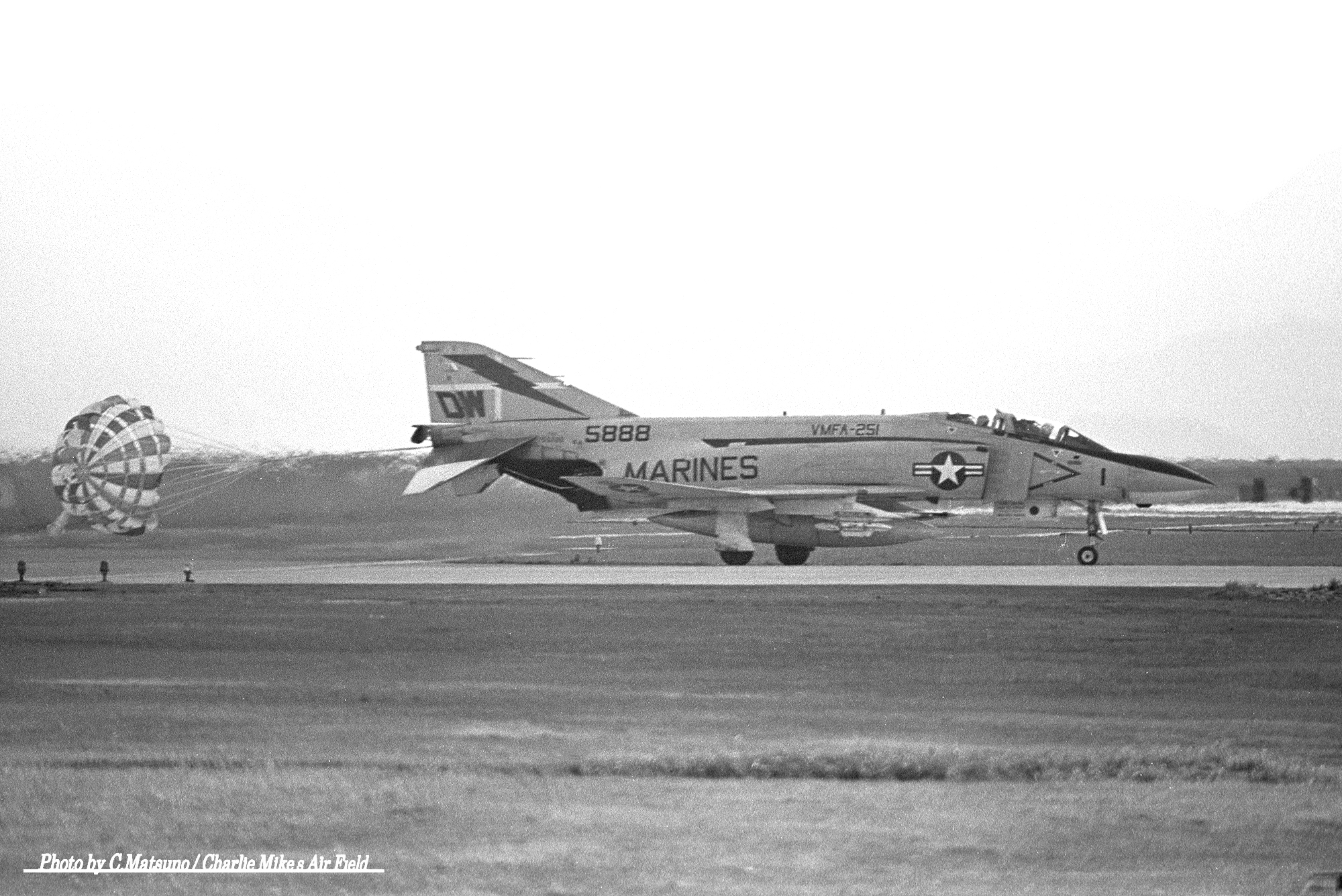 ↑ 1978年3月珍しく晴れた嘉手納基地R/W-05Rに着陸するVMFA-251のF-4J/DW-4。彼らの部隊ニックネームは1957年フロリダ州マイアミ海兵隊航空基地にて”Thunderbolts”に変更され、同時にテールレターも”DW”に変更された。因みにVMFA-251が、J型ファントムを受領したのは1971年からだ。
