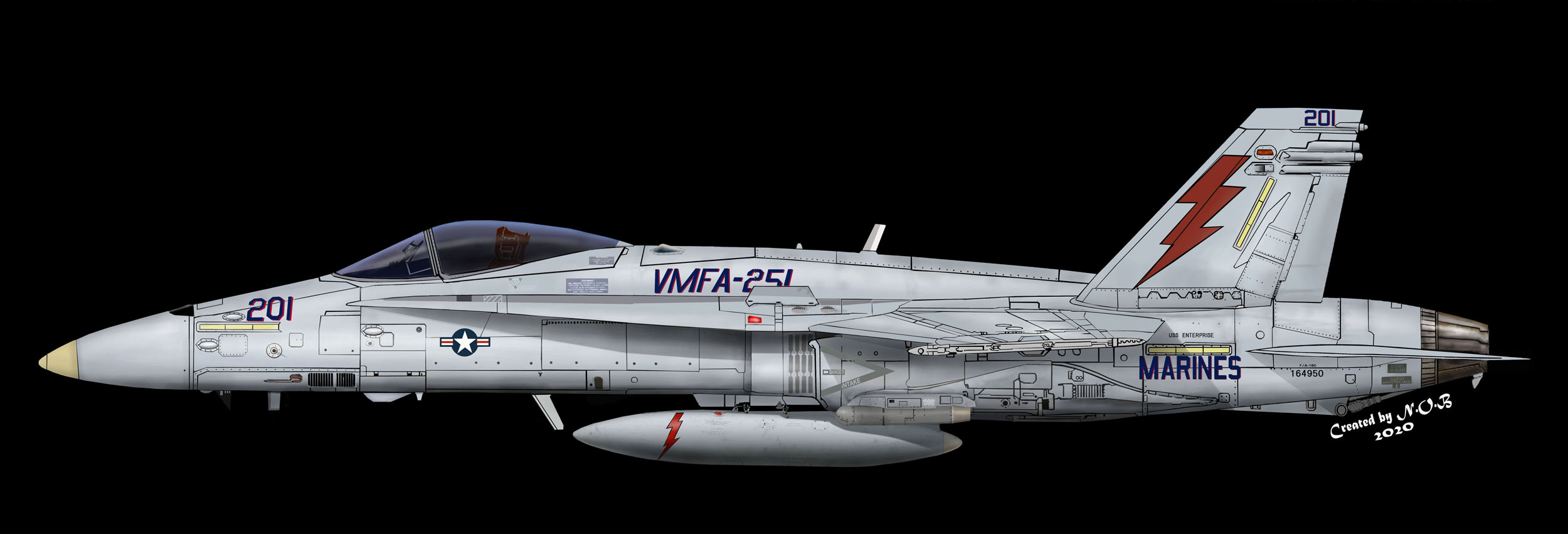 ↑2008年CVW-1の傘下にいたVMFA-251は、原子力空母USS エンタープライズに搭載されてアラビア海に入り、イラク・フレーダム作戦の支援に当たった。この際Modex201番が司令官指定機となり、同年オハイオ州のデイトンの航空ショーに展示された際のFA-18C/AB-201の塗装が上のイラストである。C型であるが、機首にIFFのアンテナが無いタイプであった。FA-18C/AB-201/Bu.No.164950