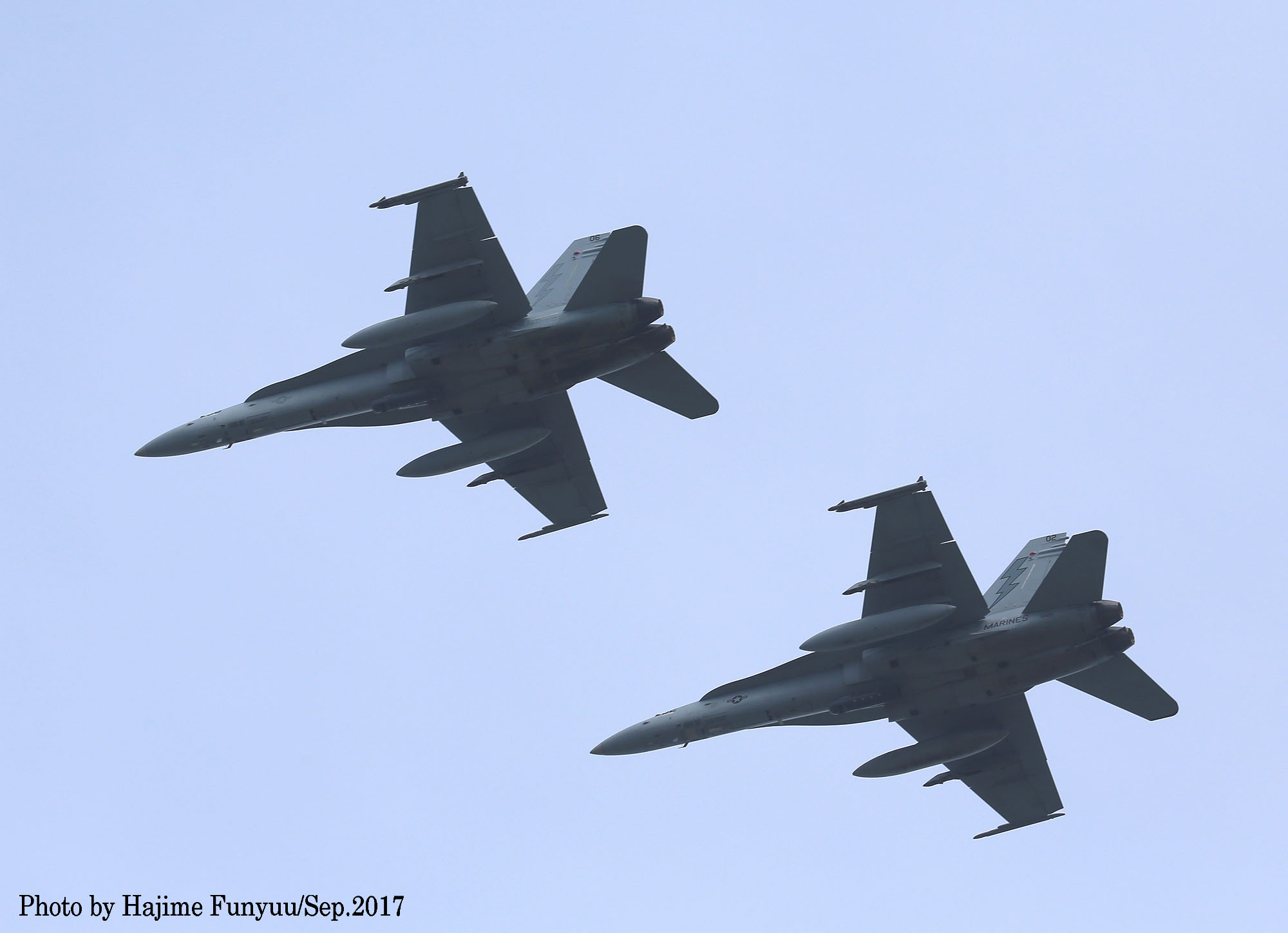 ↑ 2017年9月29日 VMFA-251"thunderbolts"の4機のFA-18Cが厚木に飛来 翌30日には、ローカルフライトを行ったそうだ。
