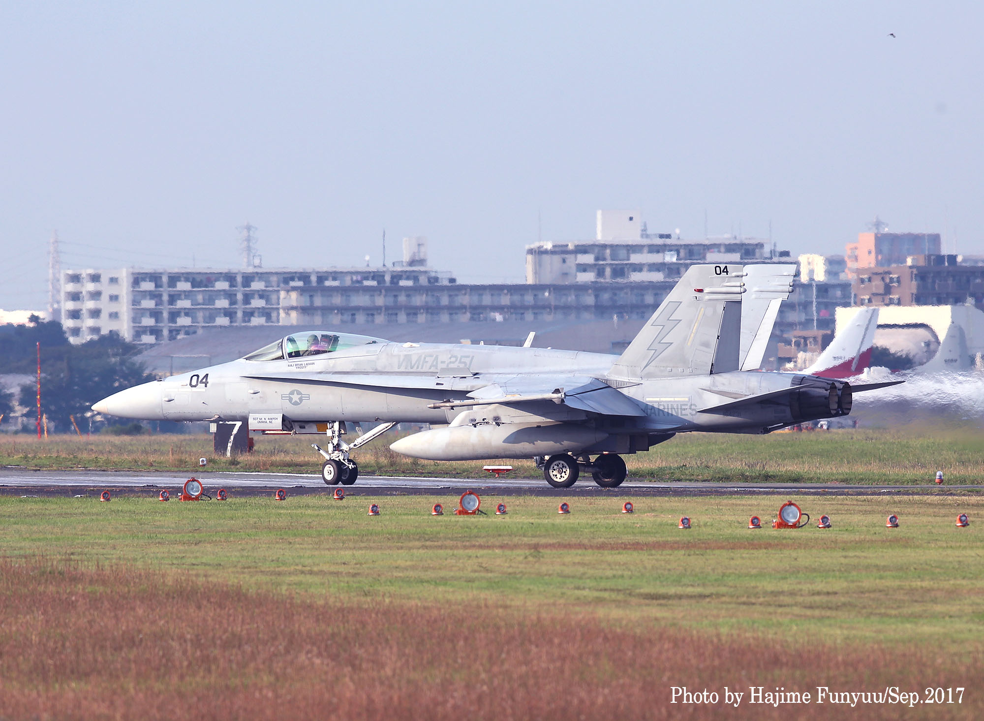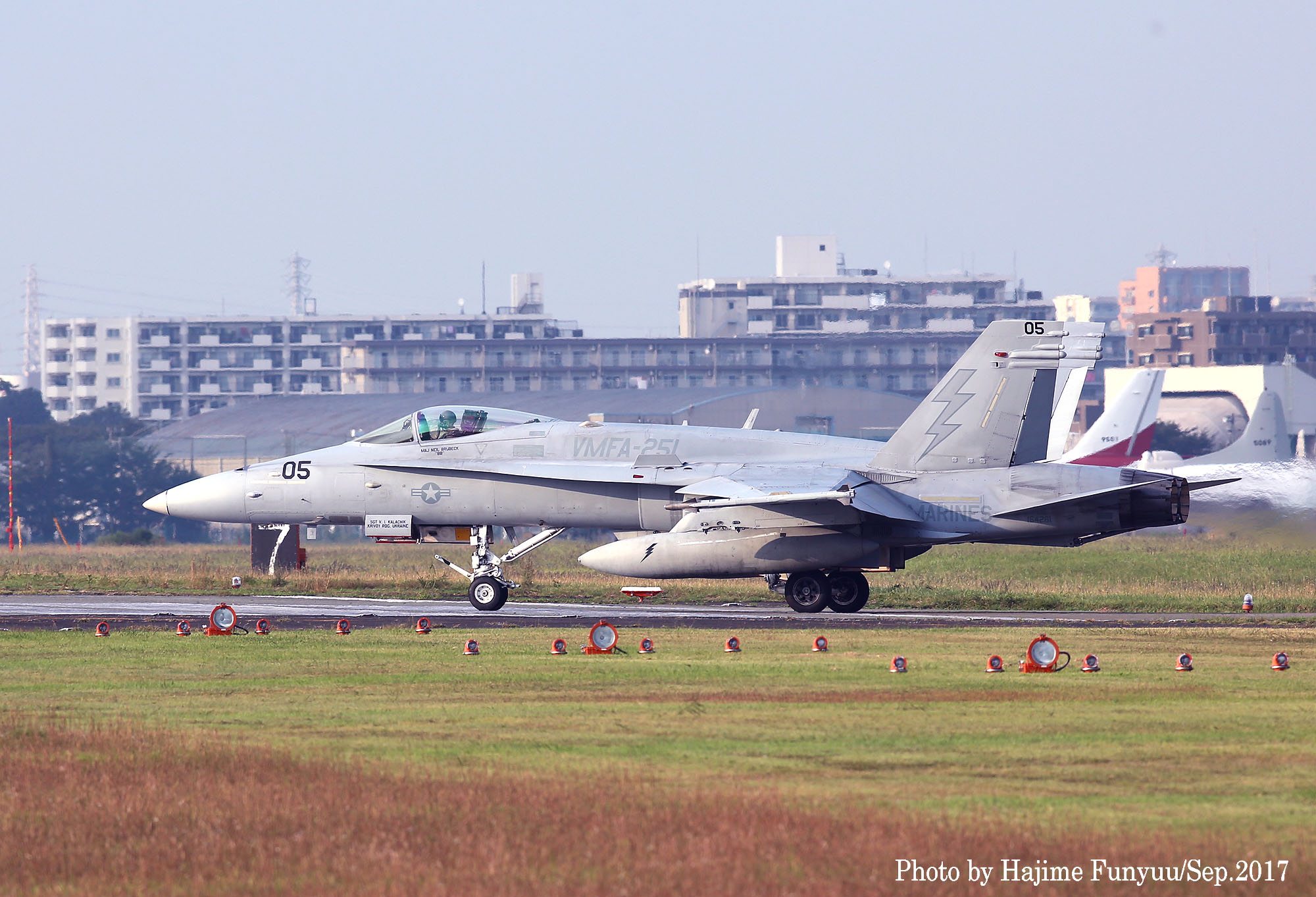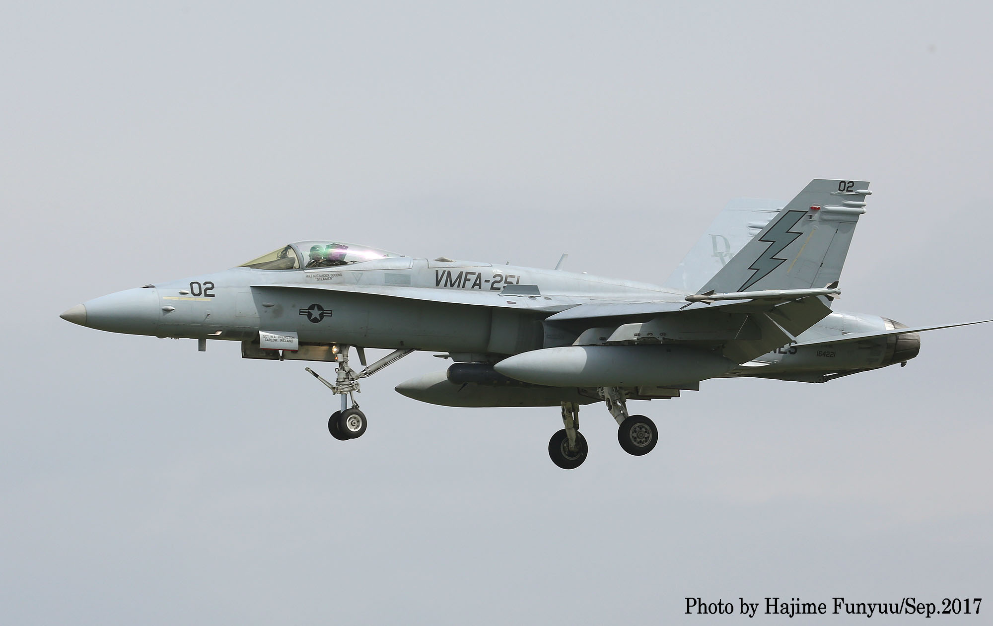 2017年9月13日VMFA-232に替わってVMFA-251"T-Bolts"が岩国にやってきた。FA-18C/D レガシーホーネット12機とアレンE・スコツェペック中佐率いる240人のスタッフの面々である。このコマンダーは、名前からポーランド系のアメリカ人らしいが、Topgunの出身で2003年頃には、VMFA-212に所属して岩国にも来ている。 彼自身は日本へのなじみは深いだろうがVMFA-251自体の日本展開は、いったい何年ぶりになるのであろうか・・・2004年以来だから13年ぶり・・・2004年の前も10年間来ていなかった飛行隊だけに マニアは大喜びである。厚木に展開したT-boltを友人のフニュ君が捉え送ってくれたので早速UPしたいと思う。(2017年11月 記)