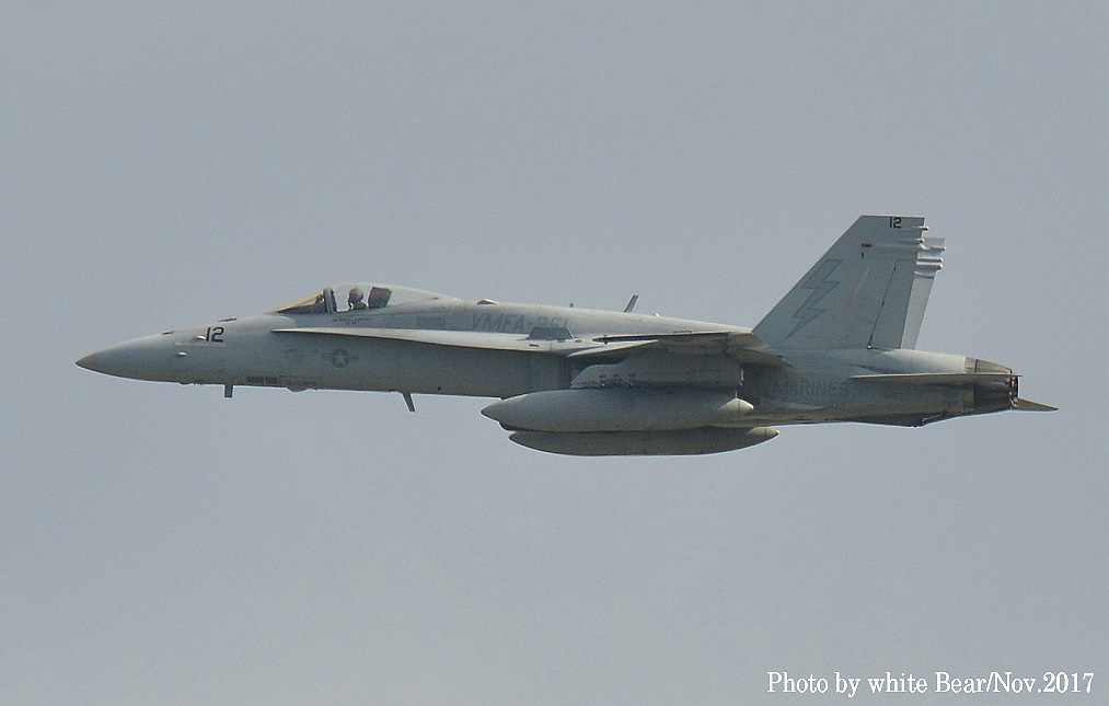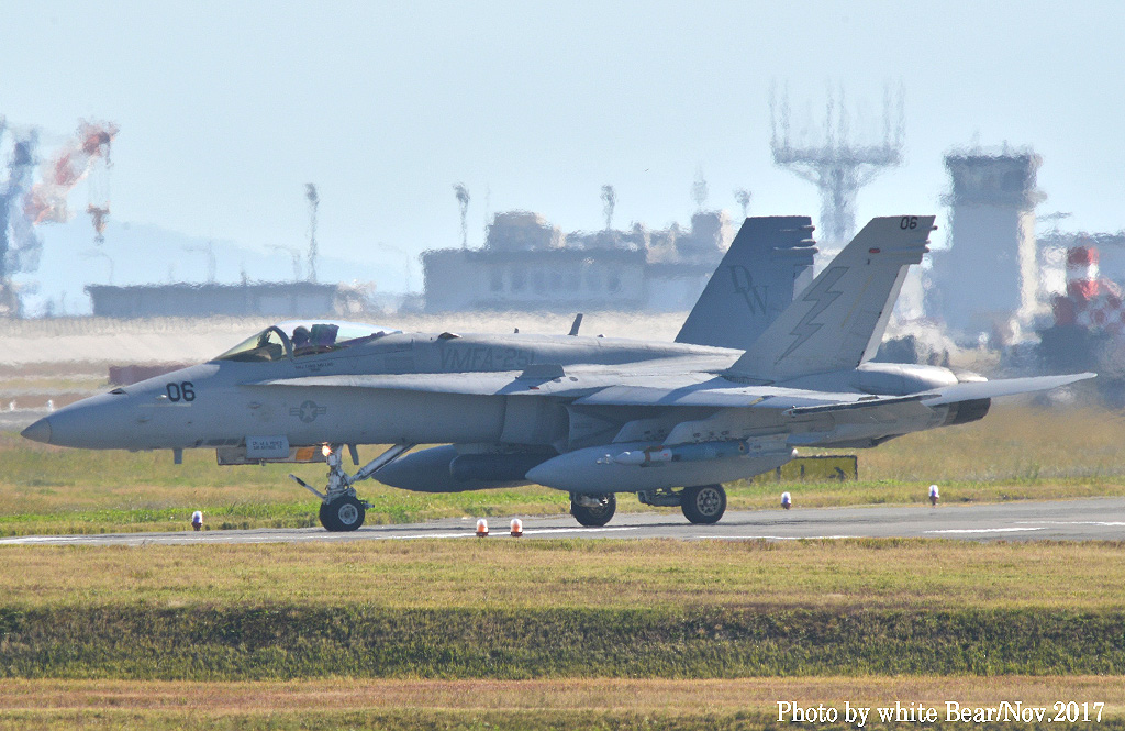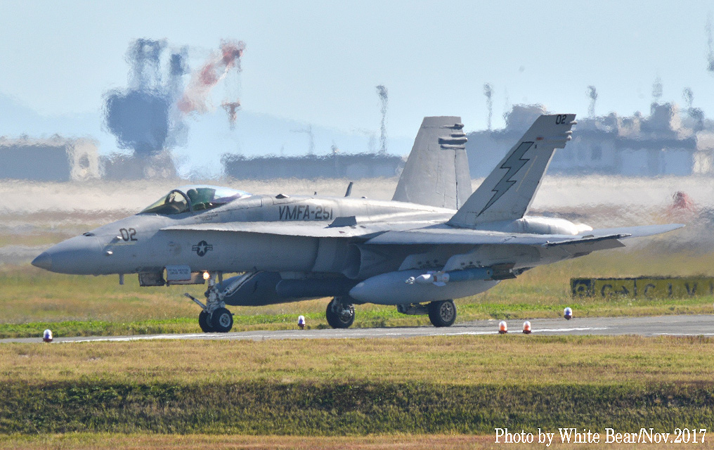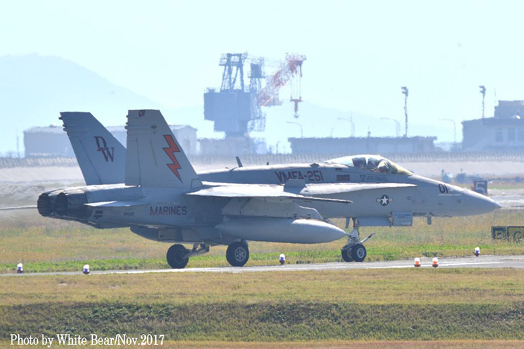 ↑ 2017年11月嘉手納基地に訓練から戻ってタキシーラインに入るVMFA-251のFA-18C/DW-12