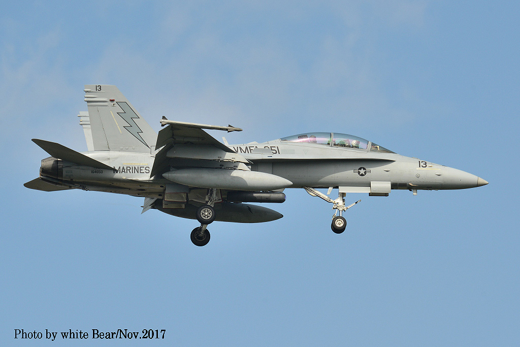 ↑ 同じく2017年9月に岩国基地に配備されたVMFA-251のFA-18の中に、他の部隊で余剰となった複座型のFA-18Dが入っていた。ストライク・ホーネットと呼ばれVMFA(AW)にいた機体だが、F-35Bへの転換が進み余剰機が出た模様で、逆に老朽化で廃棄が進むC型の穴埋めをしている模様。FA-18D/DW-13/Bu.No.164650