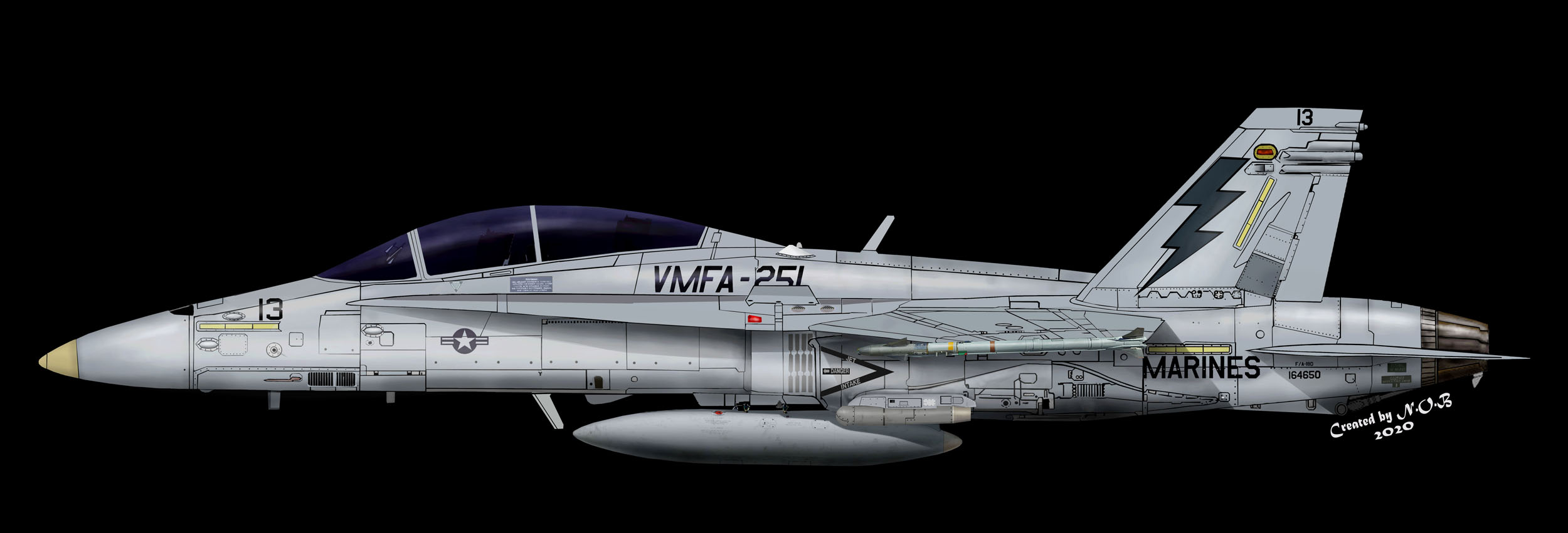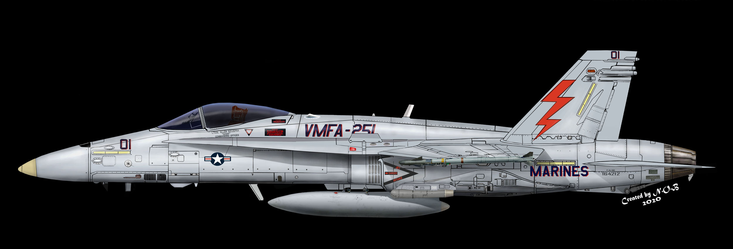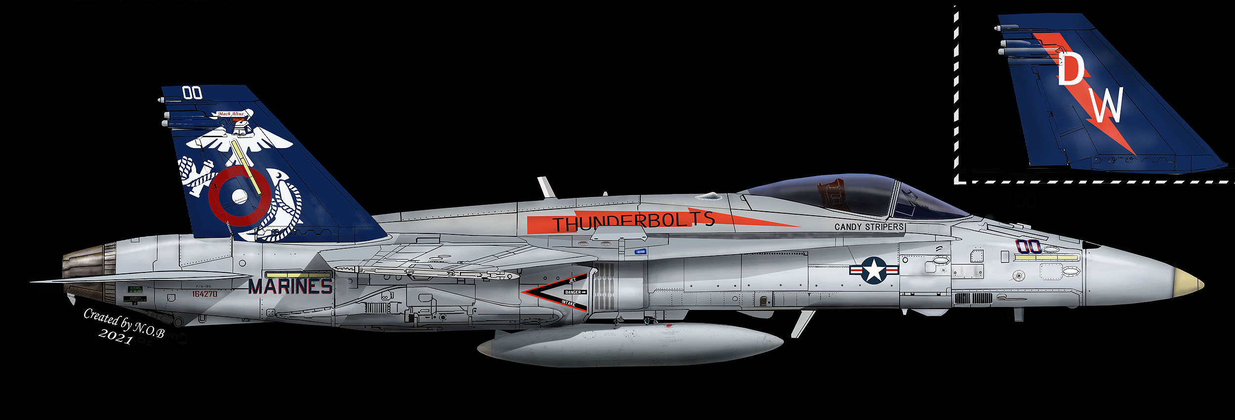 ↑ VMFA-122から機体を引き継いだ後 尾翼の塗装をそのままにとどめて 背中に部隊名と由来する電光を描いたF/A-18C。尾翼の塗装を引き継いだのは、尾翼に書かれているのが、海兵隊徽であり 上部組織MAG-12に対する敬意からと伝えられた。FA-18C/DW-00/Bu.No.164270