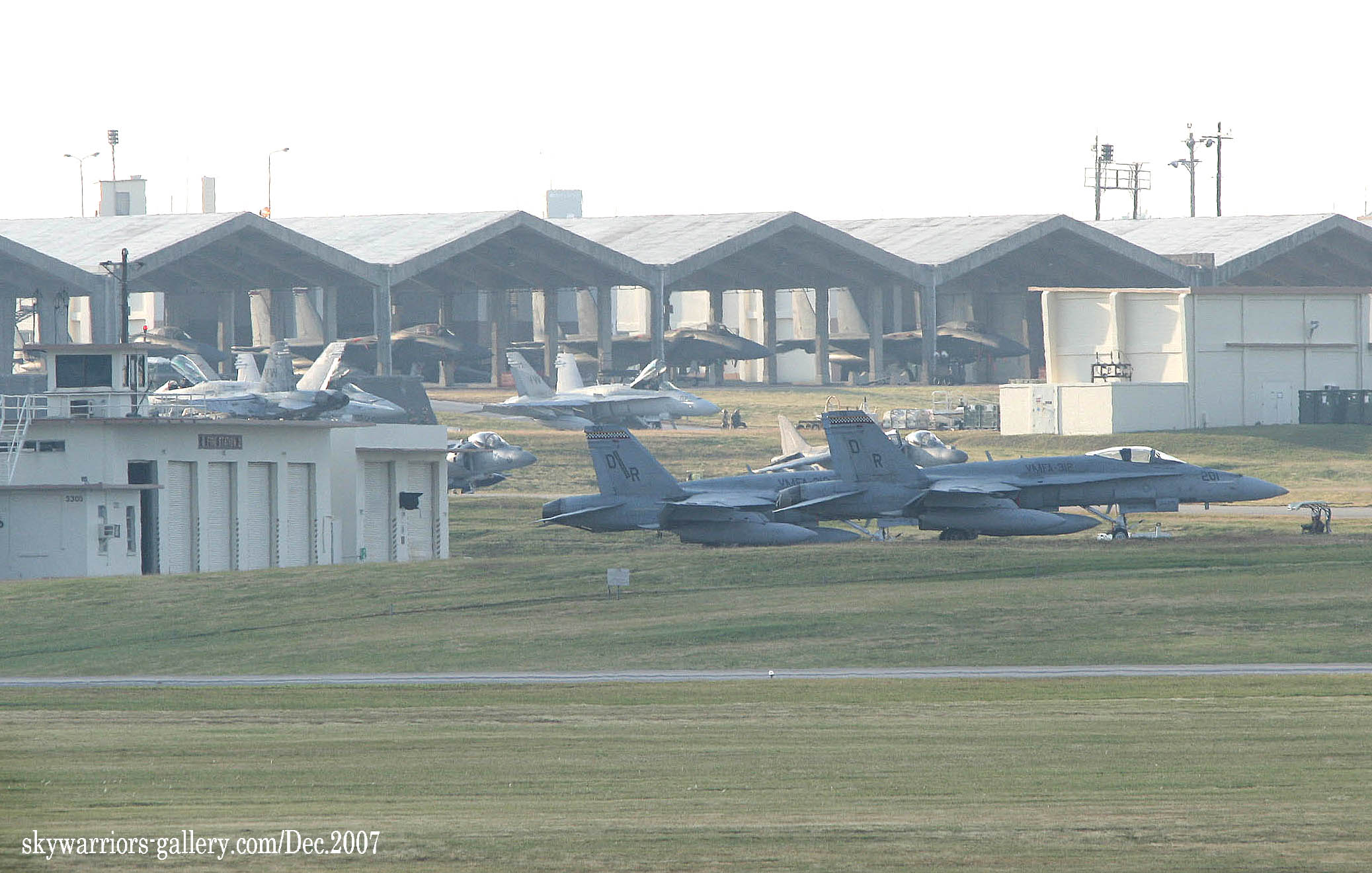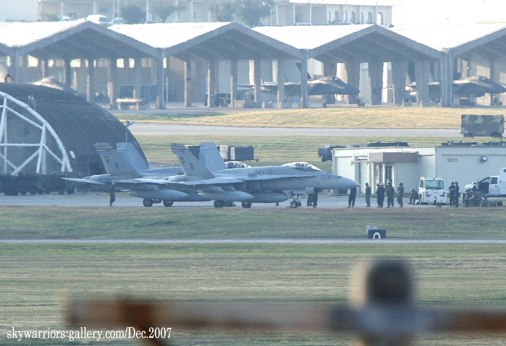 嘉手納で撮影するなら、朝は早くなければいけない。7時半には嘉手納着、まず、いつもの丘に上がり嘉手納を展望、「うむ 2度目の飛行停止となったF-15は、静かにハンガーでお休み中であるが、エプロンには多数の海兵隊機が駐機しており、何やら整備員も出ている。少し期待に胸を膨らませて、エプロンを注視。あれ?F-18の数機はJDAMをぶら下げているではないか、「これはしめたものだ、今週も訓練するぞ。」 しかも、ハリアーまでいるではないの!早速 可愛いEOS-Kissに300㎜(2.8)つけてR/W23側に上がりを撮りに向かう。VMFA-312は、最近殆どお目にかかっていない飛行隊であったから、今回飛来していたホーネット御三家(DR・VW・WD)の中で 一番嬉しかった部隊であった。(2007/12/25 記)