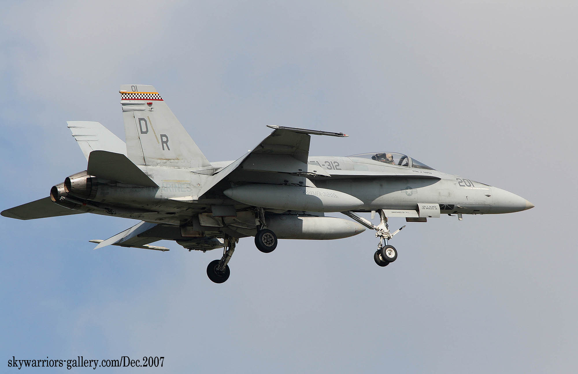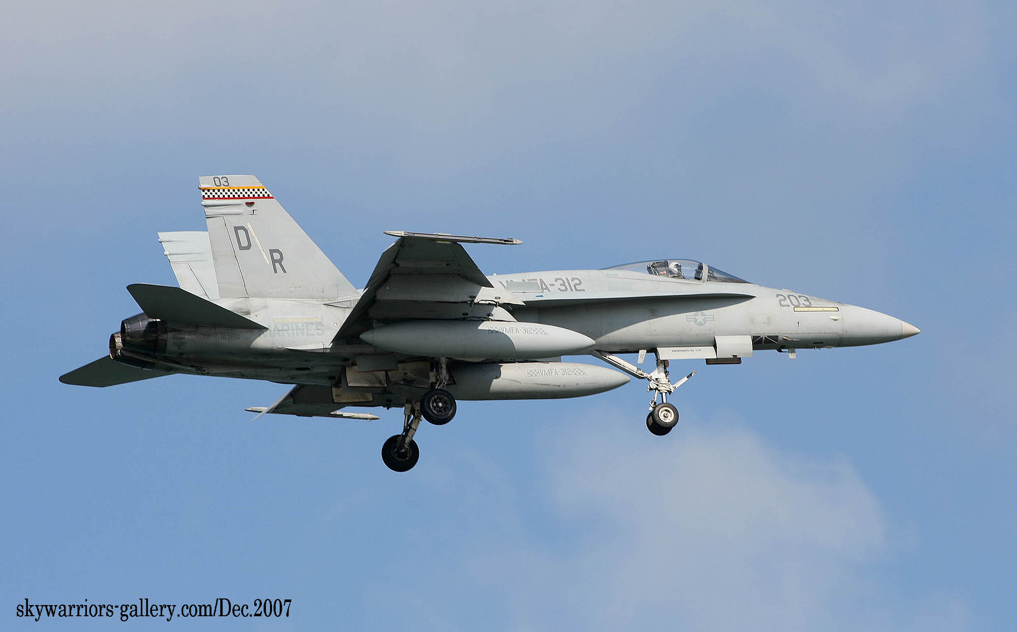 ↑ 2005年初めてフェリス迷彩を施した時の同隊のFA-18Cで、恐らく当時VMFA-312所属機で唯一迷彩をまとったFA-18だったはずである。このマーキングは空母に搭載されて運用中に同隊のデビット・A・ソレンソン軍曹が機体に施した試行的なマーキングとされる。テールコードは、その当時搭載されていた米原子力空母エンタープライズの航空団CVW-1の”AB”が書かれている。IFF付の機体であった。FA-18C/AB-201/Bu.No.163132