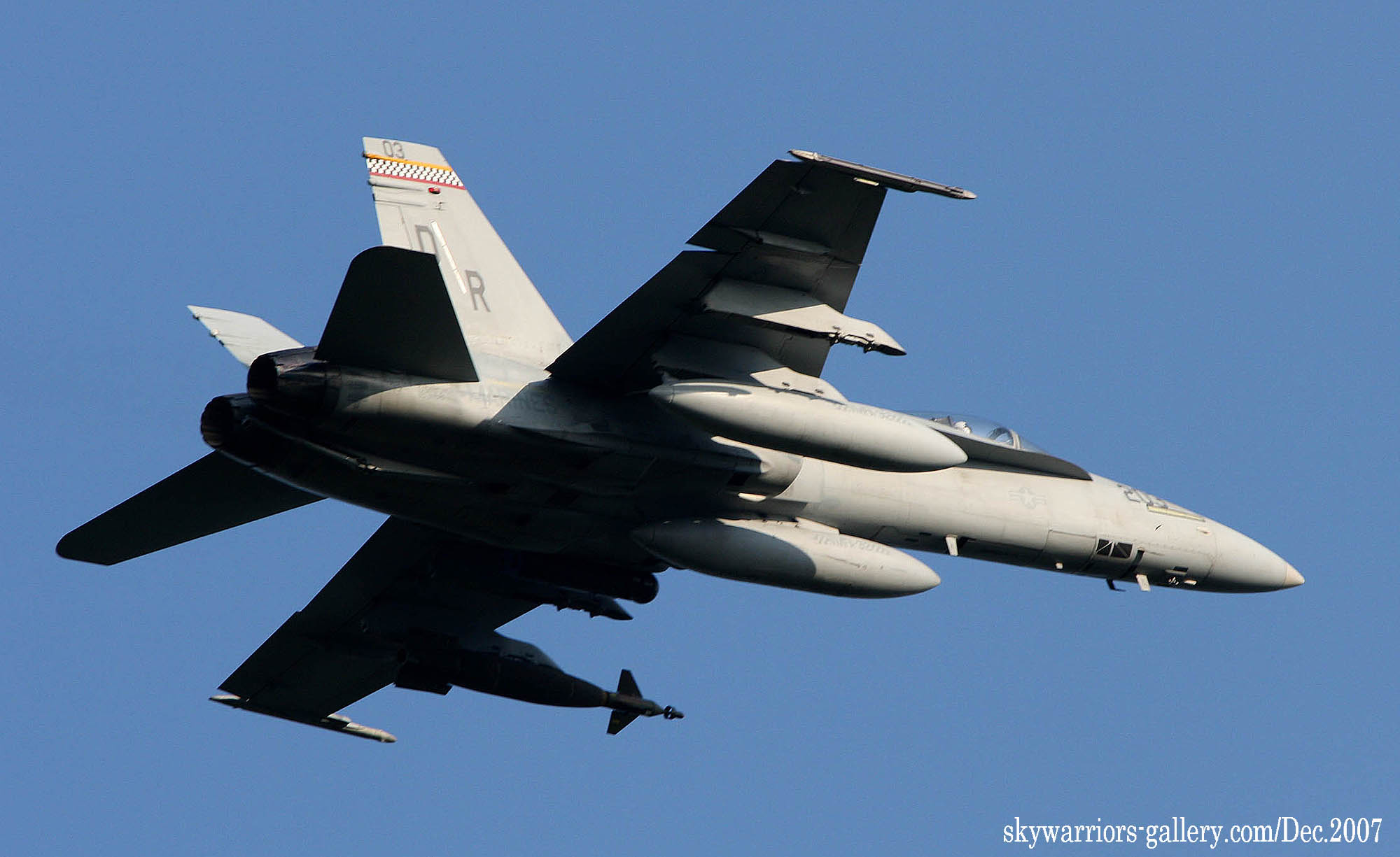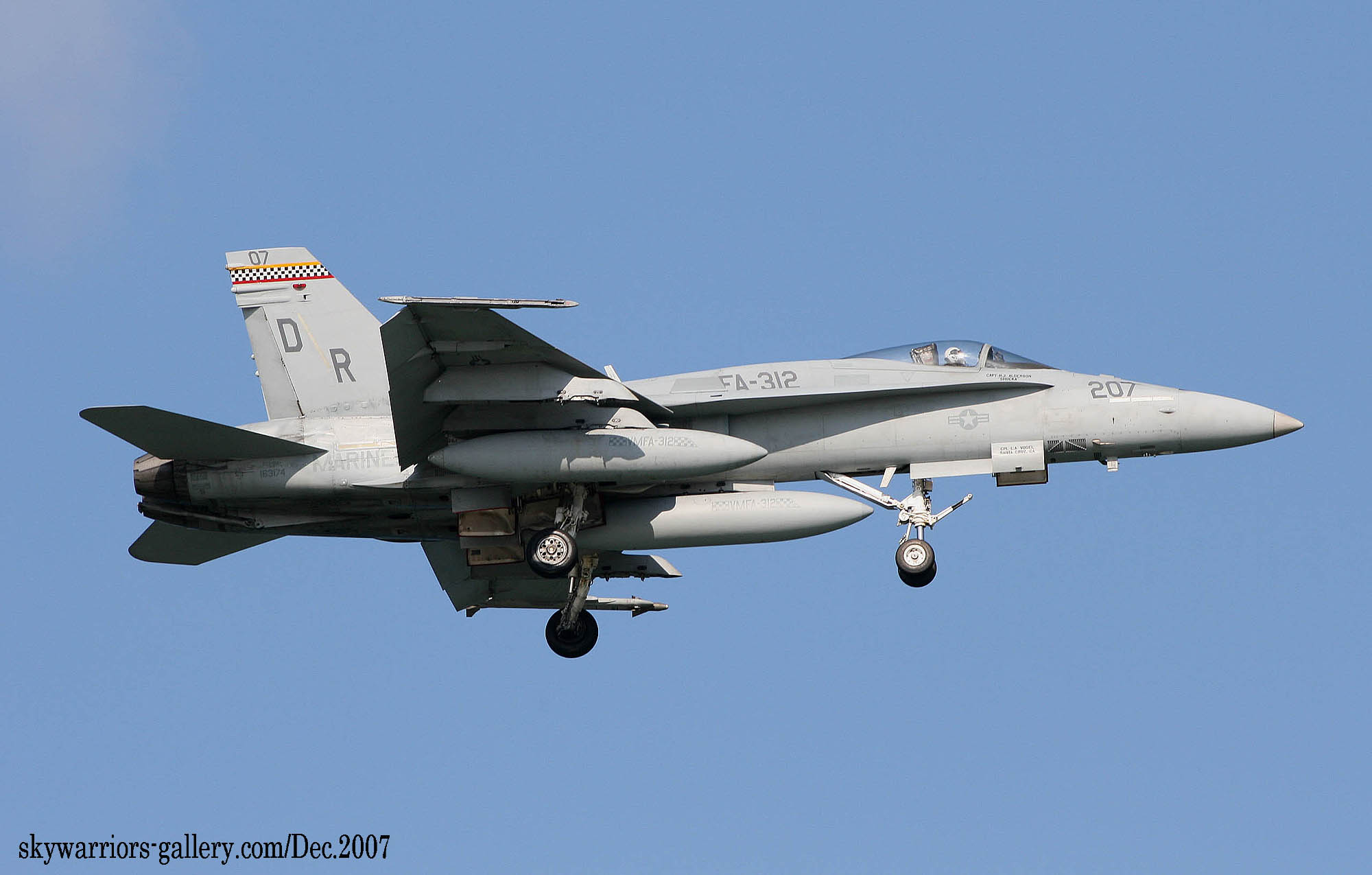↑ 2007年12月 左翼の外側のハードポイントに2000ポンド級のスネークアイレーザー誘導爆弾の実弾を付けてR/W-23Rを離陸するVMFA-312のFA-18C/DR-203
