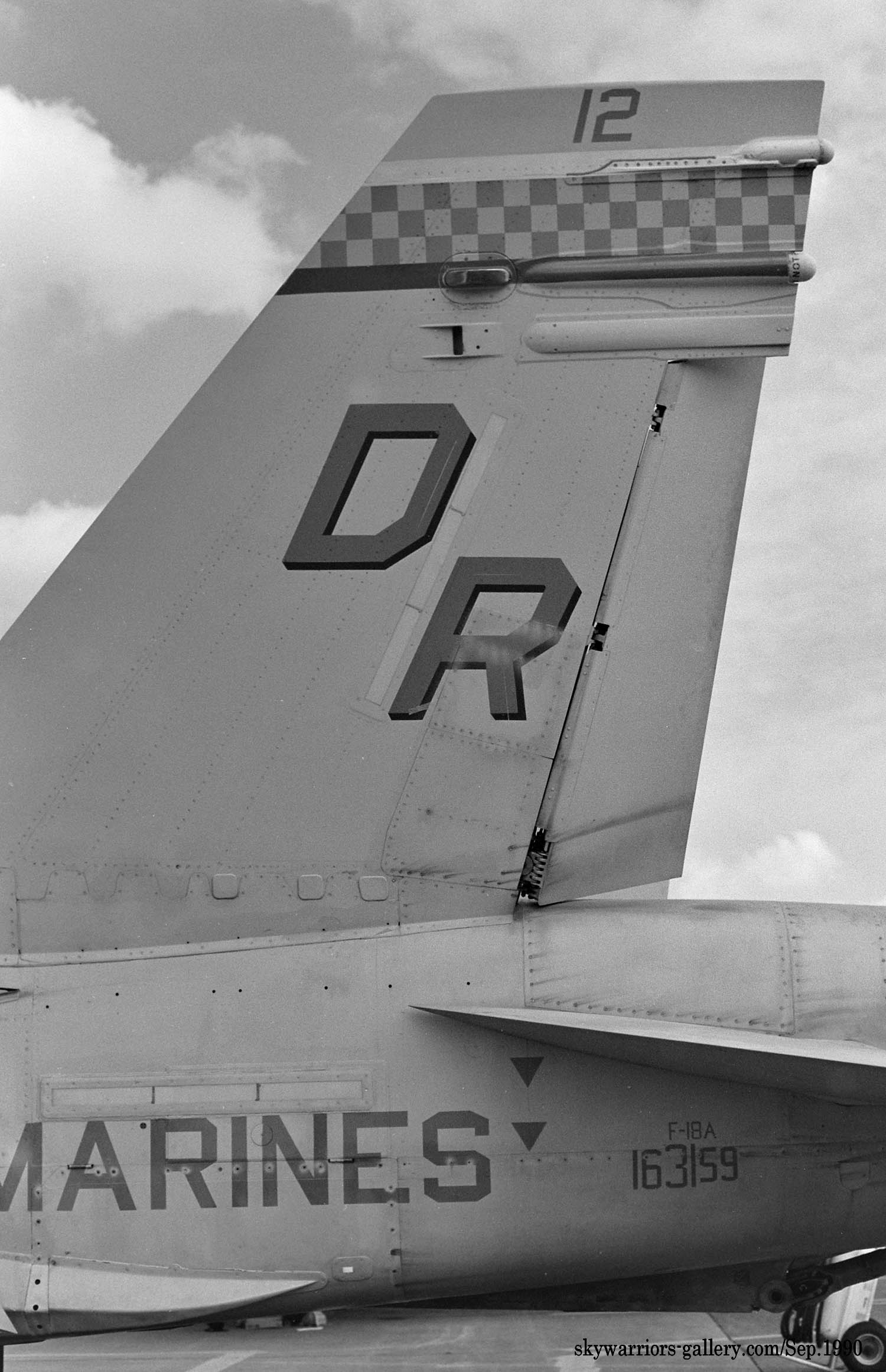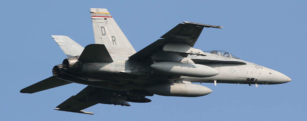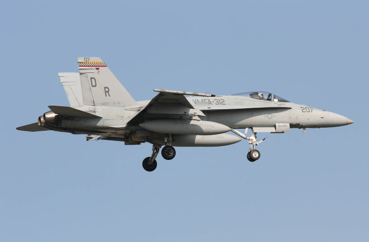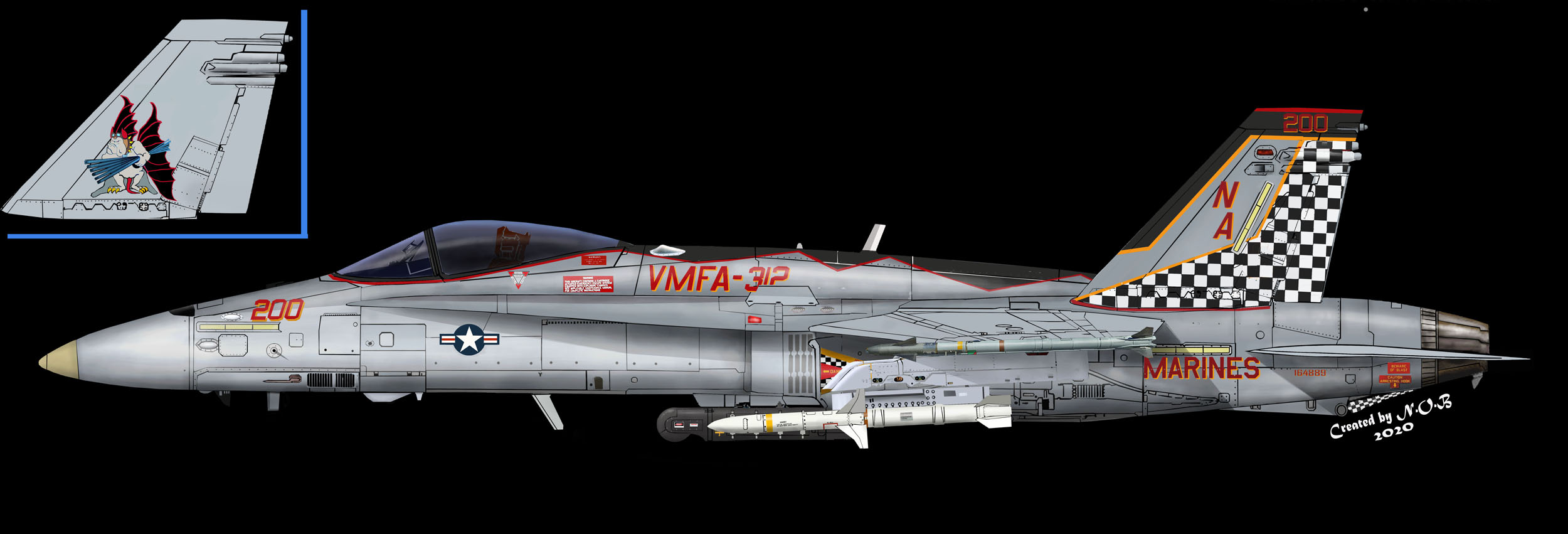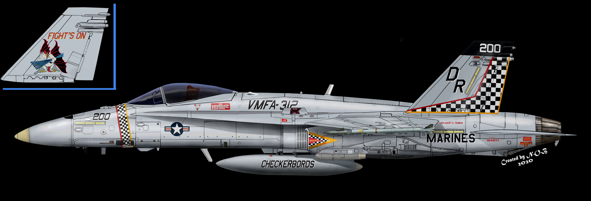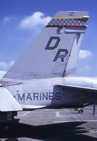 ↑ F-4SからF/A-18Cに機種交換して後、最初に施された派手なチェッカーマーキングがこの機体で、航空マニアが多くの写真を残している2009年に空母搭載の際、CAG指定機として塗られ、尾翼全体を白黒の市松模様として機番やその他注意書きも朱色を用い、海兵隊機で最もエキサイティングな塗装であった。F/A-18C Bu.No.163889 DR-200 搭載空母はUSSハリー・トルーマンCVW-3
