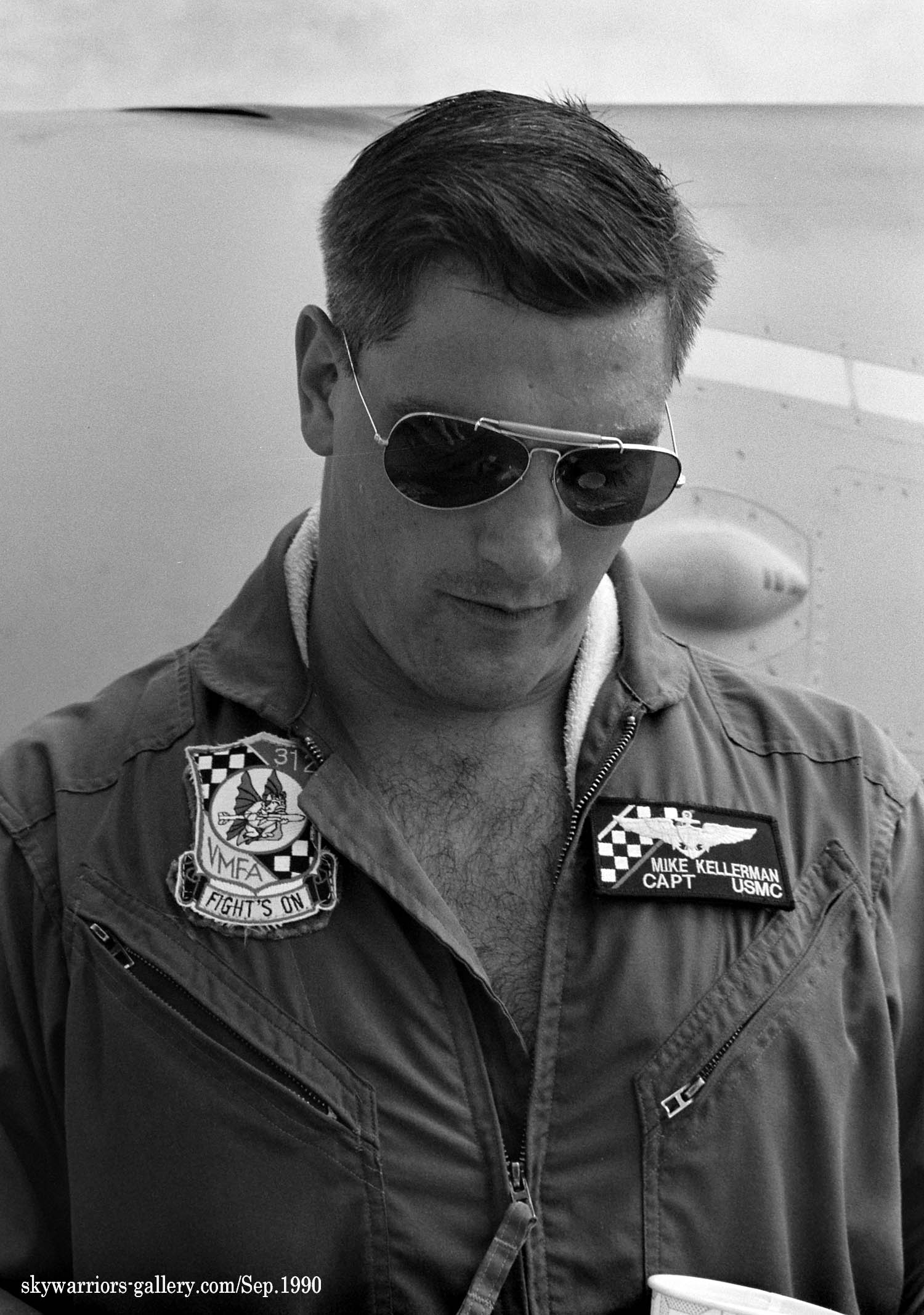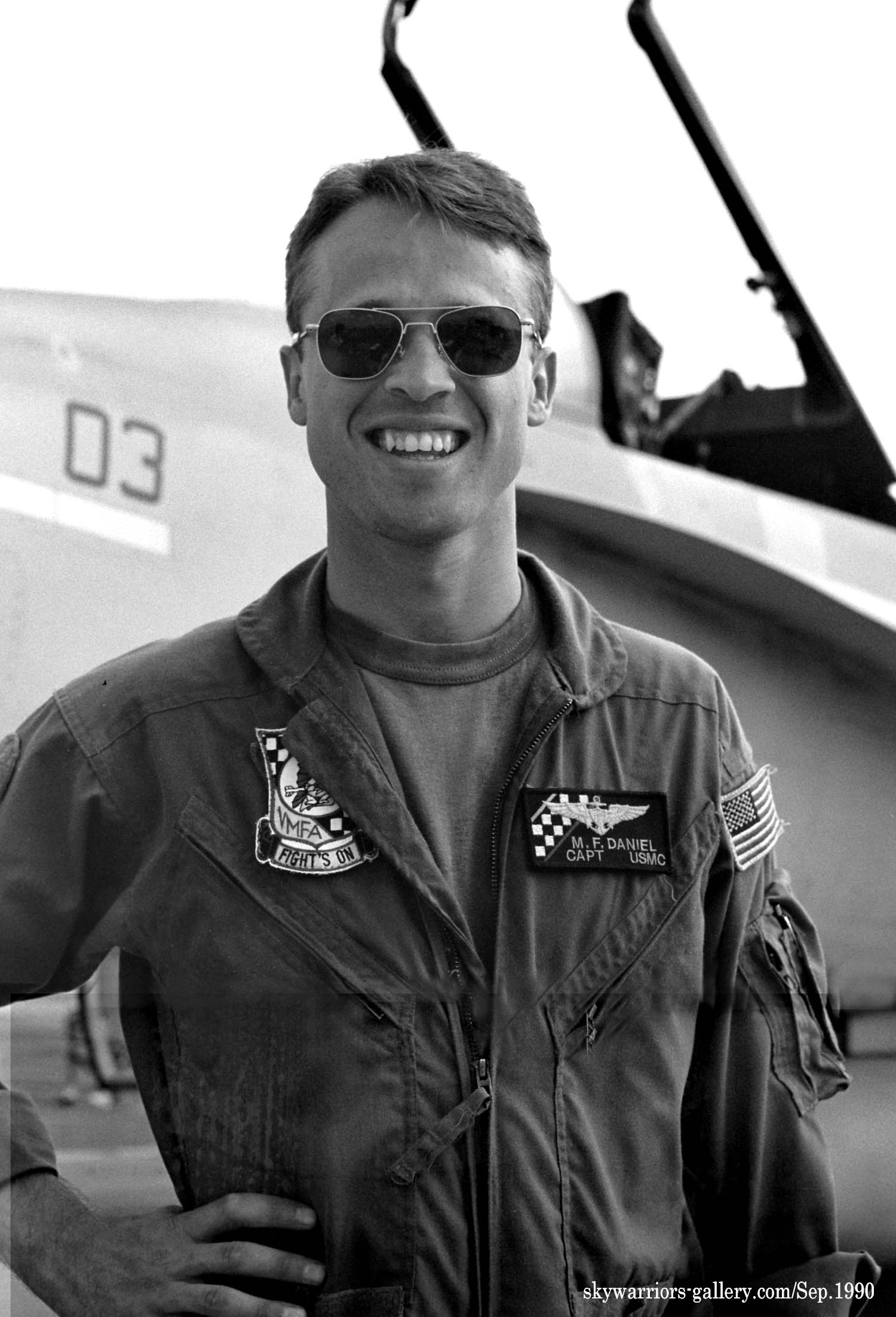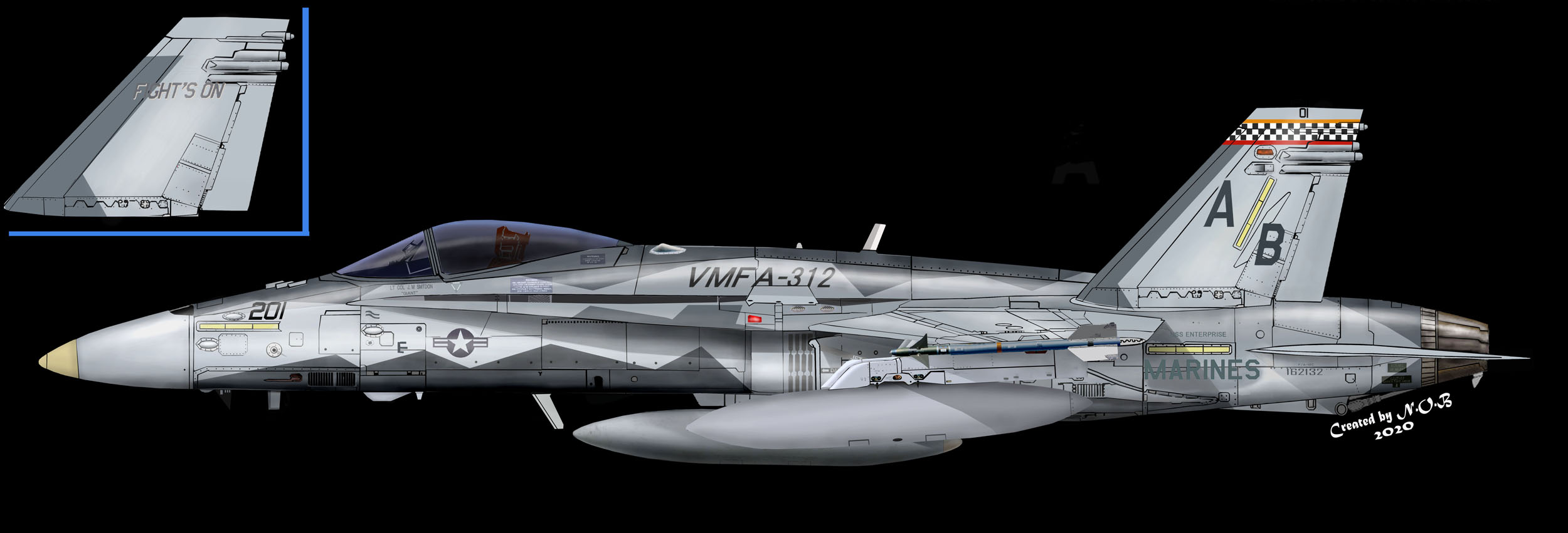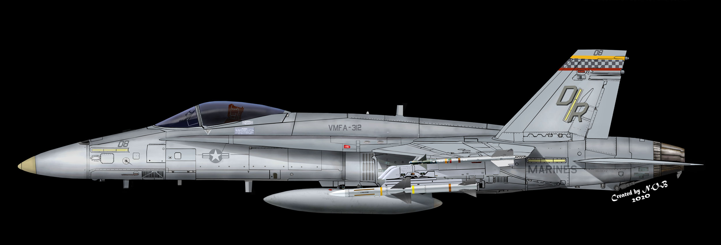 ↑ F-4SからF/A-18Cに機種交換して後、最初に施された派手なチェッカーマーキングがこの機体で、航空マニアが多くの写真を残している2009年に空母搭載の際、CAG指定機として塗られ、尾翼全体を白黒の市松模様として機番やその他注意書きも朱色を用い、海兵隊機で最もエキサイティングな塗装であった。F/A-18C Bu.No.163889 DR-200 搭載空母はUSSハリー・トルーマンCVW-3