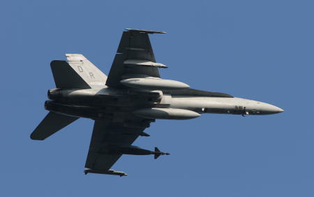 KR-64などのスライドフィルムでは よっぽど光線状態が良くないとF-18の尾翼の下に書かれたバズナンバーなんて殆ど読み取れなかったが、デジカメに変えた途端、こんなテイク・オフでもしっかり読み取れるのである。古い人間は、今更ながら技術の進歩に脱帽なのだ。この日テイク・オフを1/500で撮影していたが、大先輩のW氏が、「N.O.B君、デジカメだったら1/1000ぐらいで撮影した方が良いよ」とアドバイスしてくれた。KR-64時代は、天気が悪いと1/125でテイク・オフも撮っていた私であるが、カメラの自動化がここまで進むと 飛行機を効率よく撮るのも腕より情報のほうがよっぽど重要である。優れたレーダーを持たなかったため敗れた旧日本海軍の艦艇になった気持ちである。