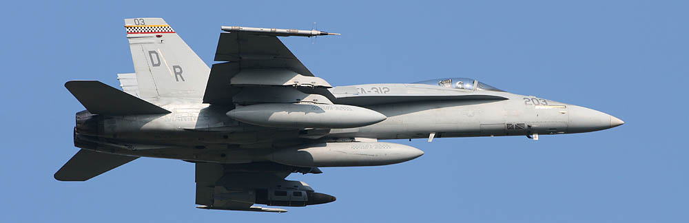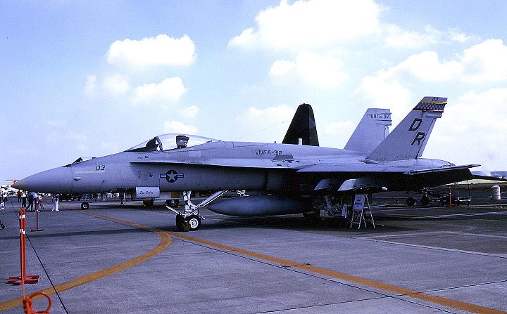 VMFA-312のF/A-18A初来日は1990年7月で、当時のホーネットの部隊にしては珍しく、所属機全機の尾翼に一部カラーマーキングが施されていた。カラーと言っても、グレー色の混じった赤と黄色の2色の薄いラインである。嘗てのトリムラインを構成していた2色であるが、こうした色を全機に施しているホーネット部隊は実に少なかったので、マーキングでは注目された。VMFA-312は岩国への配備回数が少なく、1990年以来ず~と・・日本で姿を見ることはなかった。そして2005年7月、15年ぶりに岩国に駐留したと思ったら、翌々年2007年9月に再び岩国配備となる等、ここ最近は漸く日本にも馴染んできた?部隊だ。