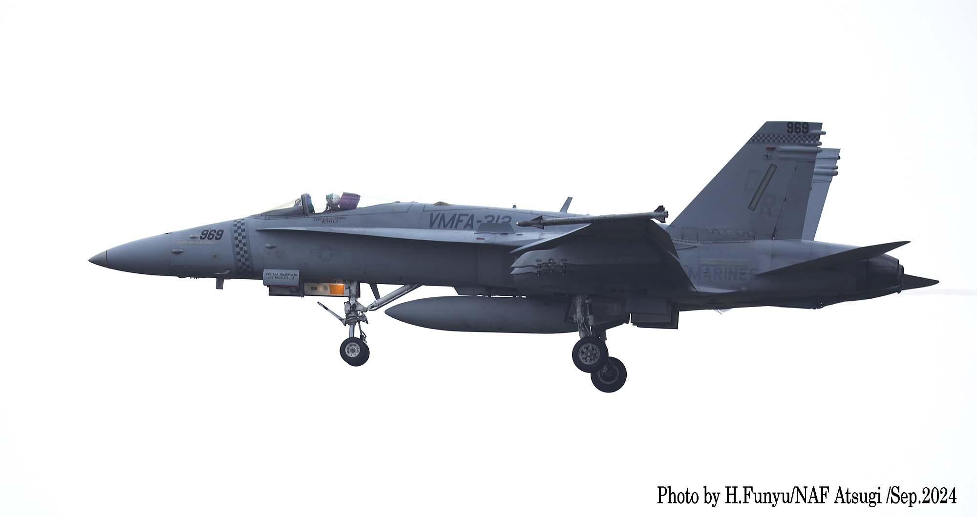 ↑ もう数も少なくなってきたFA-18C/Dの部隊は、以前の様に部隊単位で二桁又は三桁の機首番号(Modex)で揃える事もなく、ビューアルナンバー下三桁を機首番号に使っていることが多い。このFA-18C/Bu.No.164969は、2024年5月のチェリーポイント海兵隊基地で展示機として並べられた機体。
