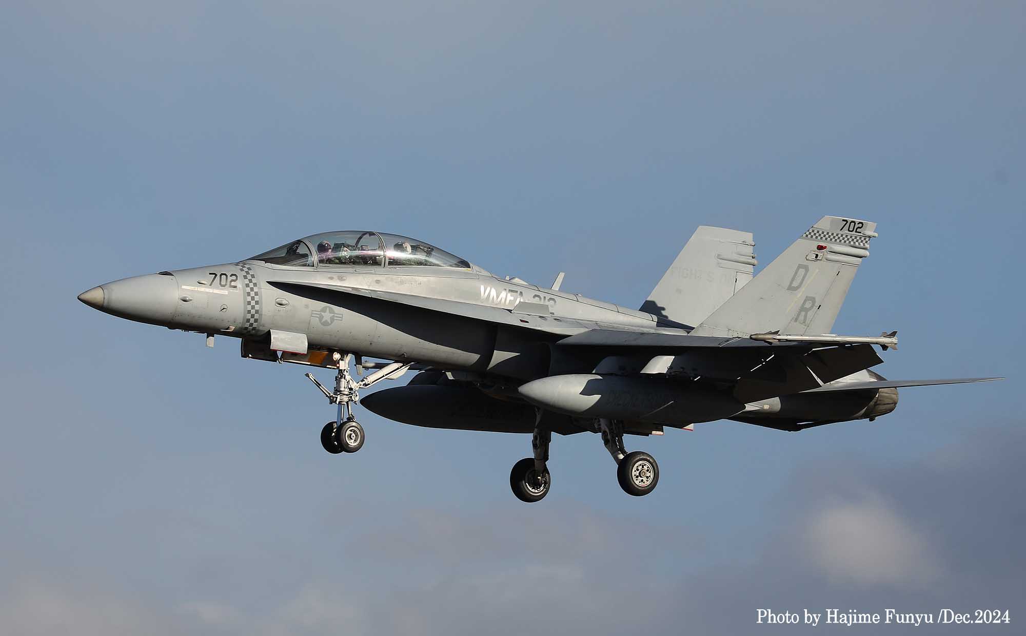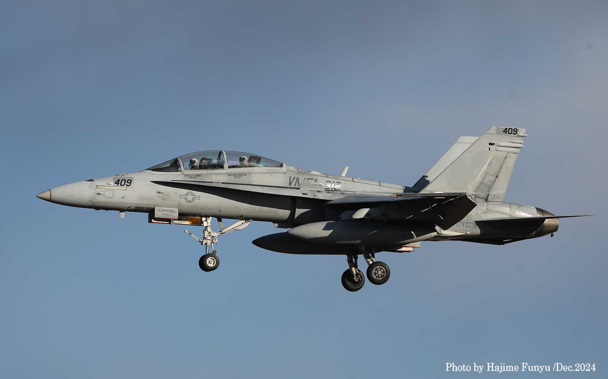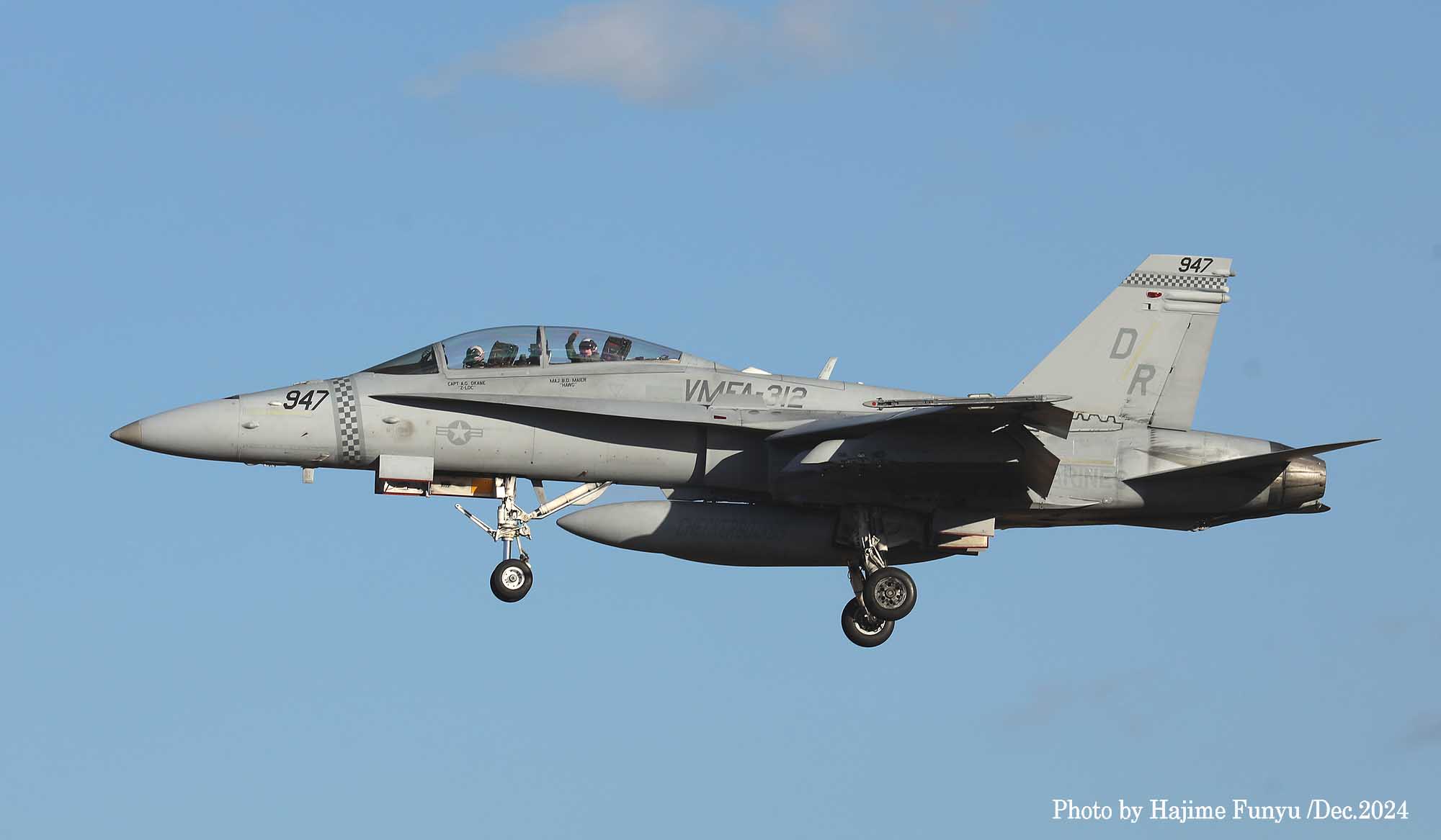 ↑ 2024年12月14日午後3時の飛来となったが、内3機は複座型である。この飛行隊も近い内にF-35Cに更新が予定されている。