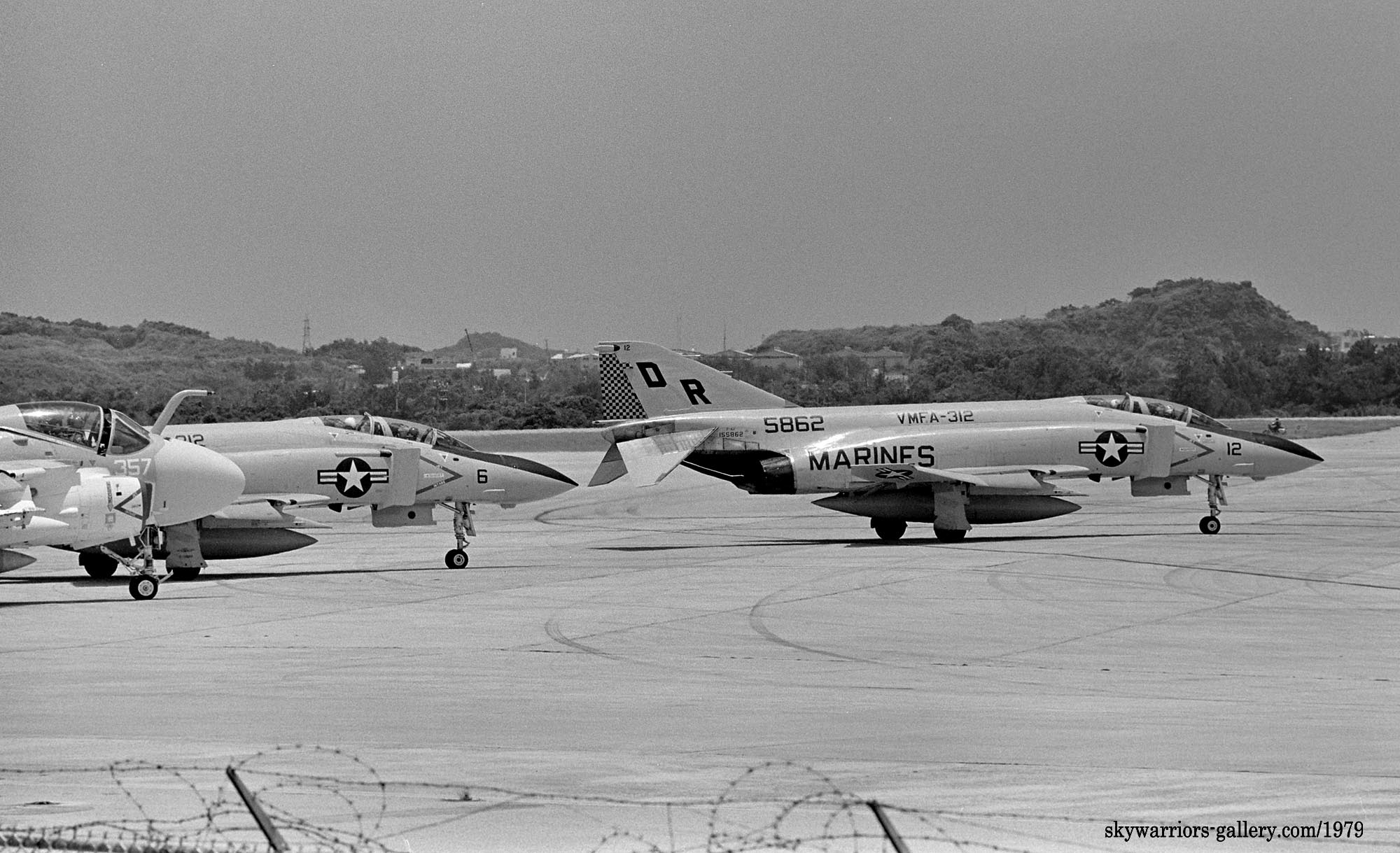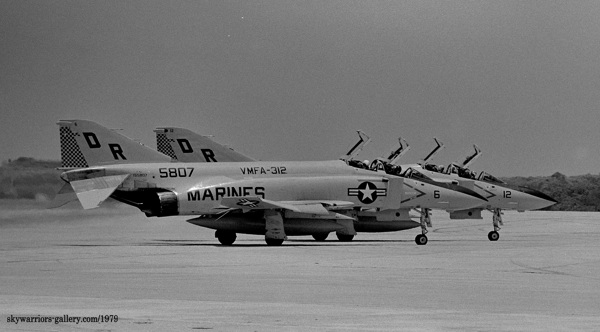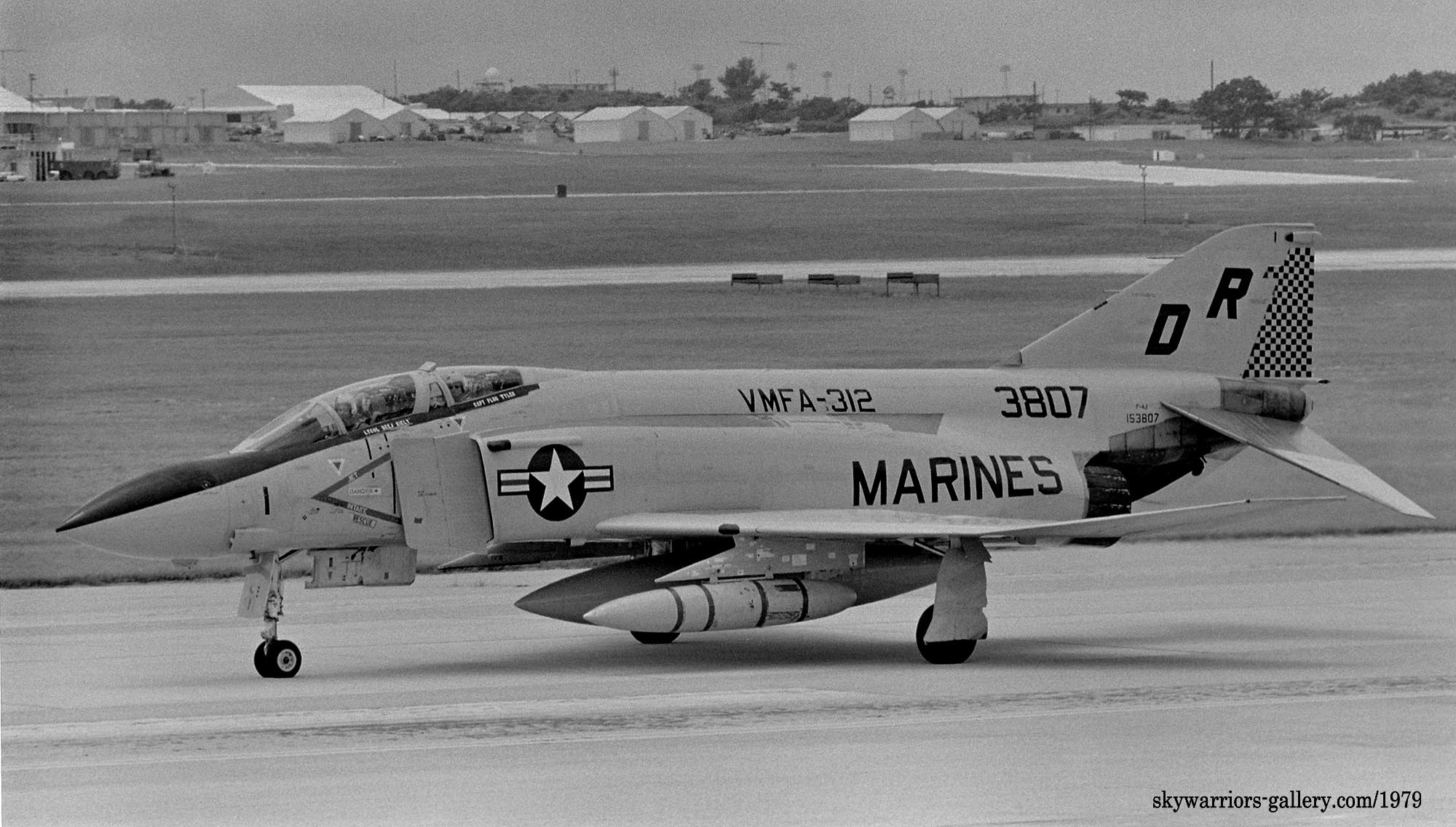 ↑ F-4Jになって初めて岩国基地に配備され、1979年6月に嘉手納基地に初飛来している。尾翼のチェックは、1943年に当時のVMF-312が逆ガル翼の名機 F4U-1コルセア戦闘機のエンジンナセルと尾翼ラダーに付けた市松模様から継承されている。