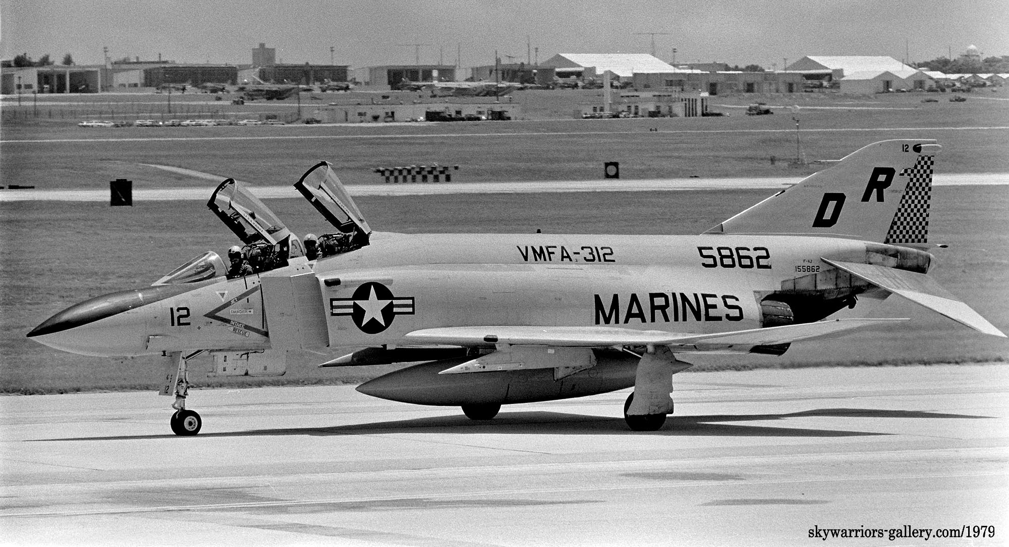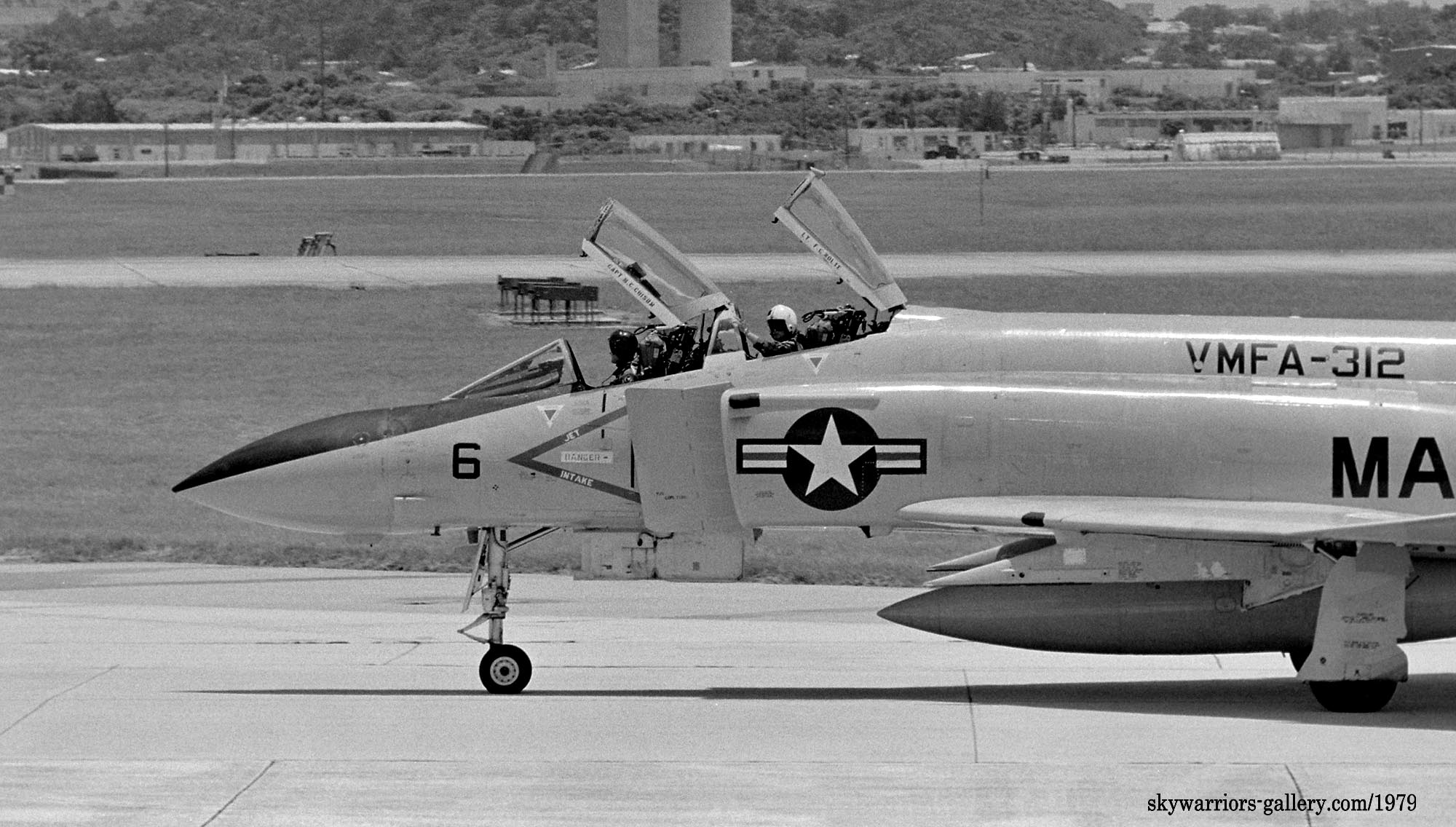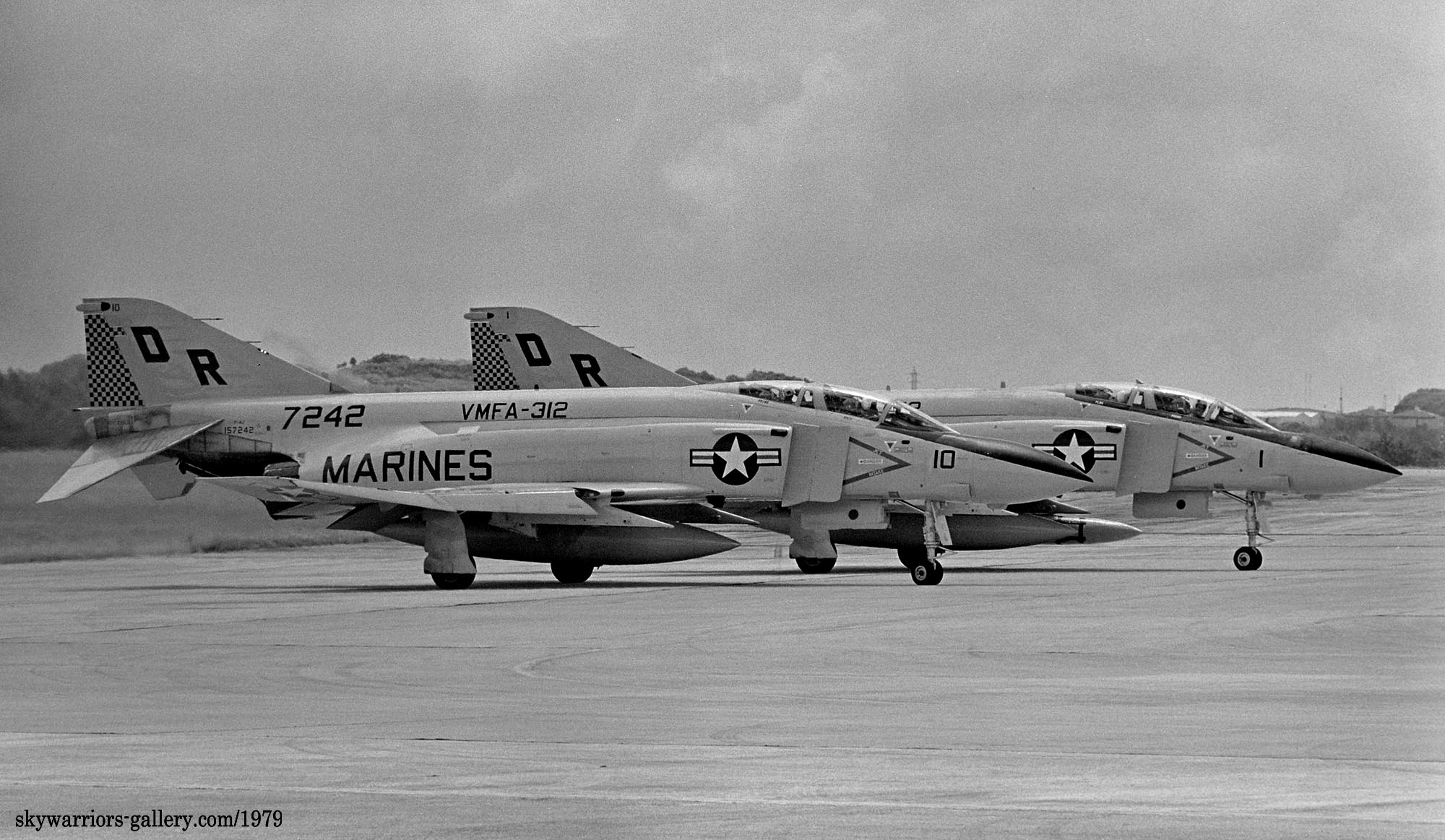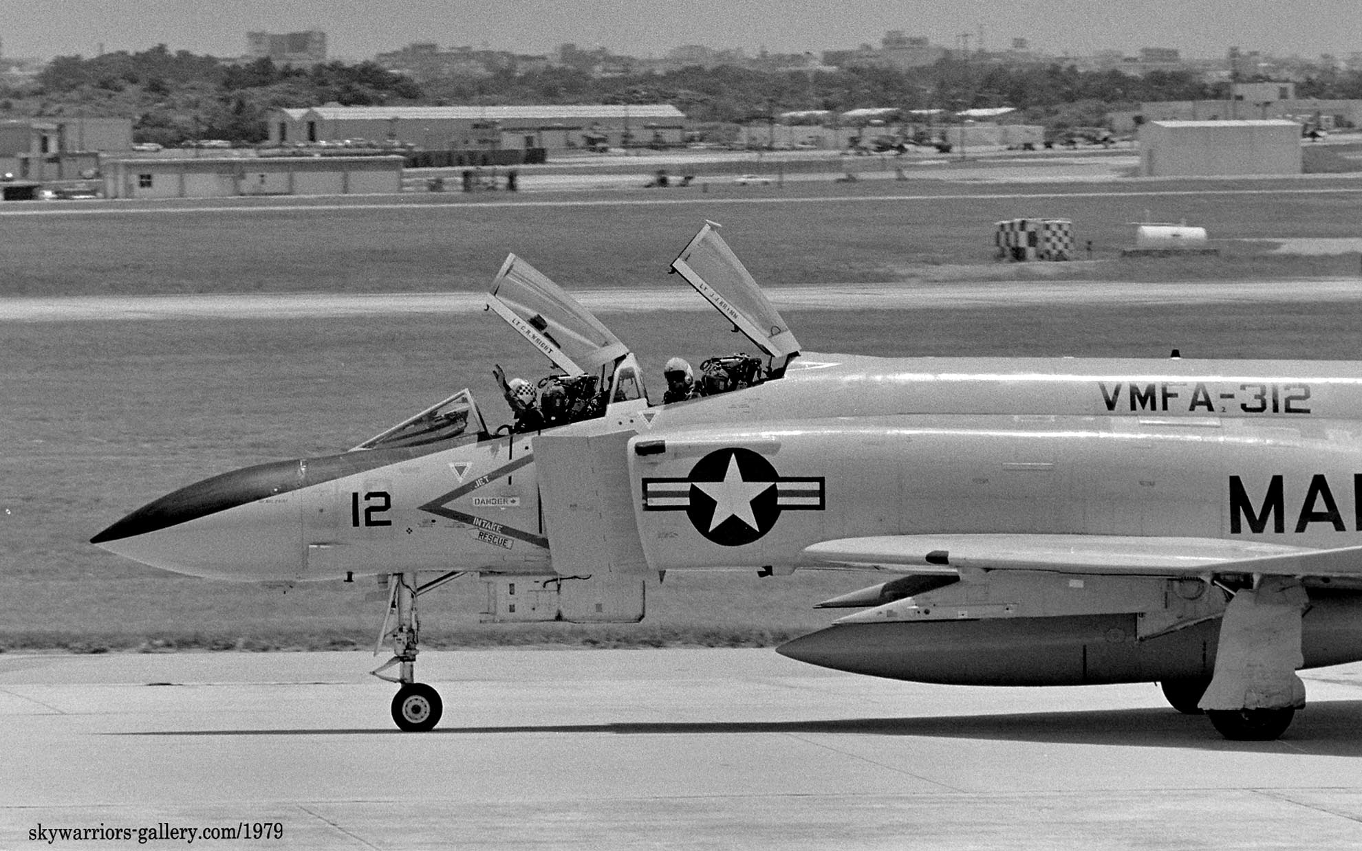 ↑ F-4Jになって初めて岩国基地に配備され、1979年6月に嘉手納基地に初飛来している。尾翼のチェックは、1943年に当時のVMF-312が逆ガル翼の名機 F4U-1コルセア戦闘機のエンジンナセルと尾翼ラダーに付けた市松模様から継承されている。