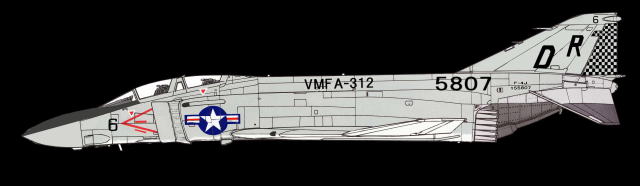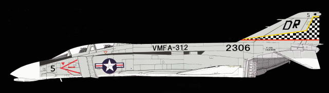 VMFA-312は、その名前の如く、尾翼を白黒のチェッカーで飾っていたが、特にF-4B/N時代はチェックのストレーキが尾翼前縁まで伸びており、上下のトリムラインはイエローとレッドで飾った。このトリムラインはFA-18になって再び蘇っている。
