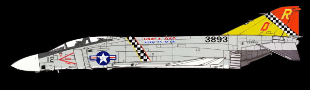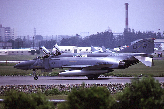 以前VMFA-312は、チェッカーボードの部隊名の通り 白黒のチェックを大きく尾翼に描いていたものの 来日時は、すでに主流になり始めたロービジ塗装を採用 グレーの機体に細かい黒のチェックを入れての登場であった。以前のような派手さには欠くが、嘉手納を訪れていたマニア諸氏は一様に感激してシャッターを切ったものである。その後 S型ファントムになってからも岩国に駐留しているが、チェックはグレーの濃淡と益々醜くなっていた。VMFA-312は 1987年にFA-18Aホーネットに更新し 再び岩国を訪れるが、長い間忘れ去られていた赤と黄のトリムラインが、再び復活しているのには驚いたのものである。(2002/6 記)
