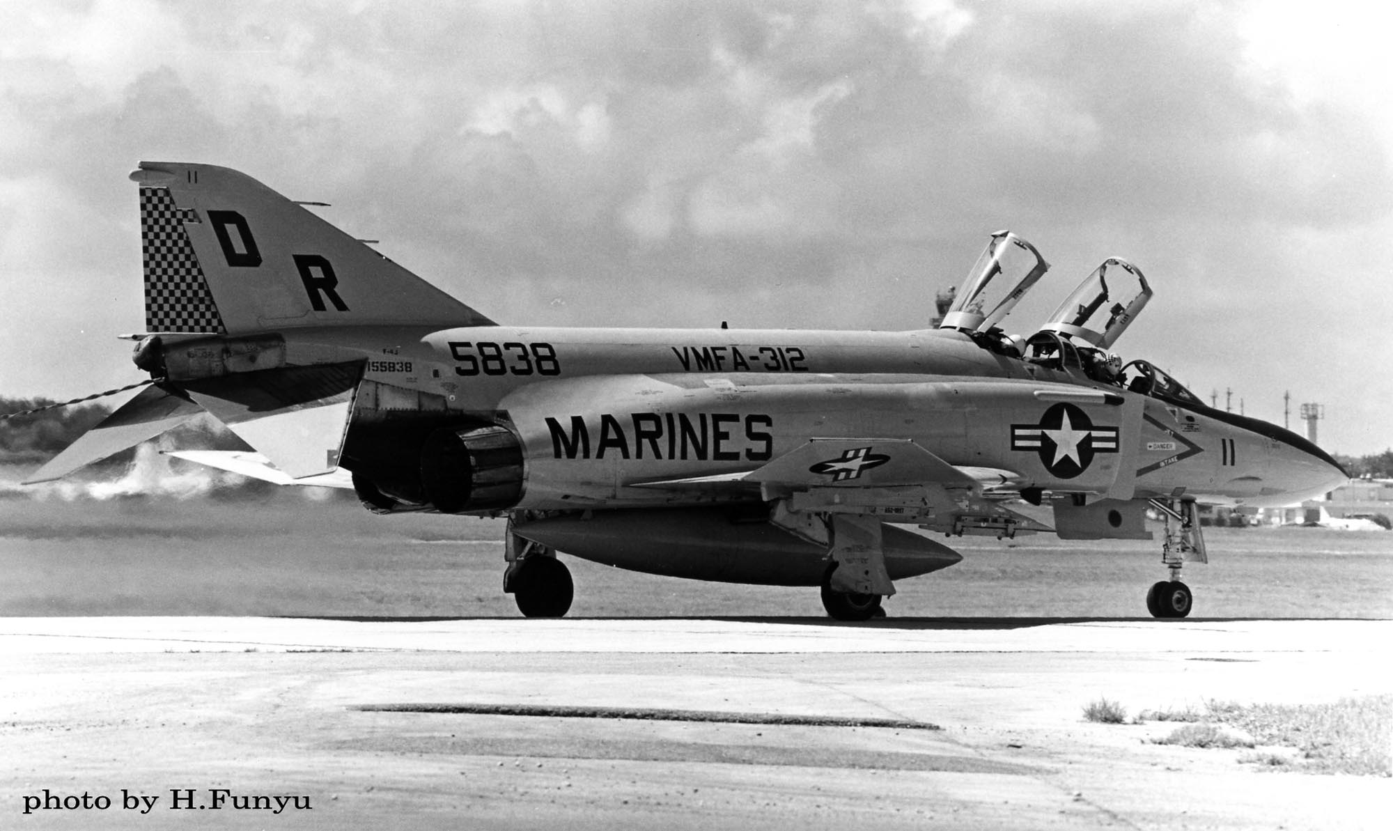 VMFA-312は、チェッカーボードという部隊名である。まるで標的曳航を専門に請け負う飛行隊のようなネームとマーキングの部隊だ。VMFA-312は1966年にビューフォートで設立され、F-8クルセダー時代も時折日本に飛来もしたそうだが、1979年の夏にF-4Jを装備してから、初めての岩国駐留を半年行った。それまでは雑誌の中でしか見る事のできなかった部隊だったので、嘉手納に初飛来した時の興奮は今でも忘れない。下のサムネール内に嘉手納基地のR/W23Rにフォーメーションでタッチダウンしている写真を掲載したが、それがF-4Jとなってから、嘉手納初飛来の時のものだ。