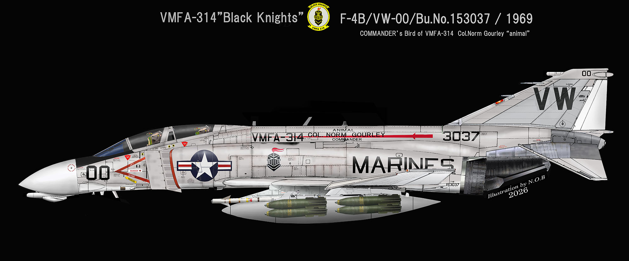 ↑ 1969年時のVMFA-314の司令官指定機VW-00。この時の司令官機は同隊の背中に司令官名グォリー大佐名「Col. Norm Gourley」が記入され、彼のニックネームであった「ANIMAL」も書かれていた。この司令官機に名前が書かれていたのはこの部隊だけではないが、VMFA-314