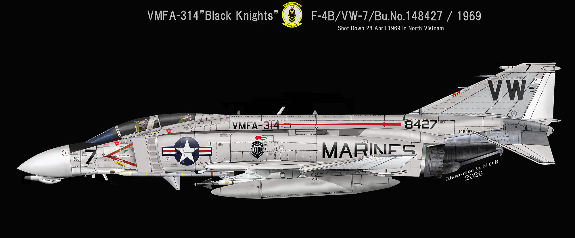 ↑ 同じくベトナム戦で使われたVMFA-314のF-4Bで、この機体は1969年4月26日チュンライから飛び立ったが、北ベトナムで撃墜されているが、撃墜の原因は不明である。パイロットのガーゼック大尉とWSOのマッセイ大尉は死亡したものと思われる。F-4B/VW-7/Bu.No.148427