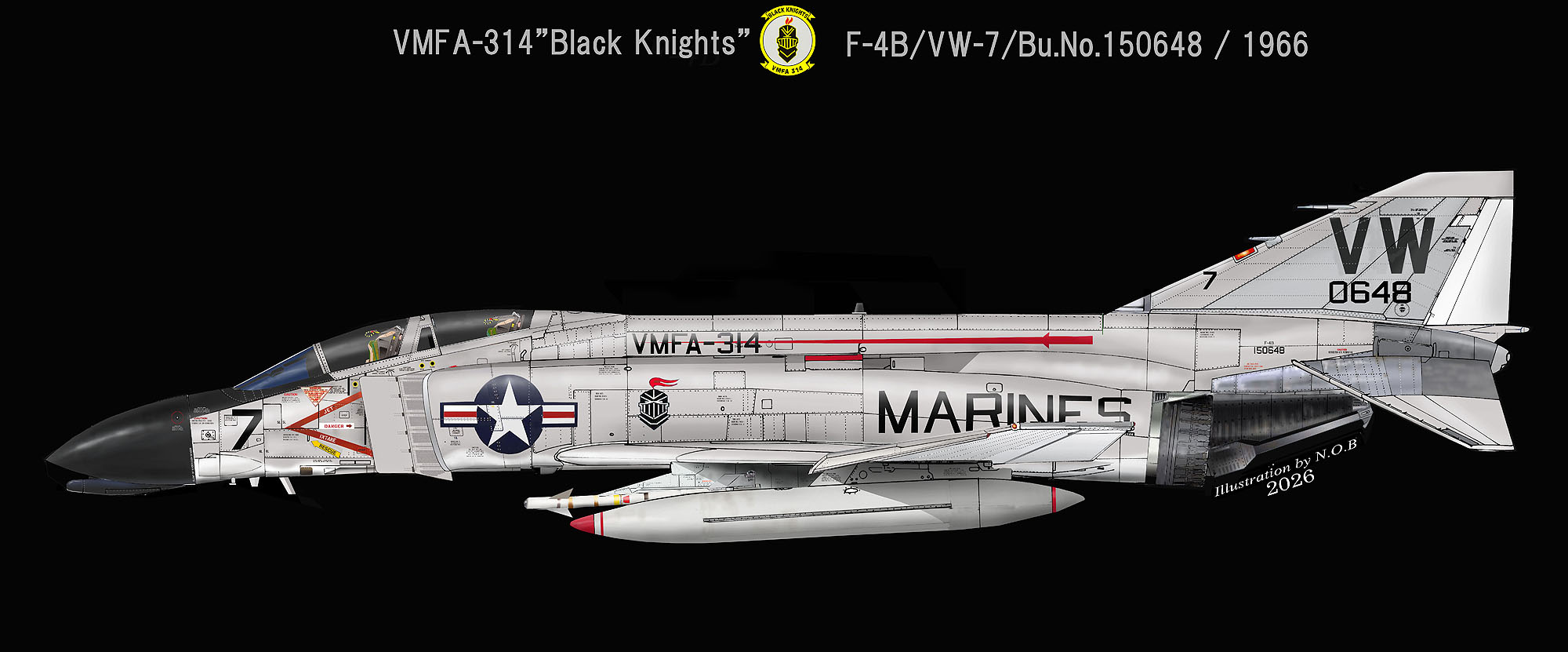 ↑ ベトナム戦争に駆り出され、最初のベースとなった南ベトナムのチュンライ空軍基地で活躍していた頃のマーキングで、黒いレーダーコーンを付けていた機体。ビューアルナンバー下4桁が、尾翼に書かれているのも変わっている。増装タンクも初期のもので、この頃は空対空ミサイルは、AIM-9Bを使っていた。F-4B/VW-7/Bu.No.150648。この機体は後にVMFA-323に移管され、AAAで損傷を受けながらもダナン基地で活躍している。