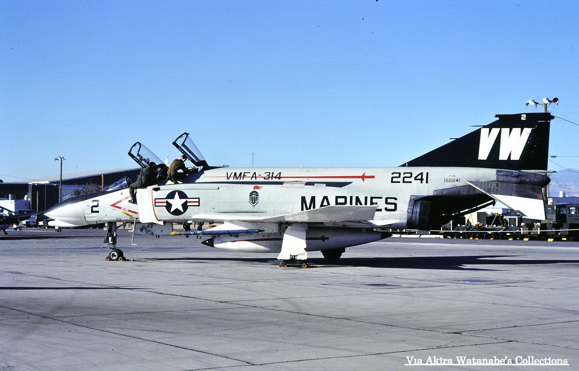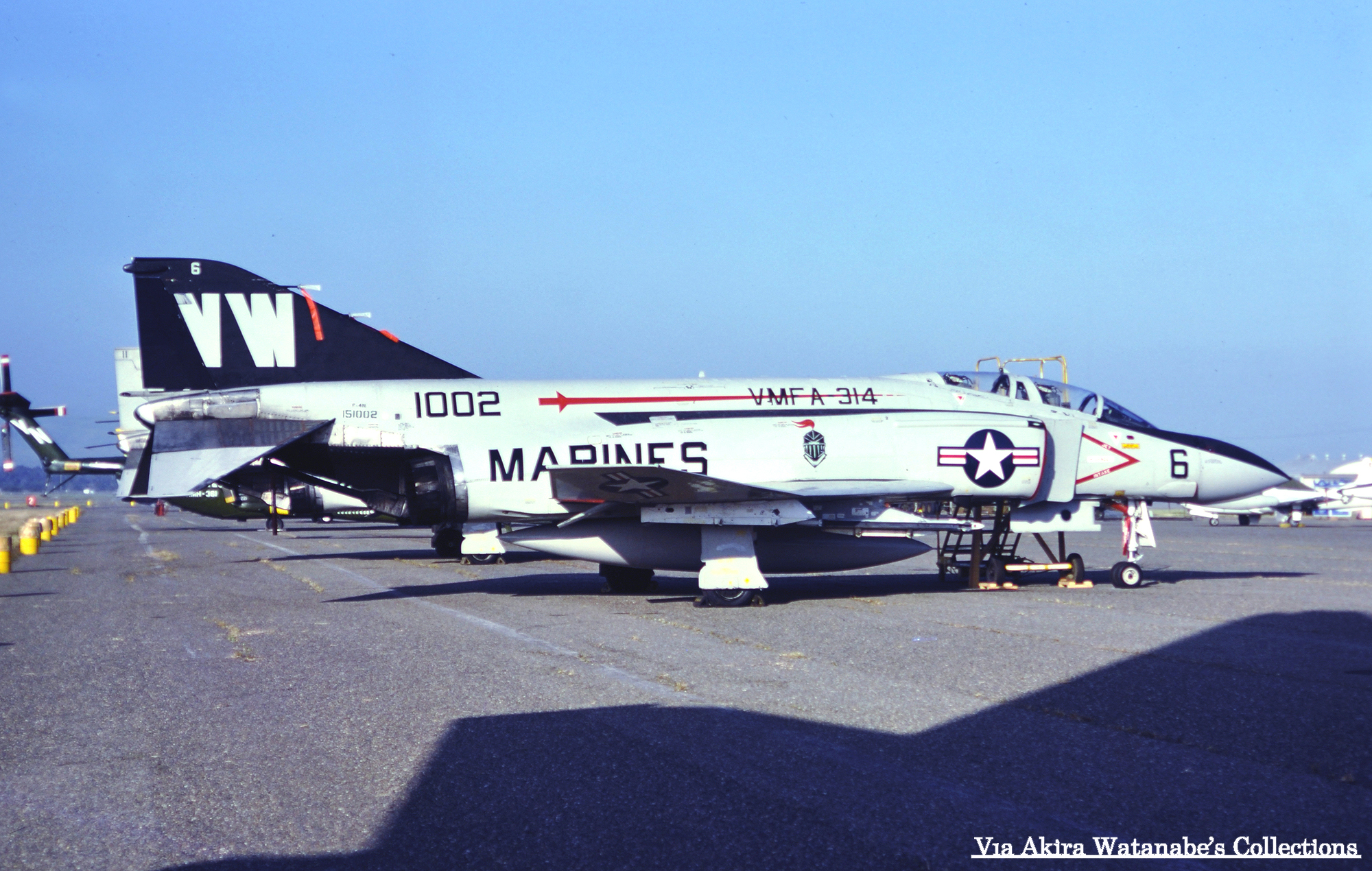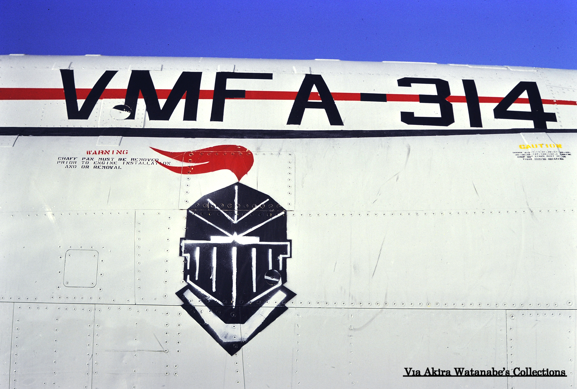 VMFA-314は1943年10月に創設された部隊で、MCASチェリー・ポイントでVMF-314としてF4-Uコルセアを受領、ミッドウェイ島に配備され、太平洋戦争末期の沖縄戦に参加している。太平洋戦争での戦果は14機の撃墜記録が残された。戦後は一時的に九州の航空基地に配備され、その後一度閉隊している。1952年フロリダでVMFA-314として再編されF-9Fパンサーに機種更新、1962年6月海兵隊で初めてF-4Bファントムを受領した部隊として有名である。翌年から早速ベトナム戦に駆り出され、ダ・ナン、チュ・ライを拠点に出撃を繰り返した。VMFA-314のF-4N時代は、尾翼を真っ黒に塗りこめ”VW"のレターを白で入れており、胴体にはナイトの矛を描いた実にシックな出で立ちであった。その後暫くは、MCASエルトロから日本に派遣されることは無く、雑誌で見掛けるだけの飛行隊であったが、1982年FA-18Aに転換してから岩国にも来る様になった。この飛行隊はFA-18Aに関しても、海兵隊で最初に機体を受領した部隊である。(2006年6月記)