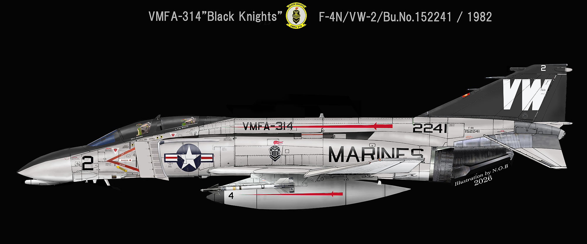 ↑ VMFA-314がF-4BからF-4Nに更新して1980年代初めまで使われたデザインで最も有名なものである。一つ上のイラストのデザインと異なるのはテールコードの文字だけでなく、コックピットのモヒカンの部分も違いである。F-4N/VW-2/Bu.No.152241