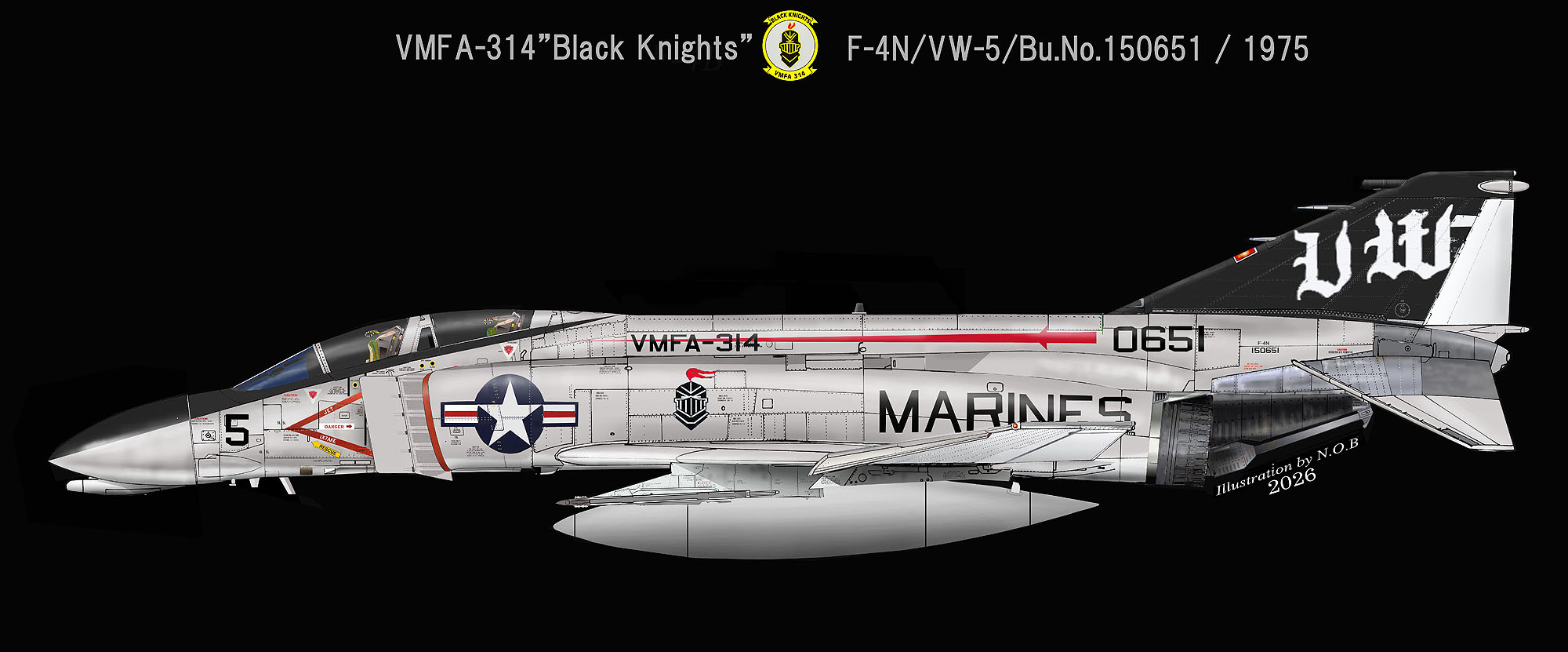 ↑ 同じく1975年12月に同地で撮影されたVMFA-314のF-4N/VW-2。海軍にはやはりナイツを部隊マークとして使用するVF-154ブラックナイツがあったが、ナイツのイメージは黑が強いのかもしれない。